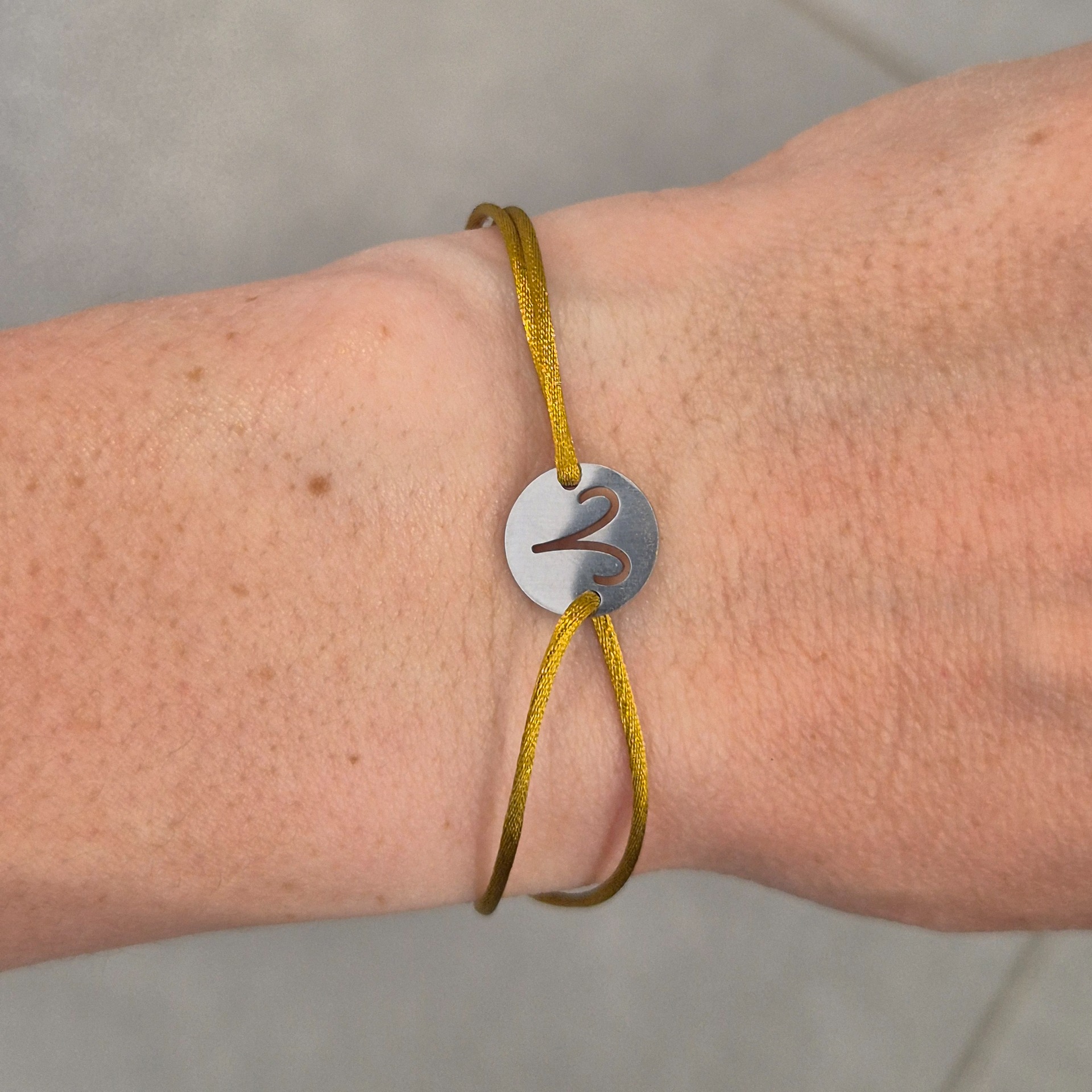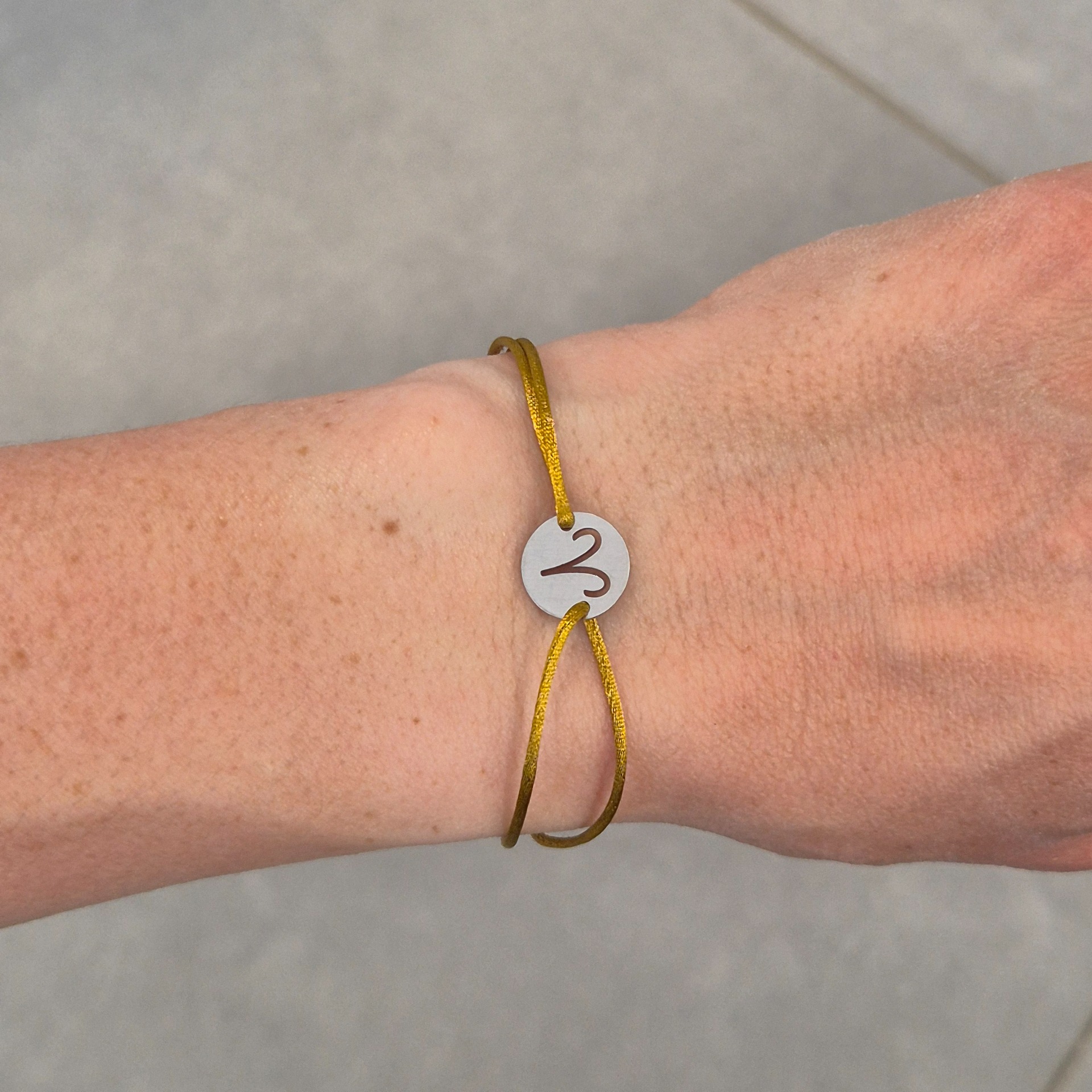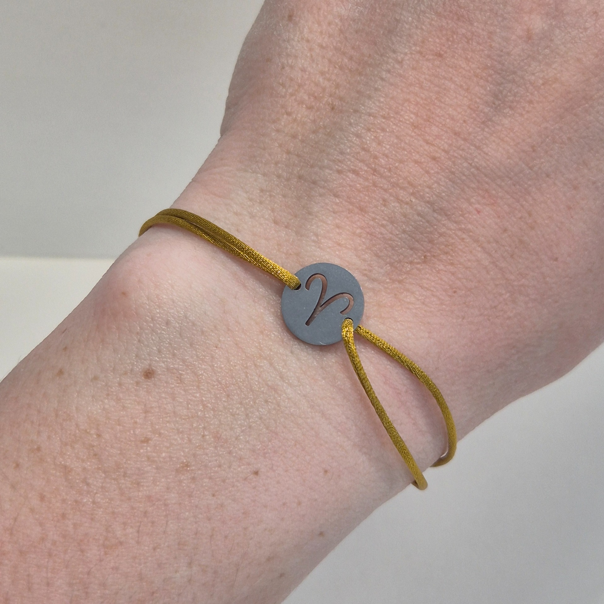 Náramek je tvořen na saténové polyesterové šňůrce, která je příjemná na nošení a díky posuvnému zapínání se přizpůsobí velikosti zápěstí.