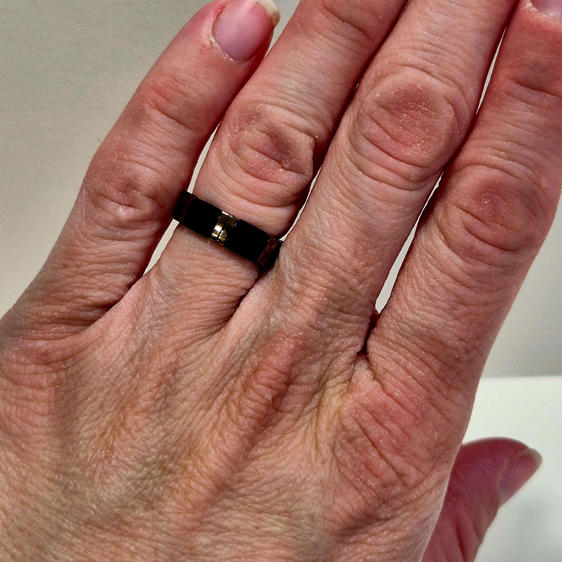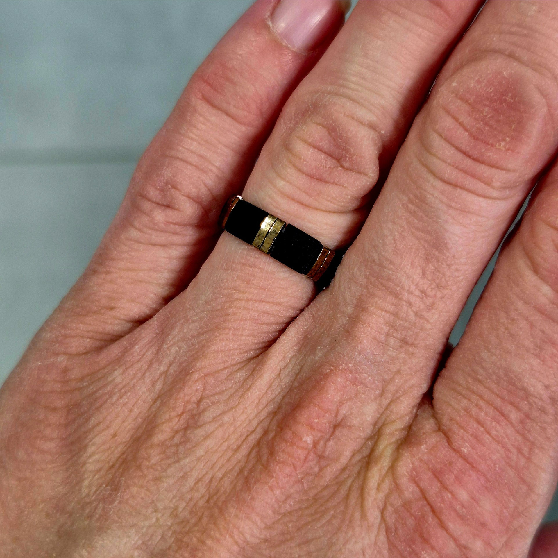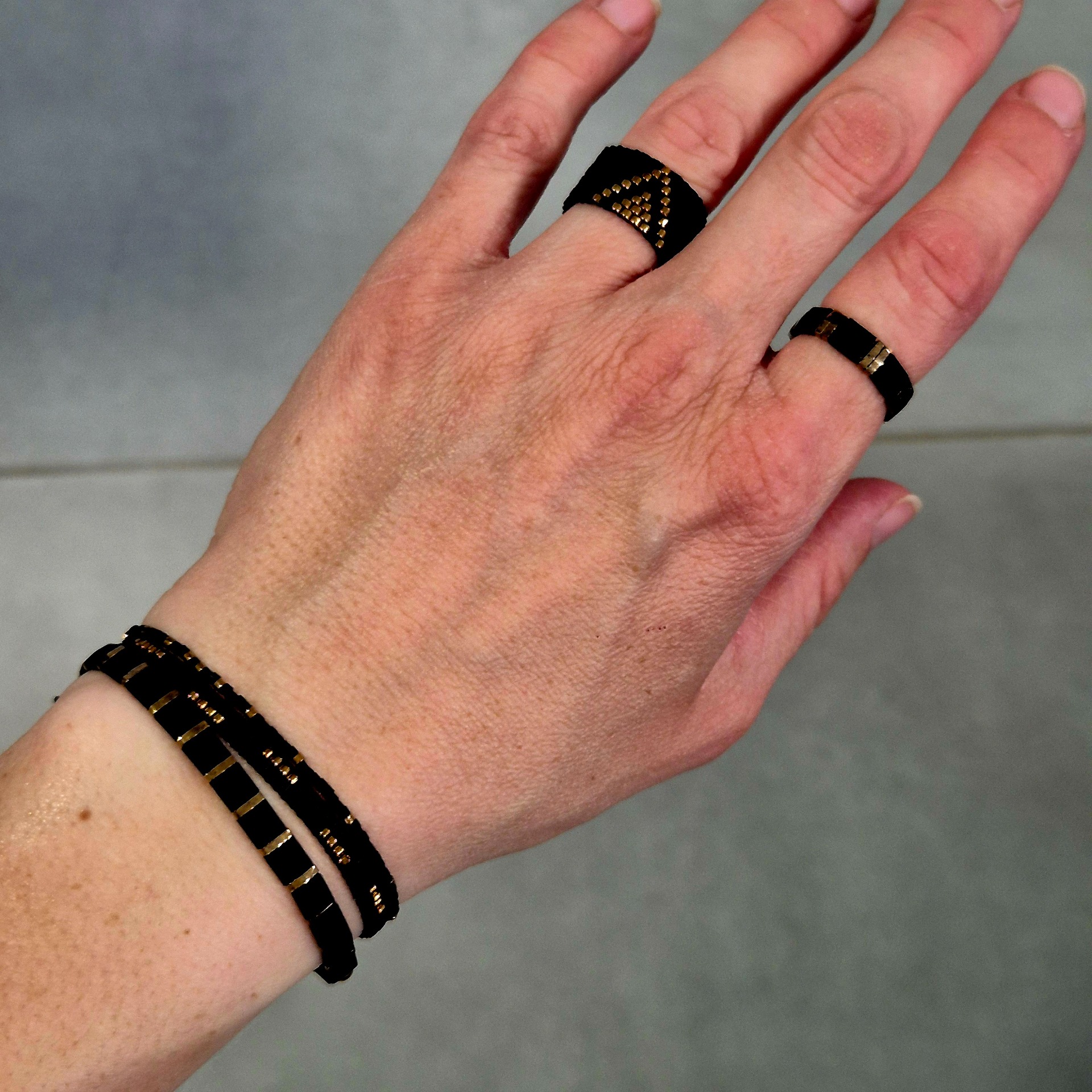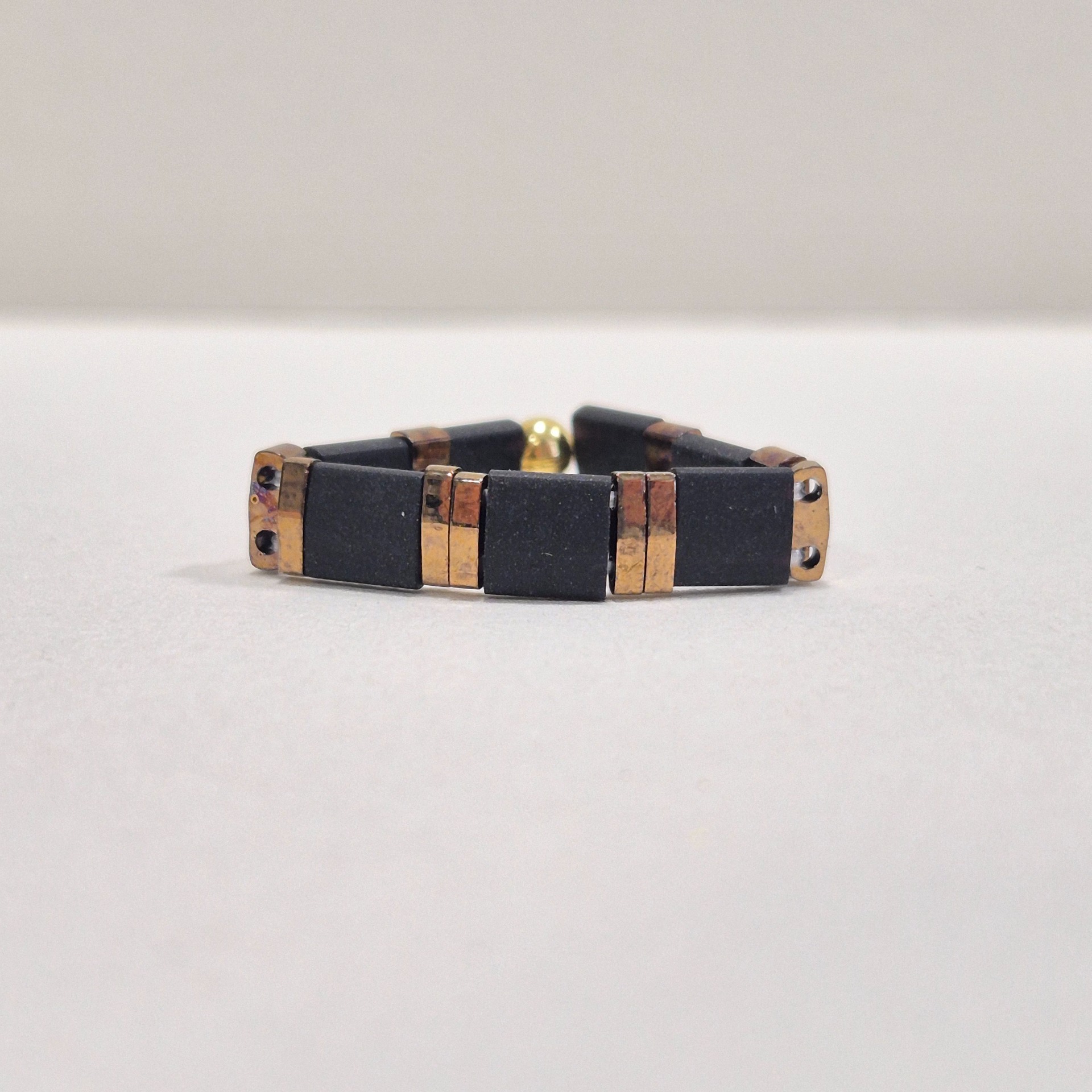 Minimalistický prstýnek z japonských Miyuki korálků v kombinaci matné černé a lesklé zlaté. Díky jednoduchému, ale výraznému kontrastu působí elegantně a nadčasově – ideální pro každodenní nošení i jako jemný doplněk ke slavnostnějším outfitům.