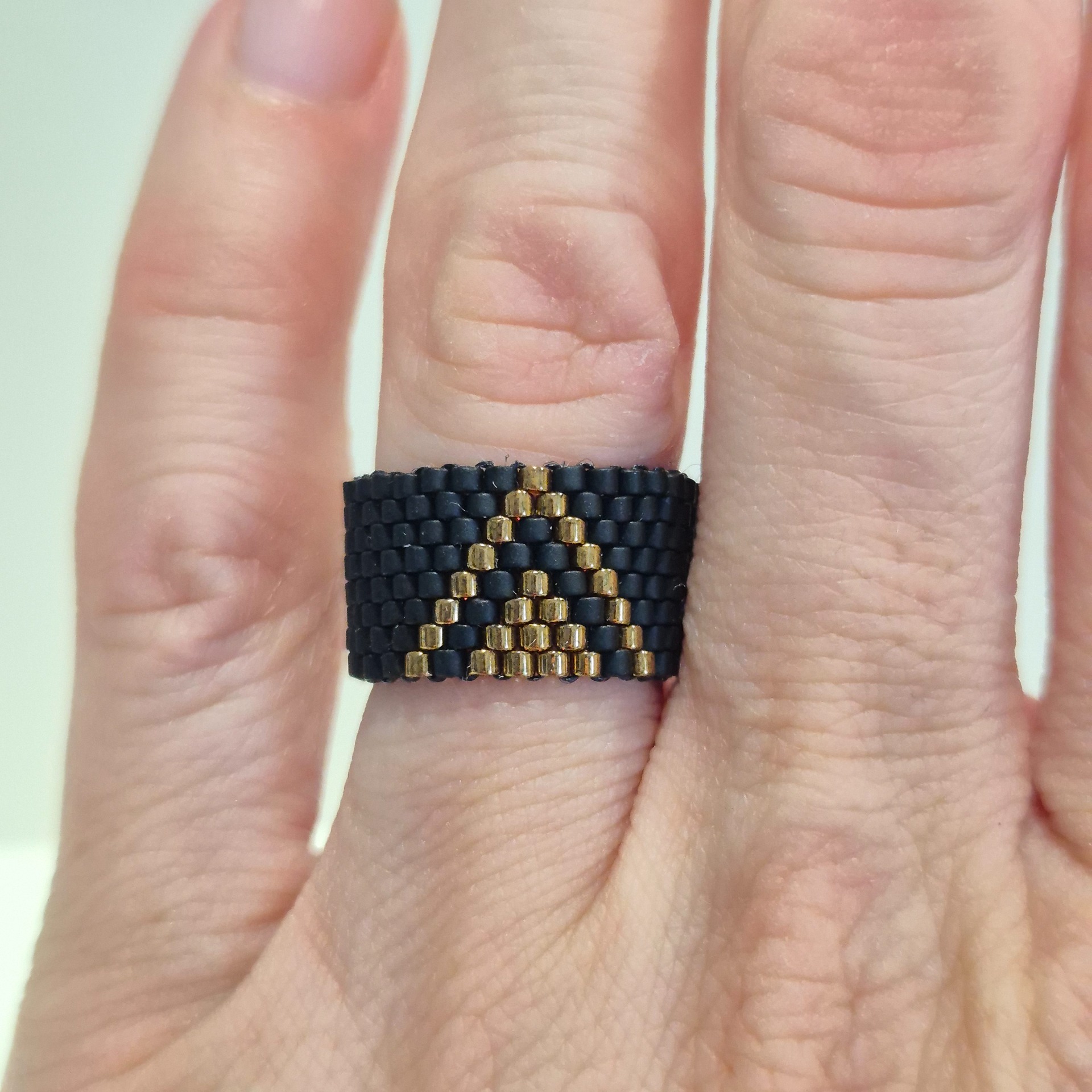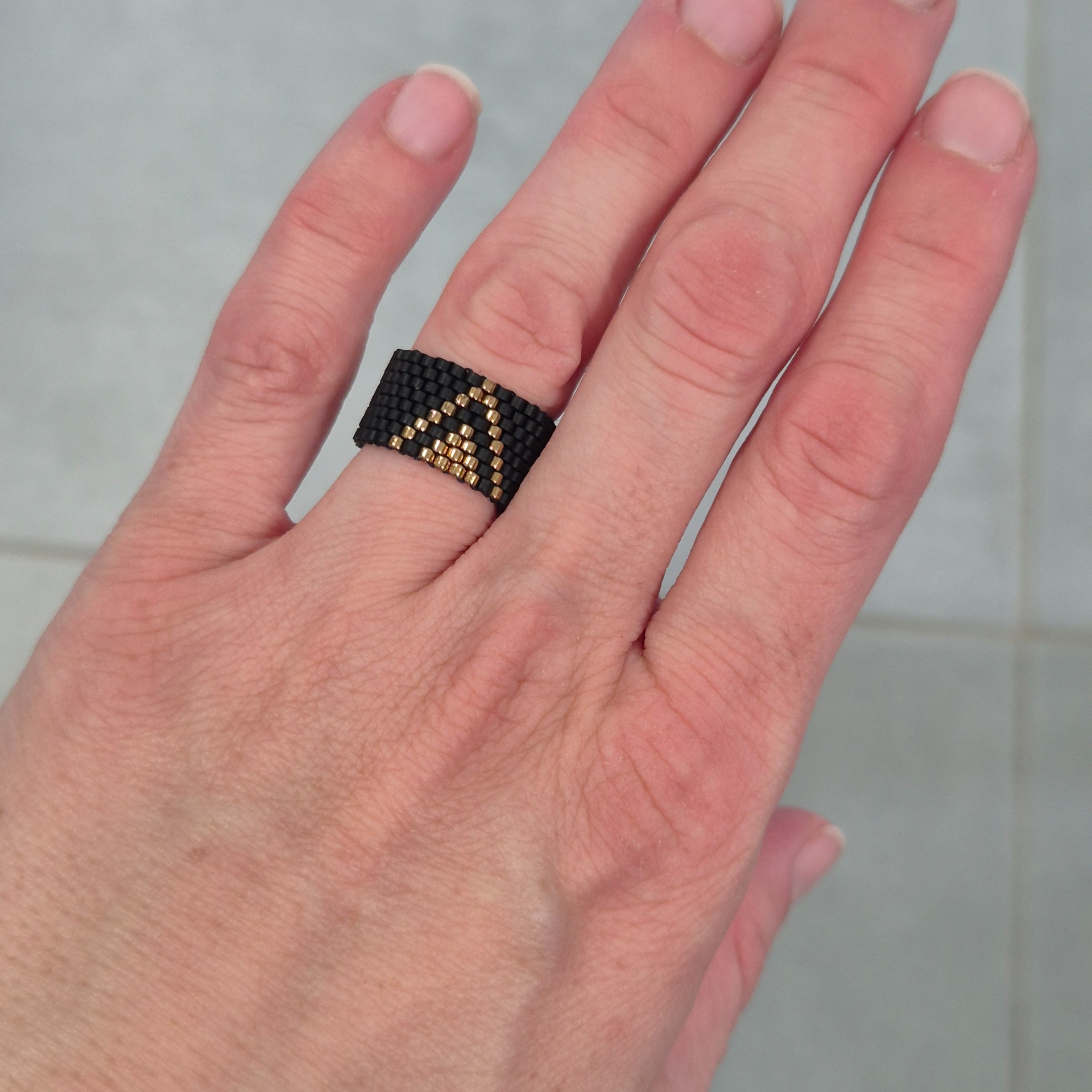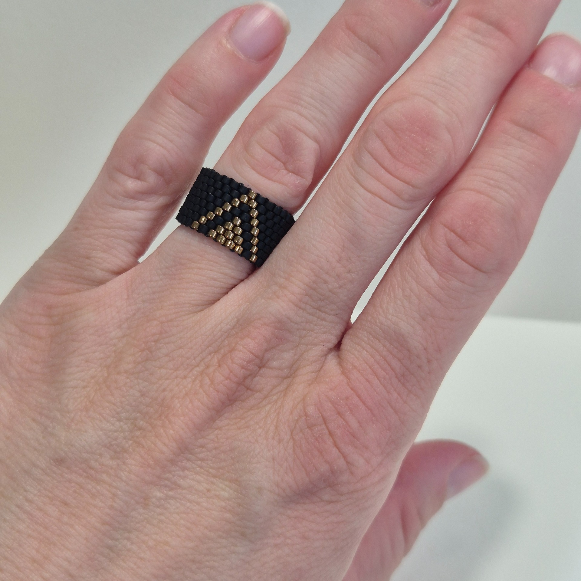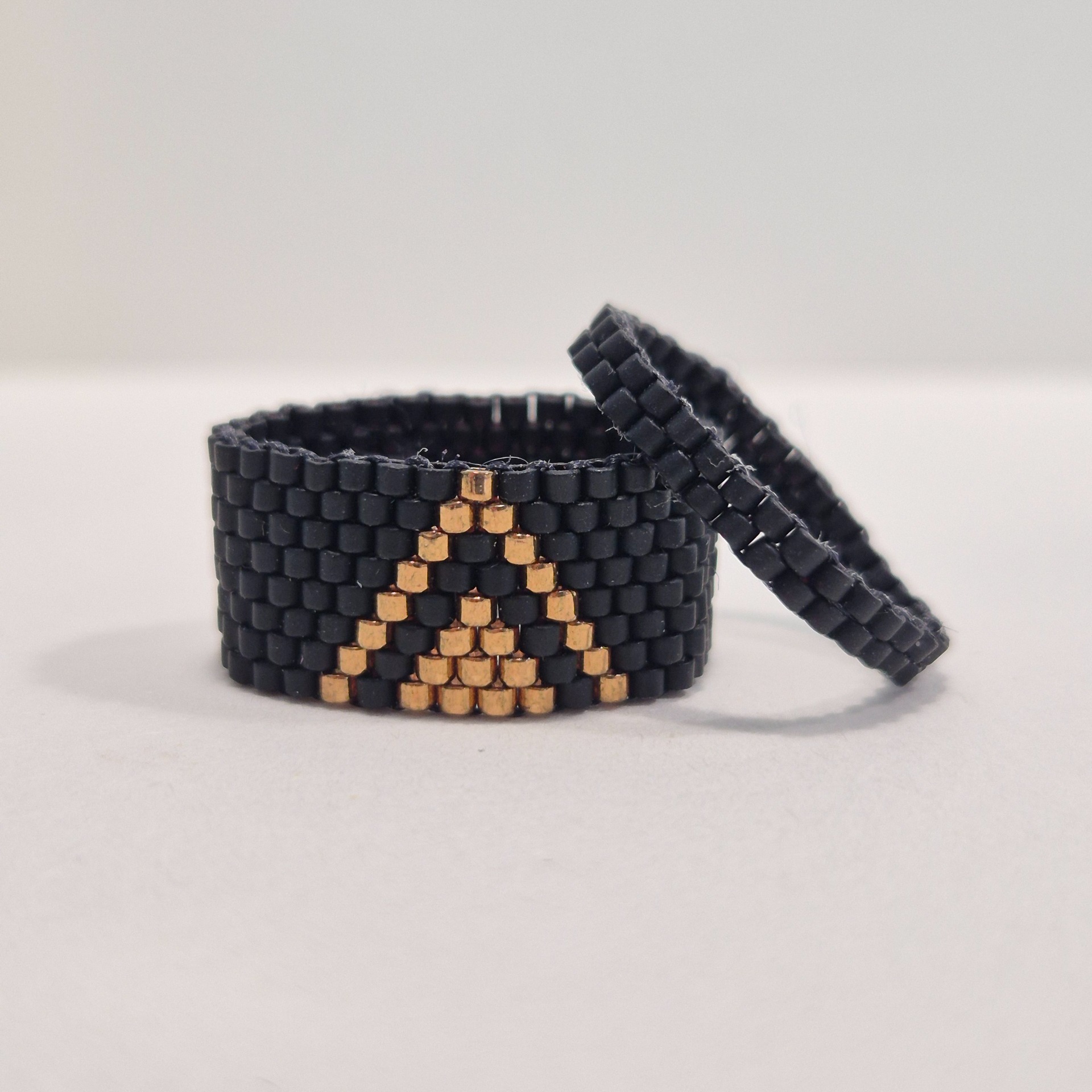 Ručně šitý prstýnek z japonských Miyuki korálků v kombinaci matné černé a lesklé zlaté. Šířka 8 řad vytváří výrazný a nepřehlédnutelný šperk, který na ruce okamžitě upoutá pozornost.