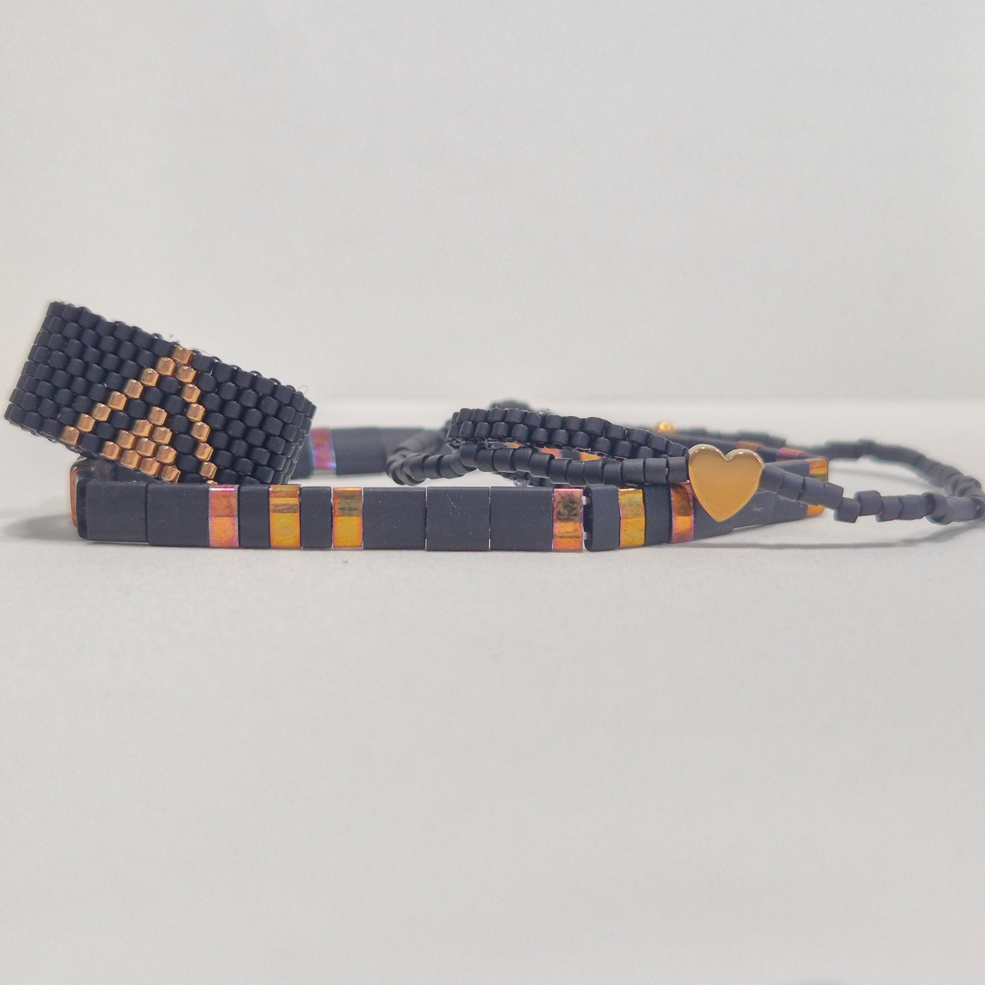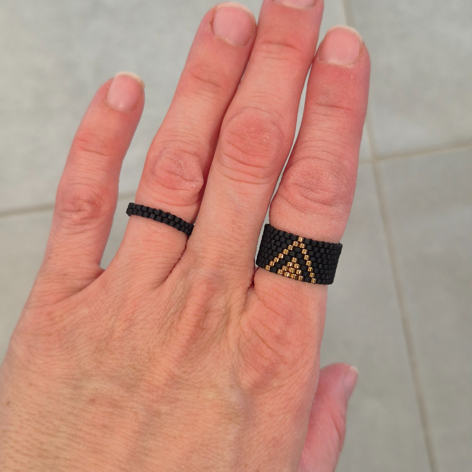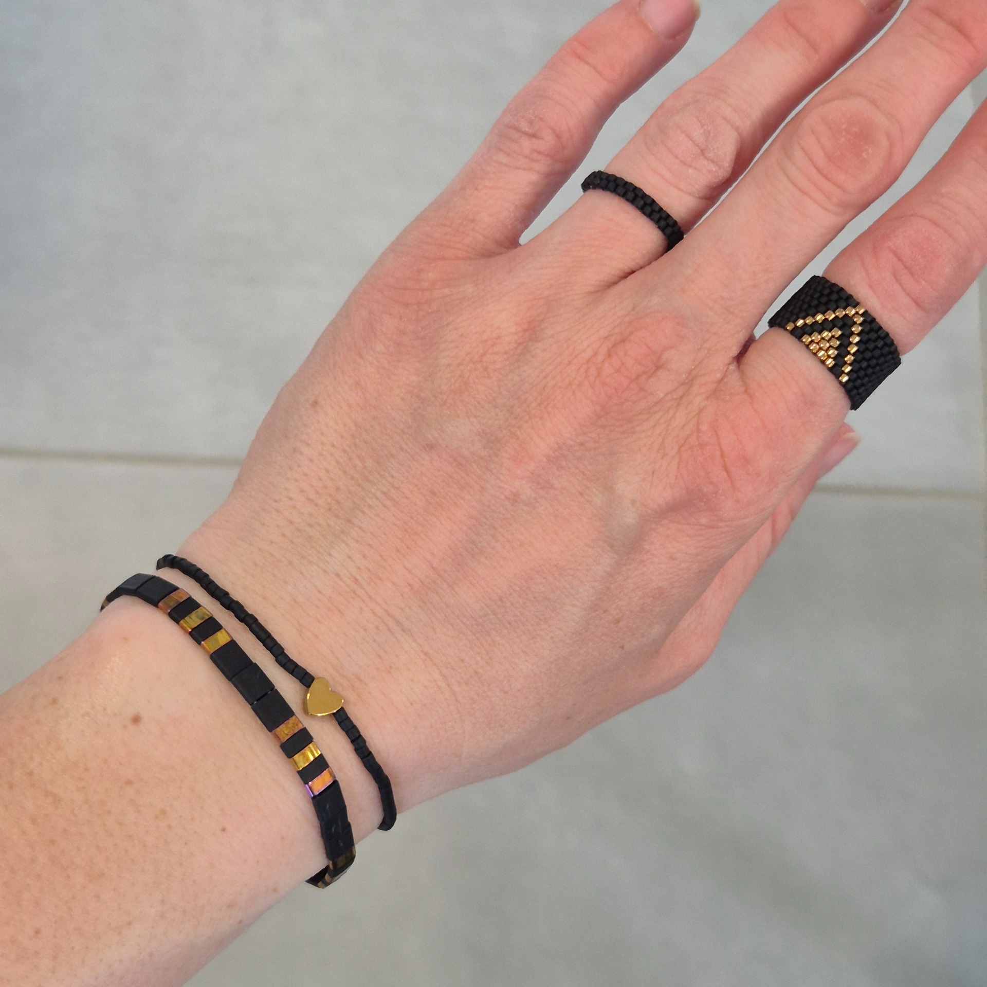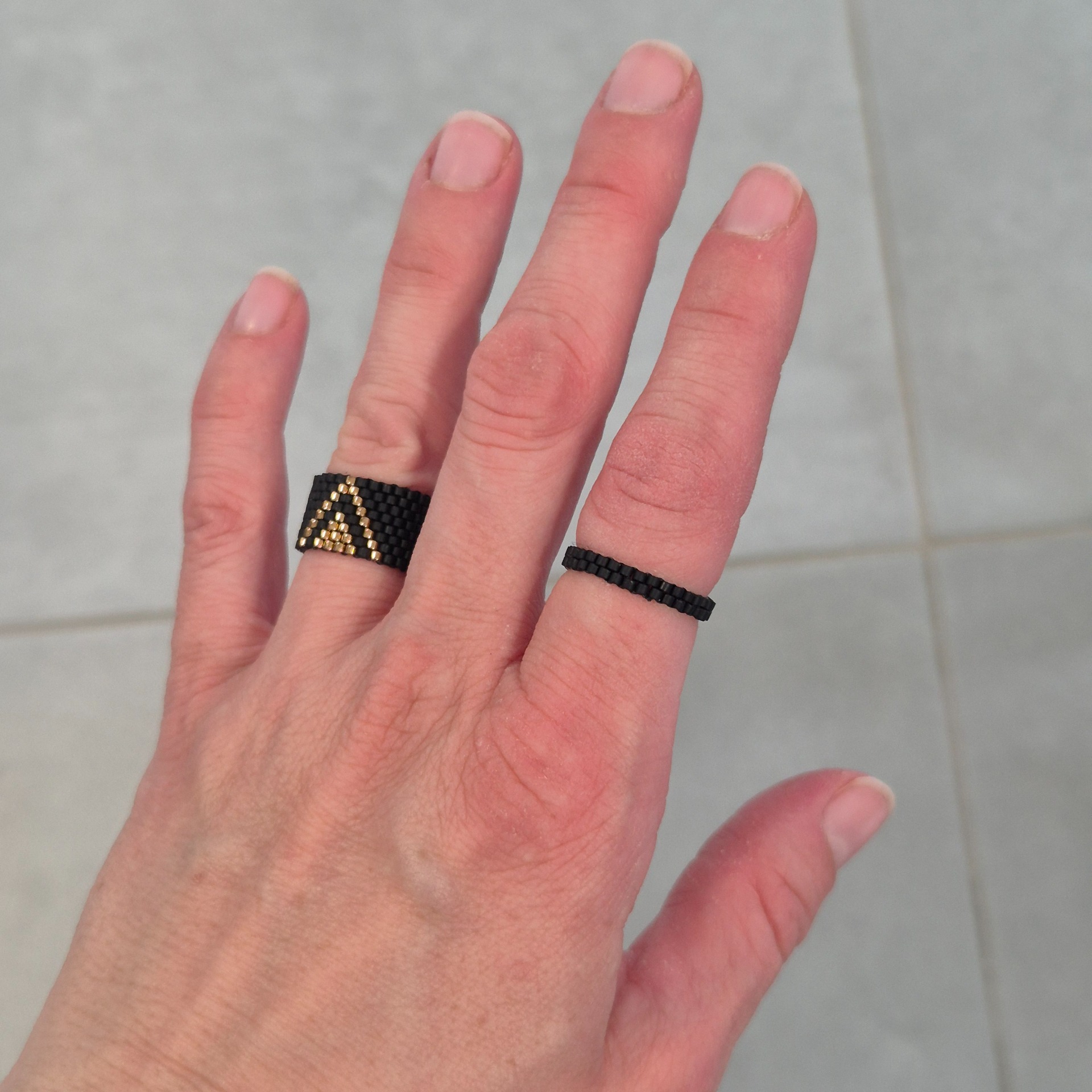Ručně šitý prstýnek z japonských Miyuki korálků v kombinaci matné černé a lesklé zlaté. Šířka 8 řad vytváří výrazný a nepřehlédnutelný šperk, který na ruce okamžitě upoutá pozornost.