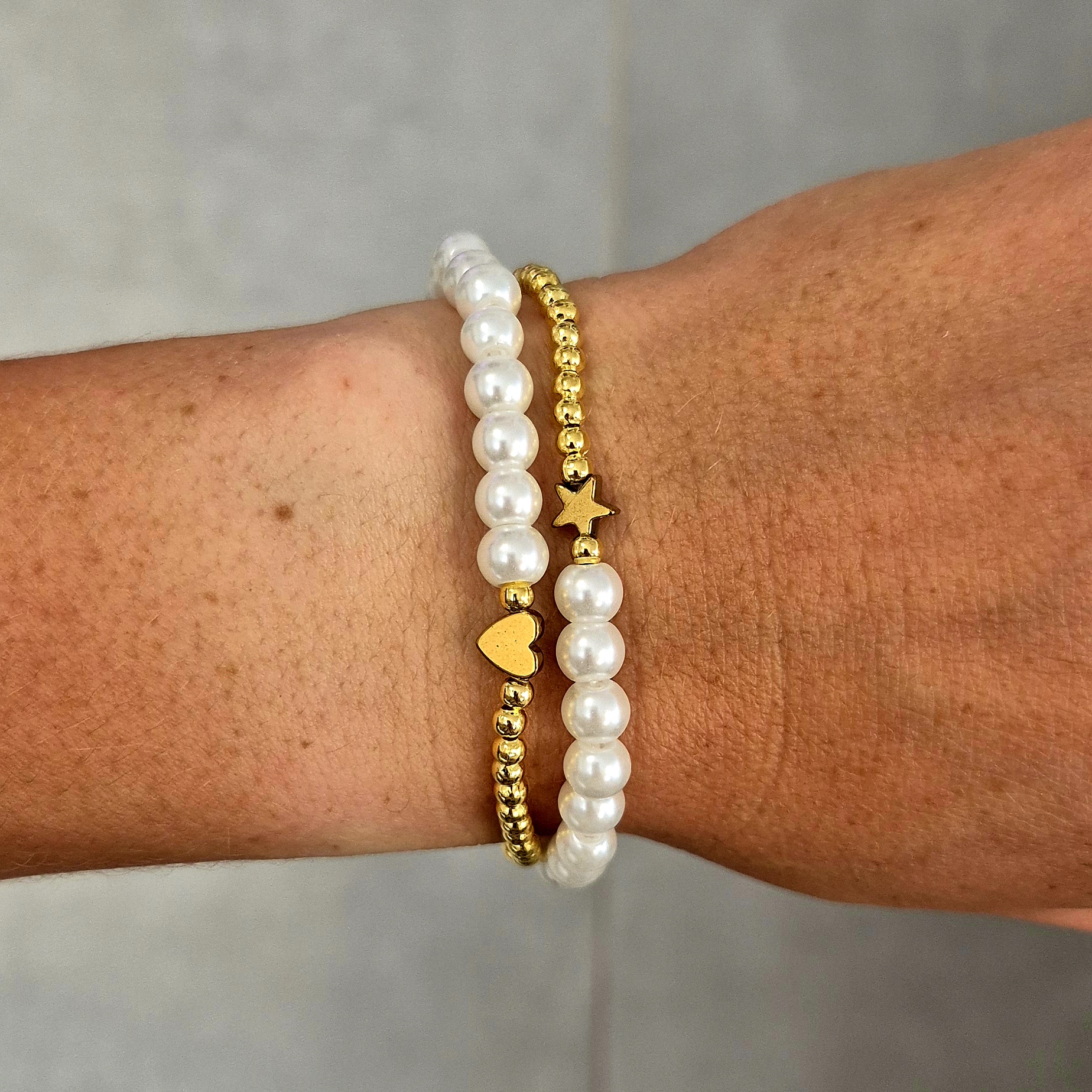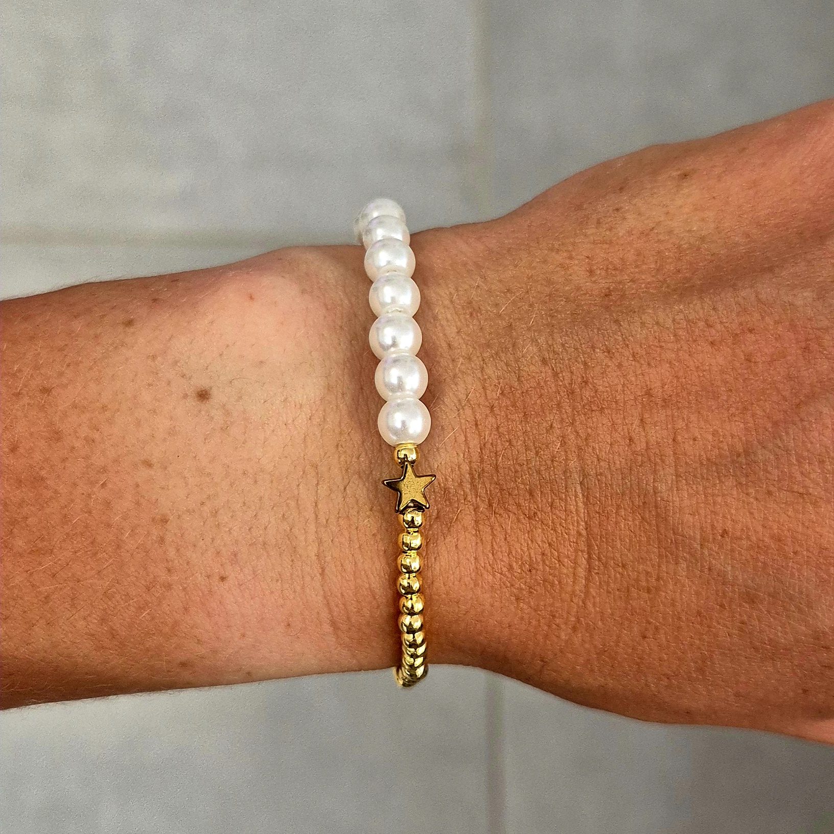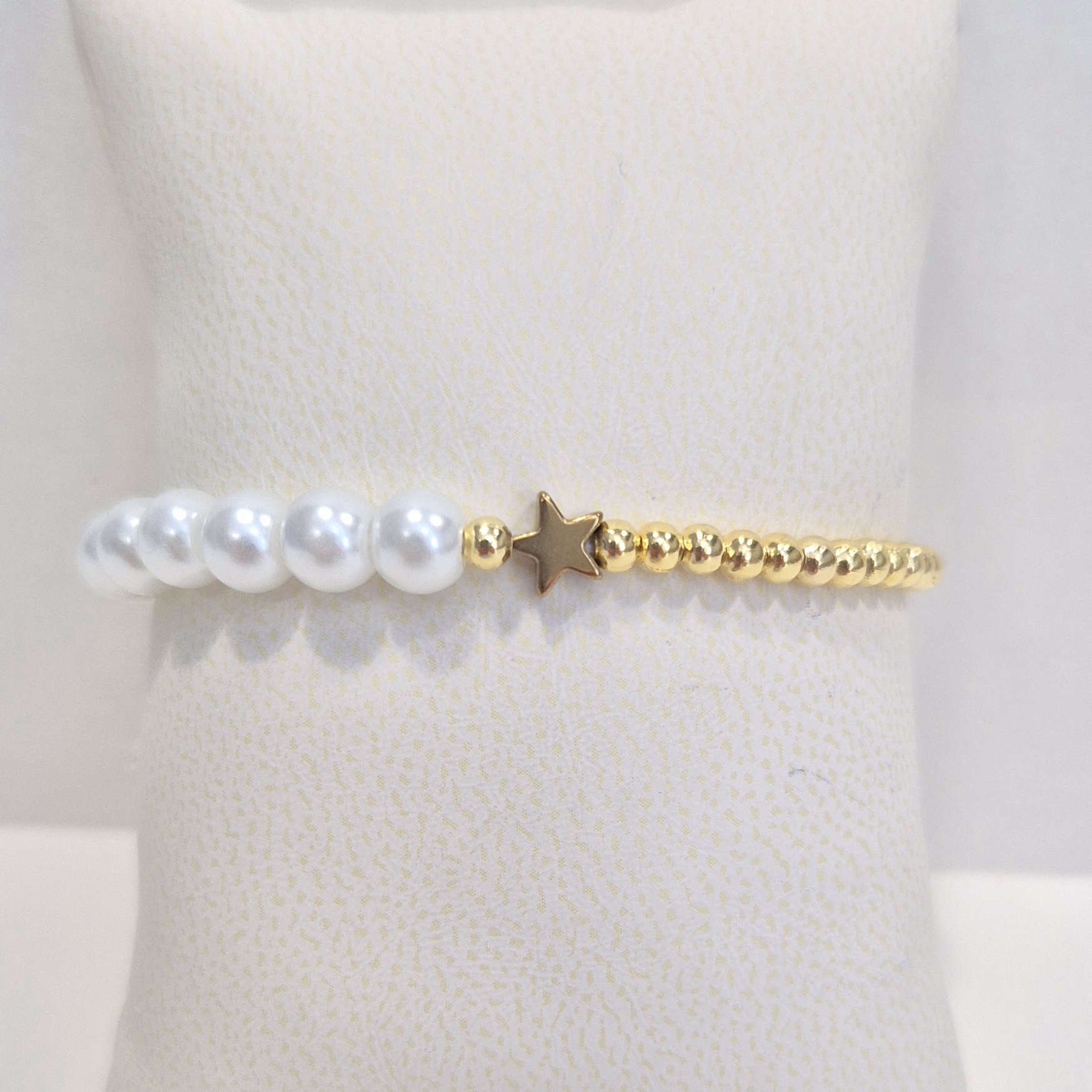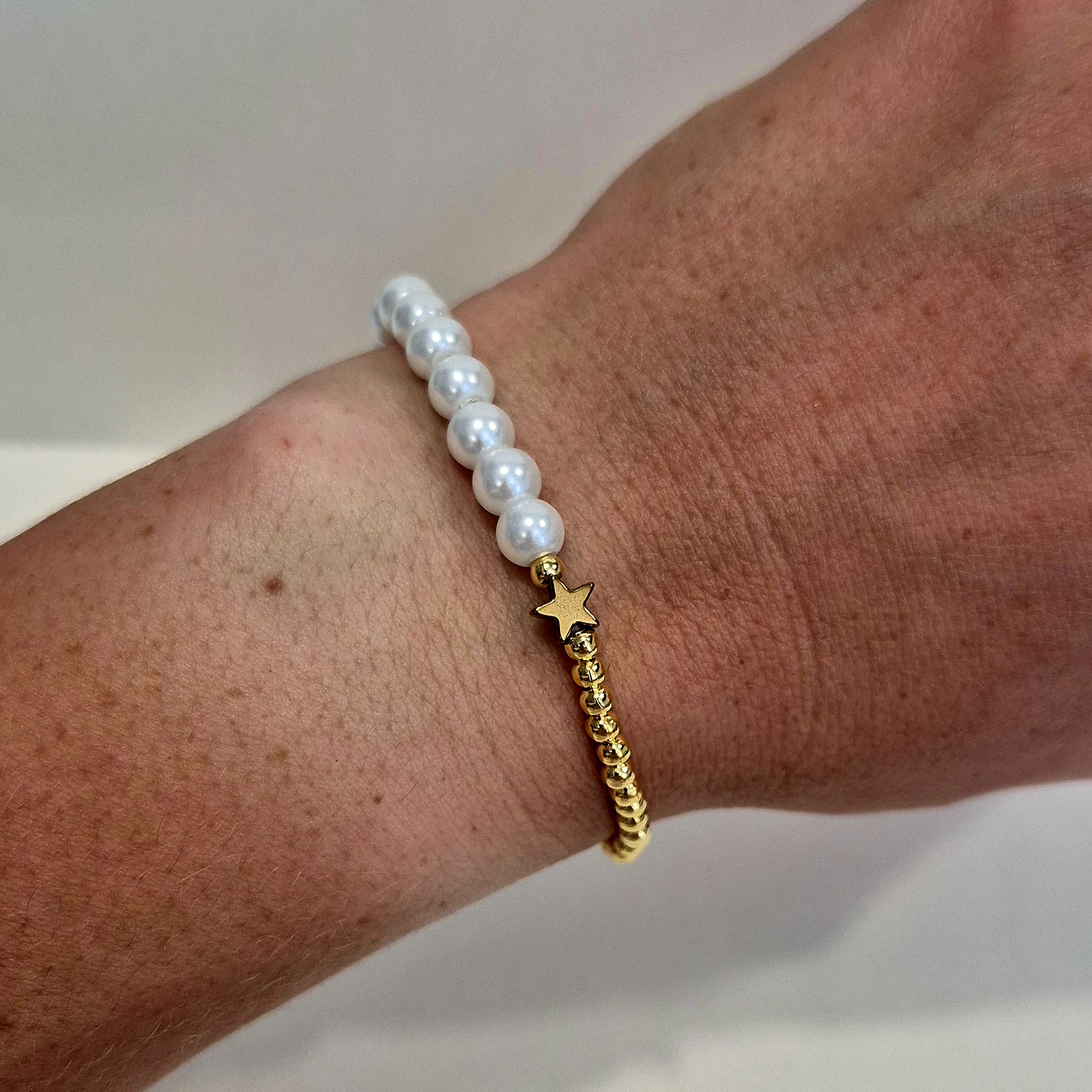 Elegantní náramek navlečený na gumičce, který kombinuje jemné korálky v imitaci perel a zlaté korálky z bižuterního kovu.