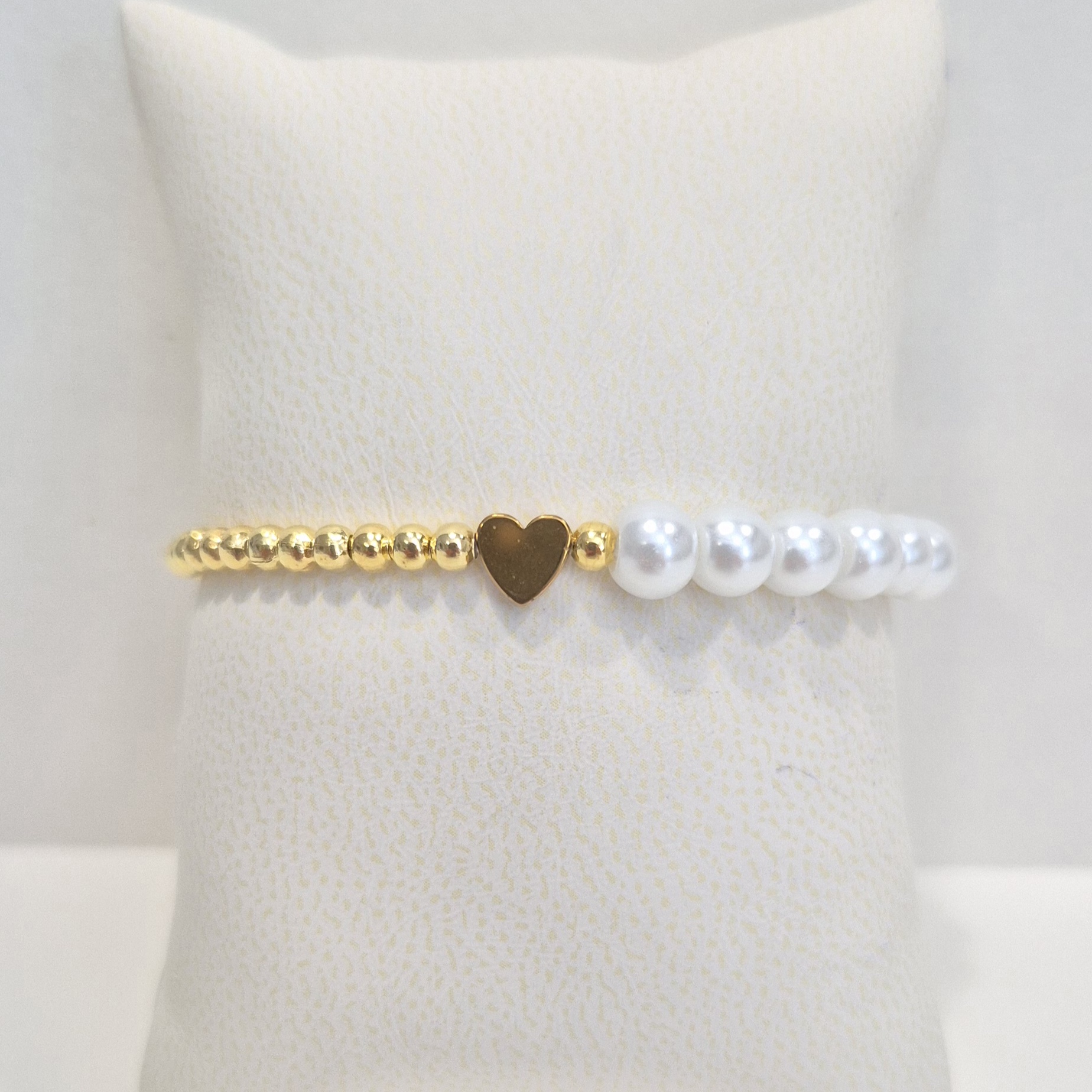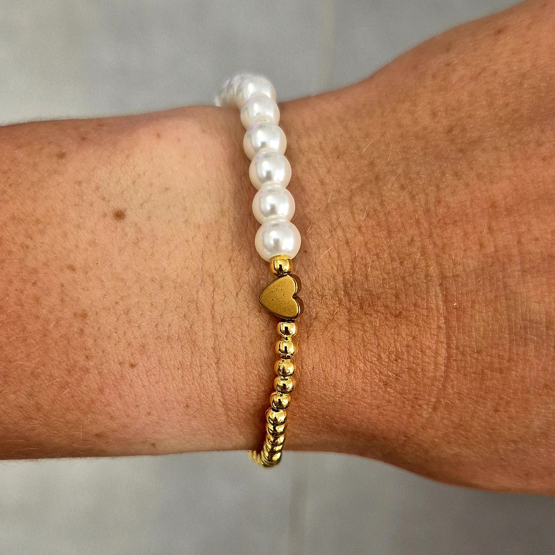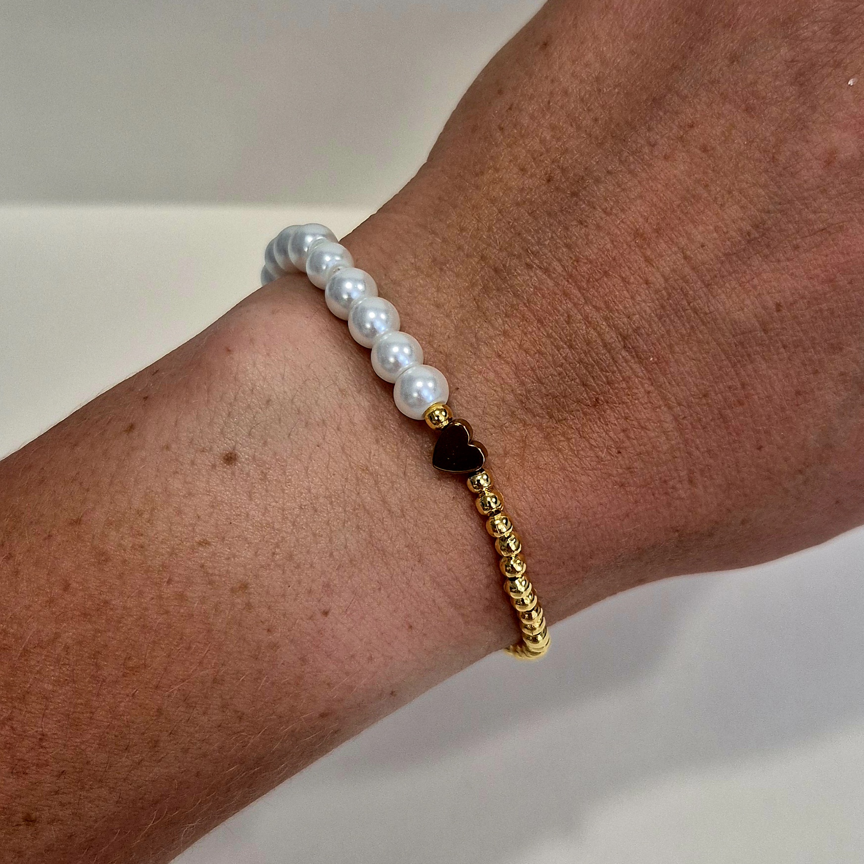 Elegantní náramek navlečený na gumičce, který kombinuje jemné korálky v imitaci perel a zlaté korálky z bižuterního kovu.