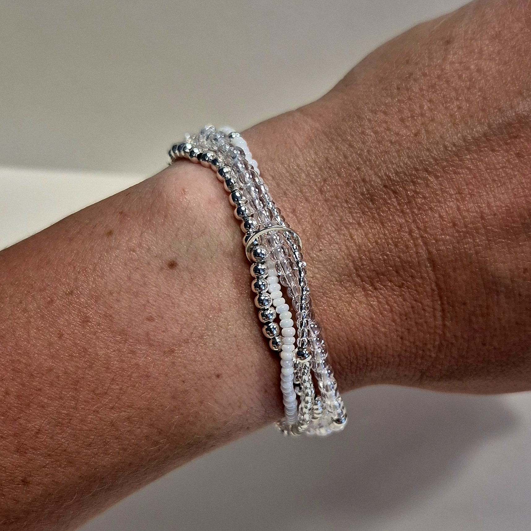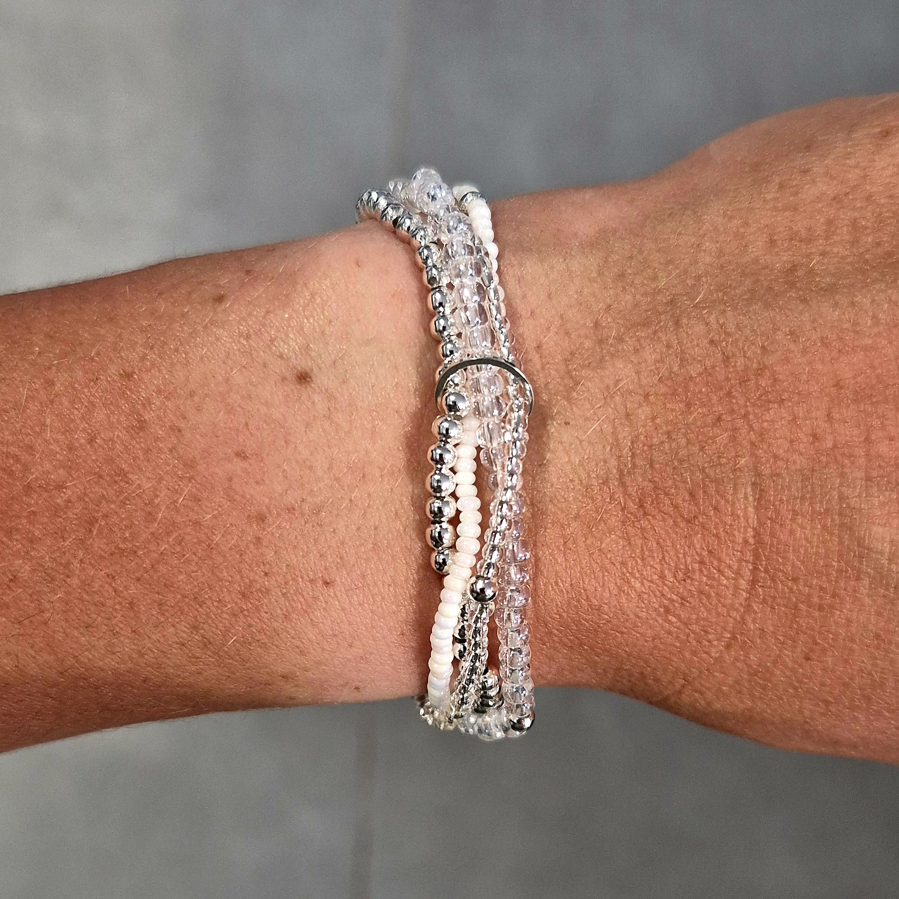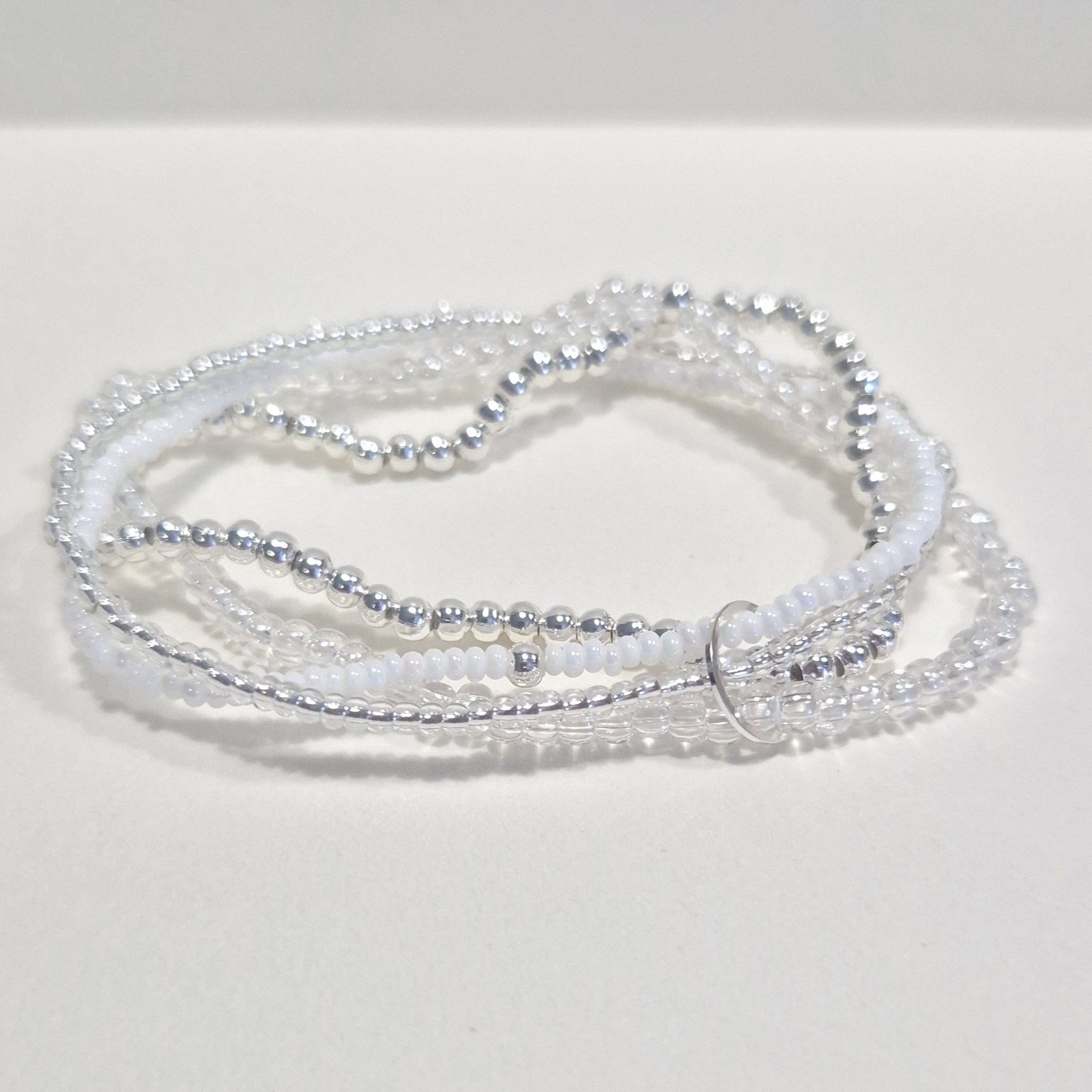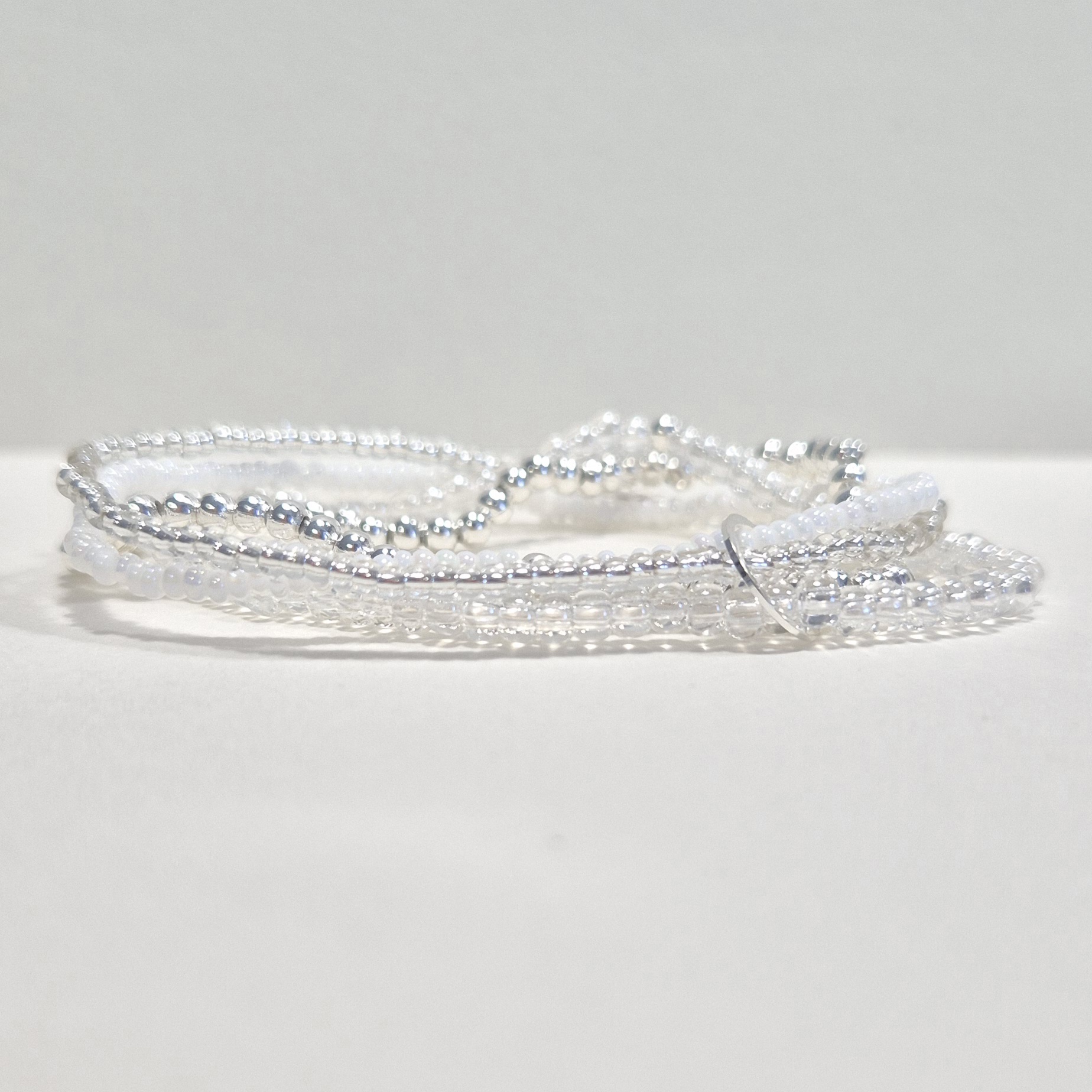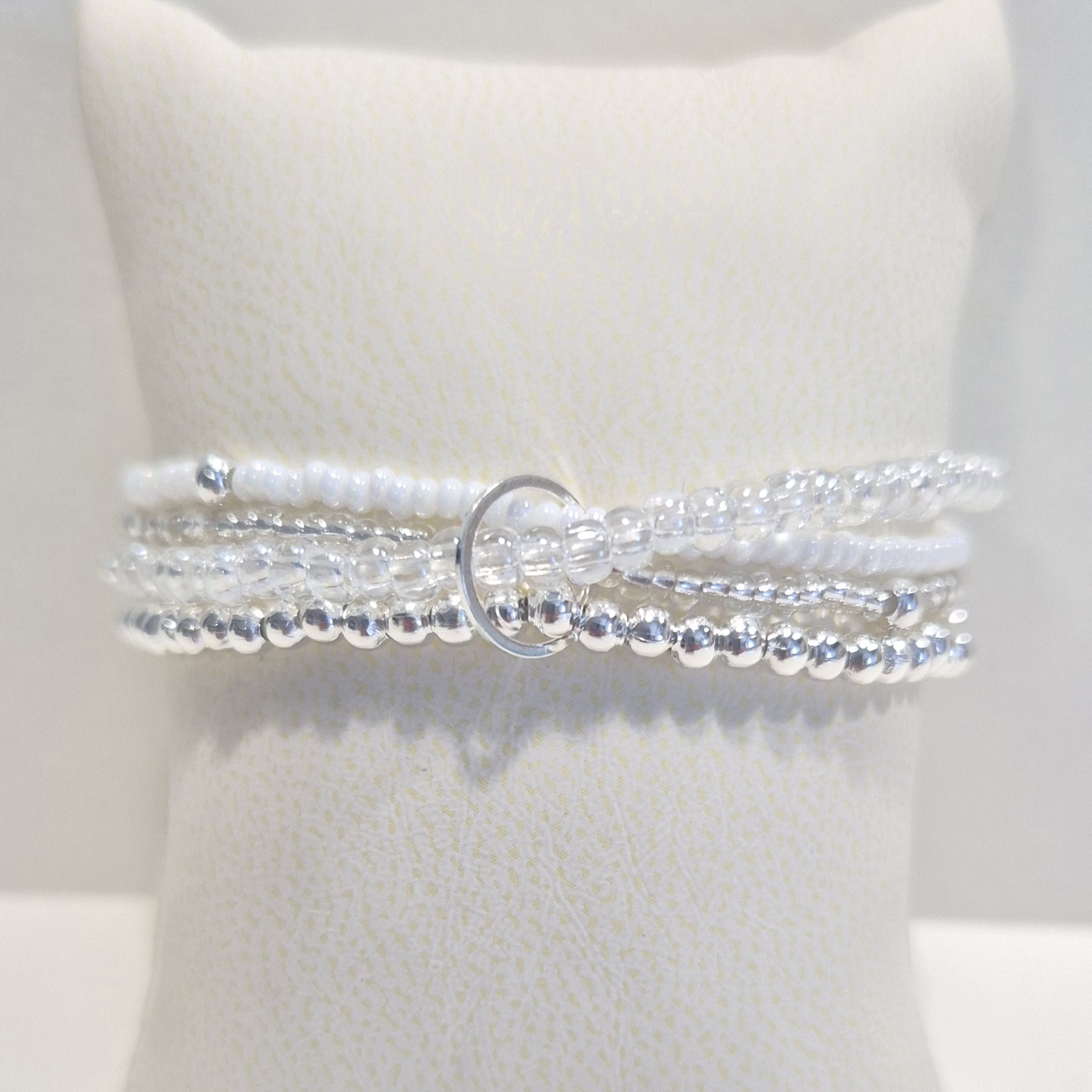 Tento elegantní set obsahuje čtyři jemné náramky, které jsou vzájemně propojené kroužkem z mosazi. Díky tomu působí jako jeden celek, ale přitom si zachovávají lehkost a vzdušnost.