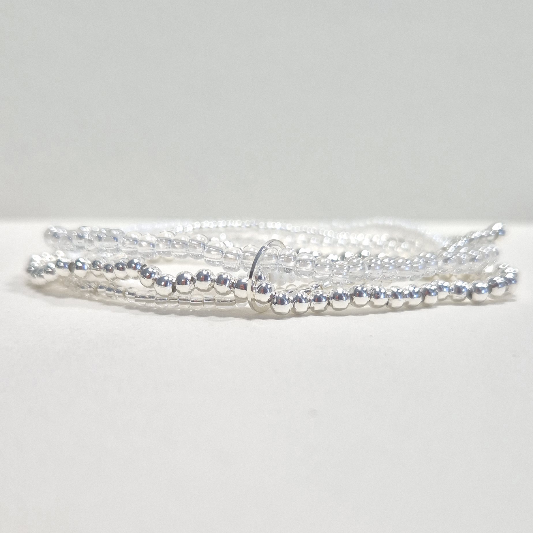 Použité materiály: skleněné korálky, bižuterní kov, gumička, mosaz.