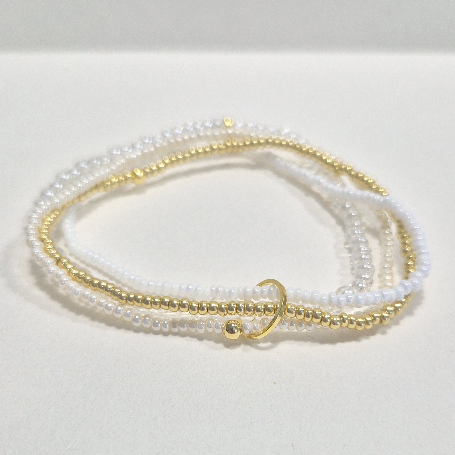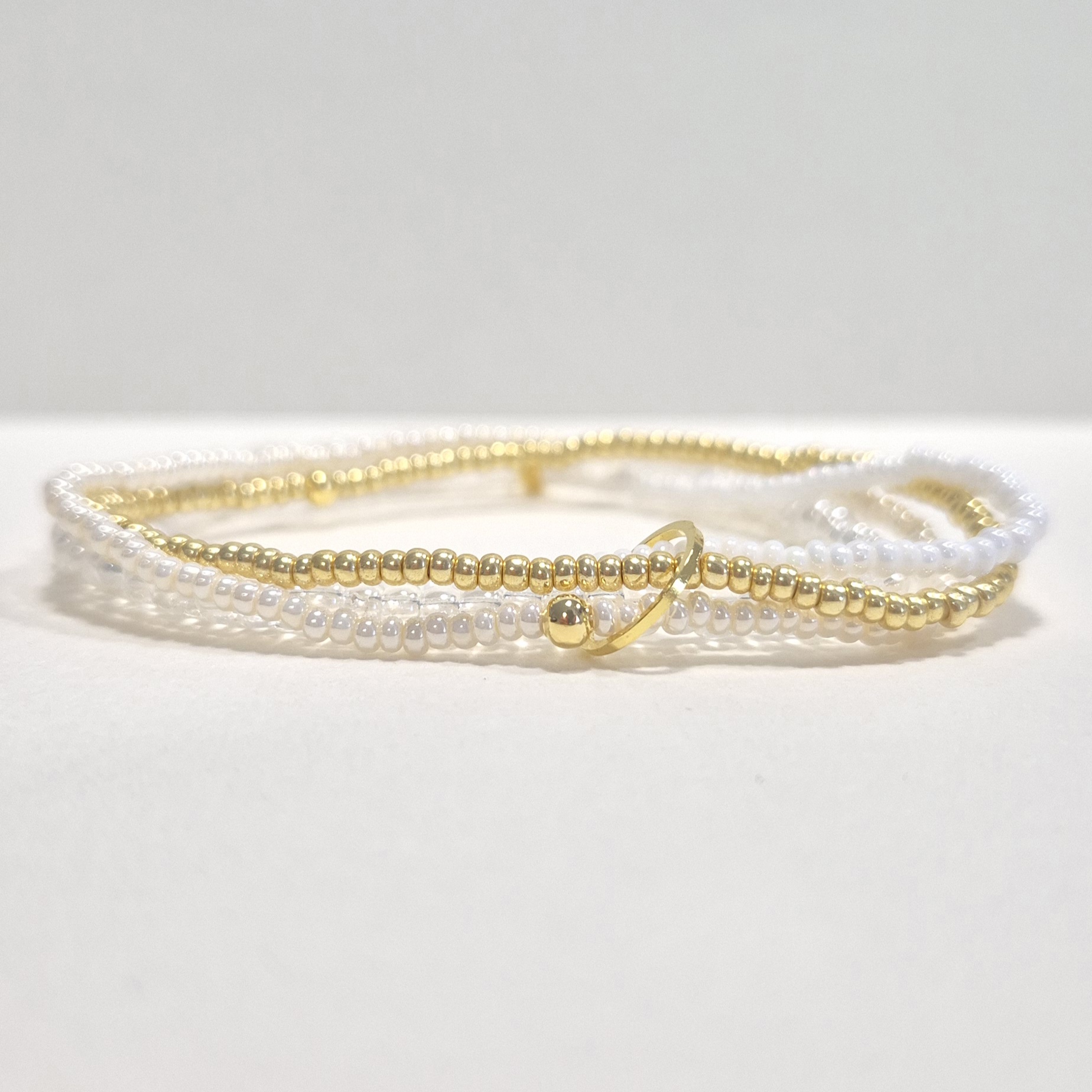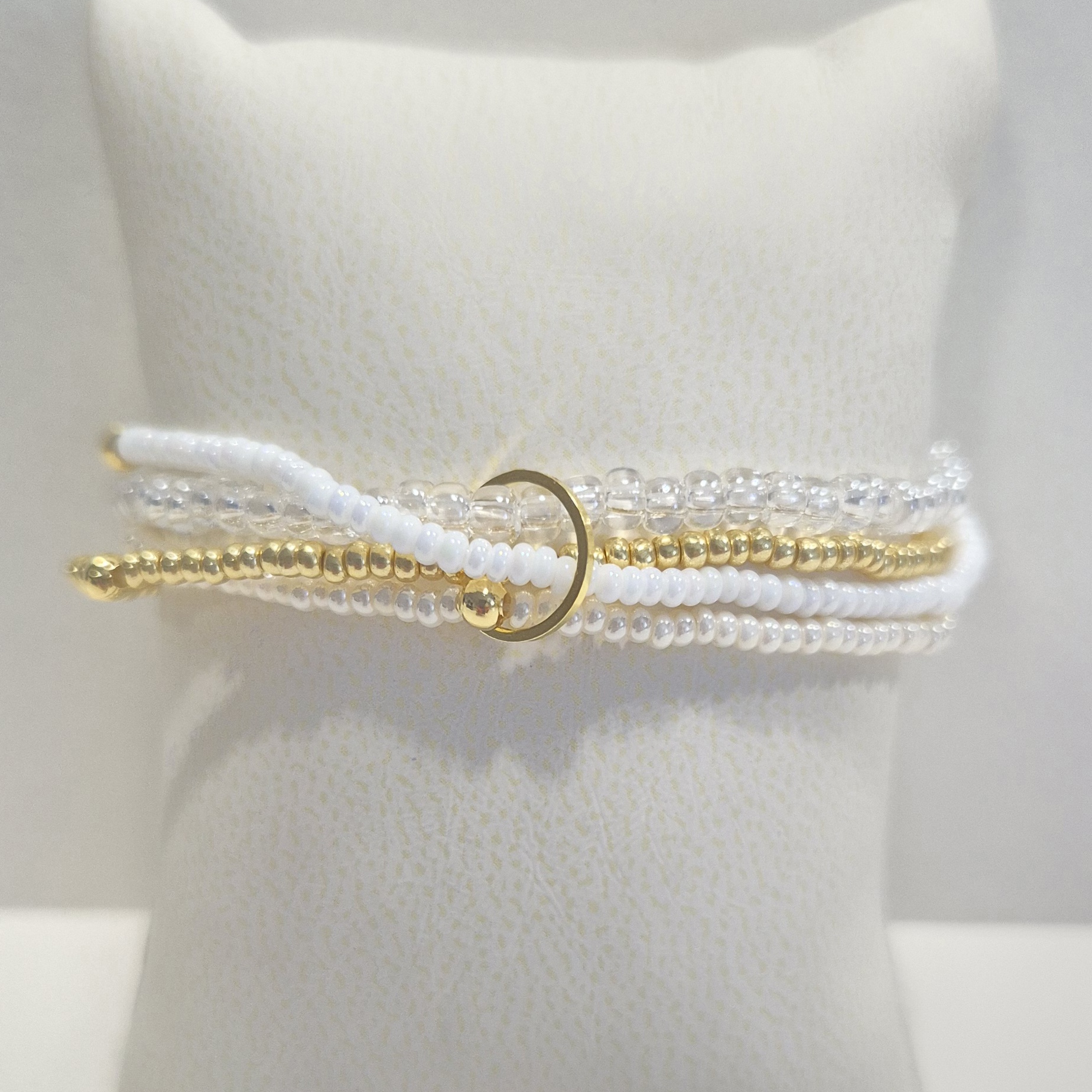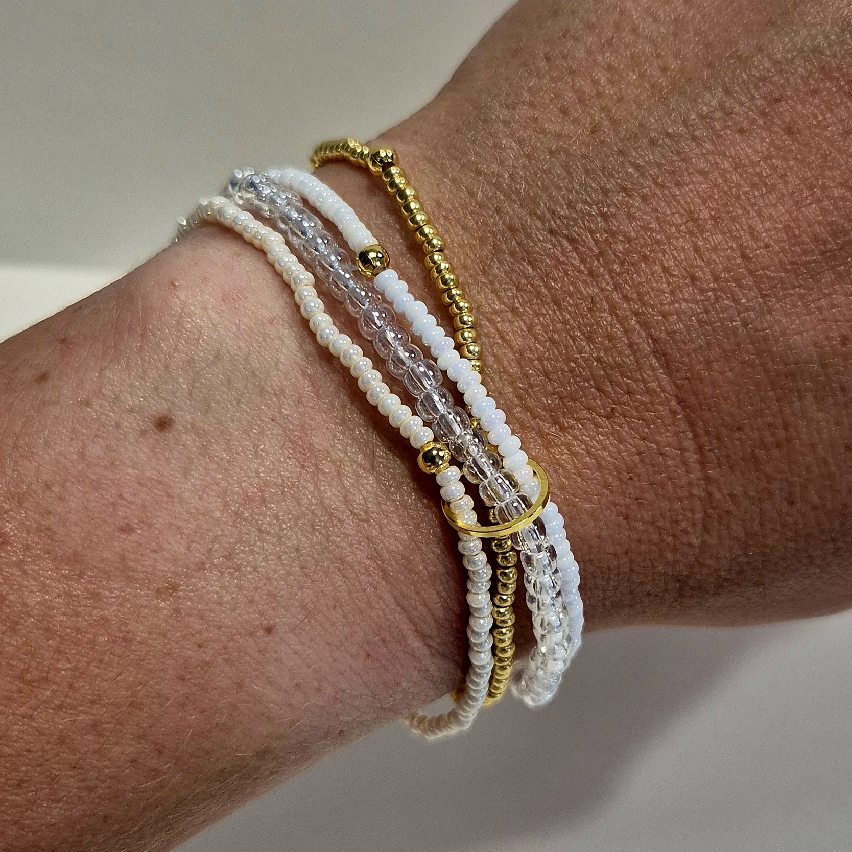 Tento elegantní set obsahuje čtyři jemné náramky, které jsou vzájemně propojené kroužkem z mosazi. Díky tomu působí jako jeden celek, ale přitom si zachovávají lehkost a vzdušnost.