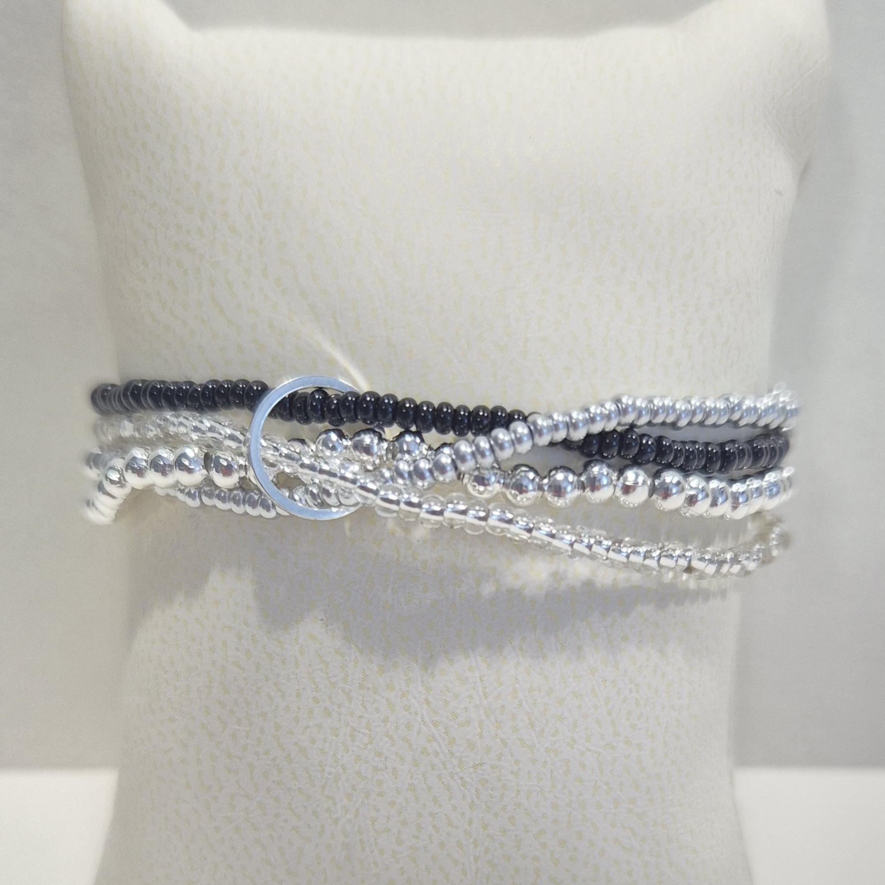 Tento elegantní set obsahuje čtyři jemné náramky, které jsou vzájemně propojené kroužkem z mosazi. Díky tomu působí jako jeden celek, ale přitom si zachovávají lehkost a vzdušnost.
