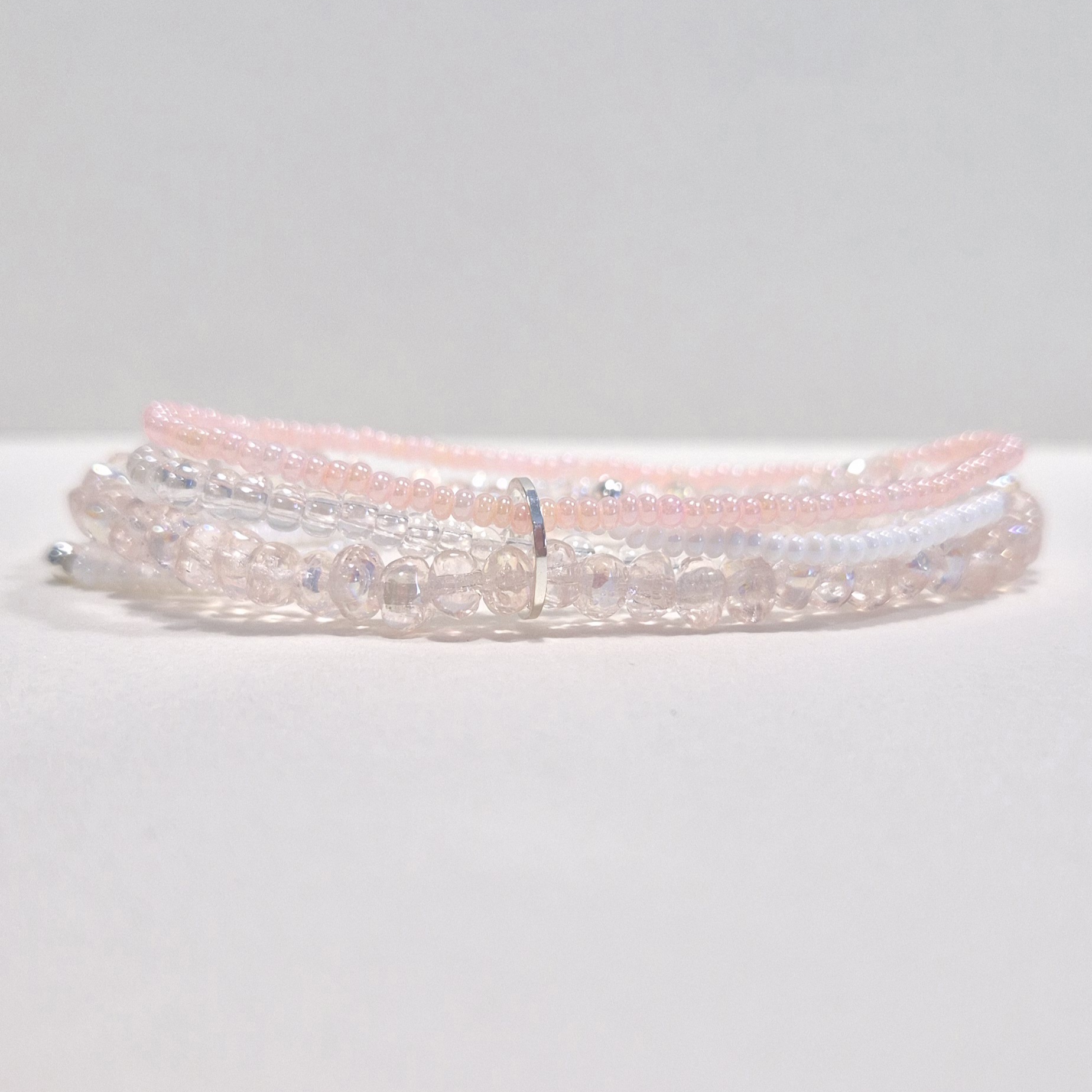 Tento elegantní set obsahuje čtyři jemné náramky, které jsou vzájemně propojené kroužkem z mosazi. Díky tomu působí jako jeden celek, ale přitom si zachovávají lehkost a vzdušnost.