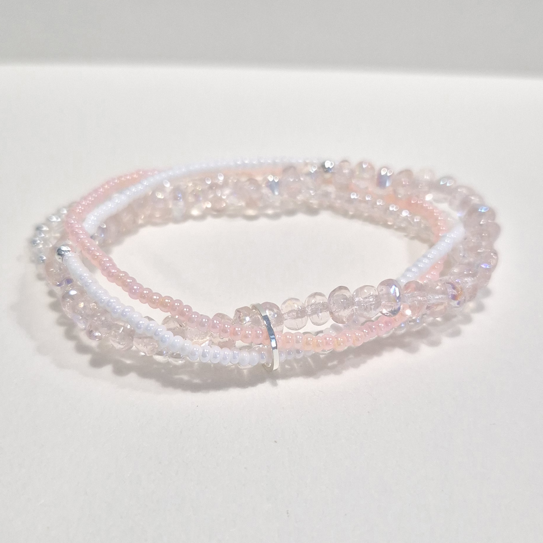 Použité materiály: skleněné korálky, bižuterní kov, gumička, mosaz.