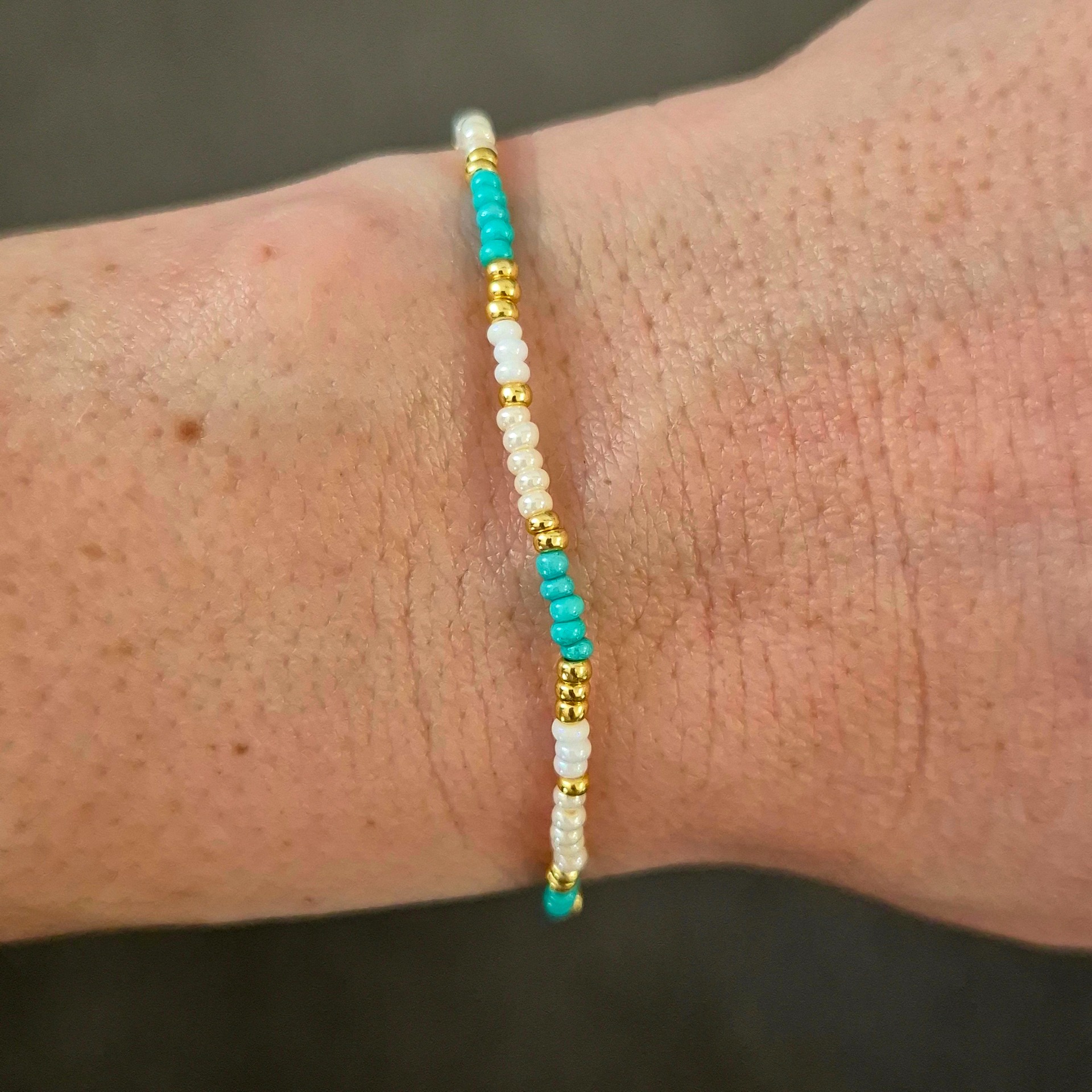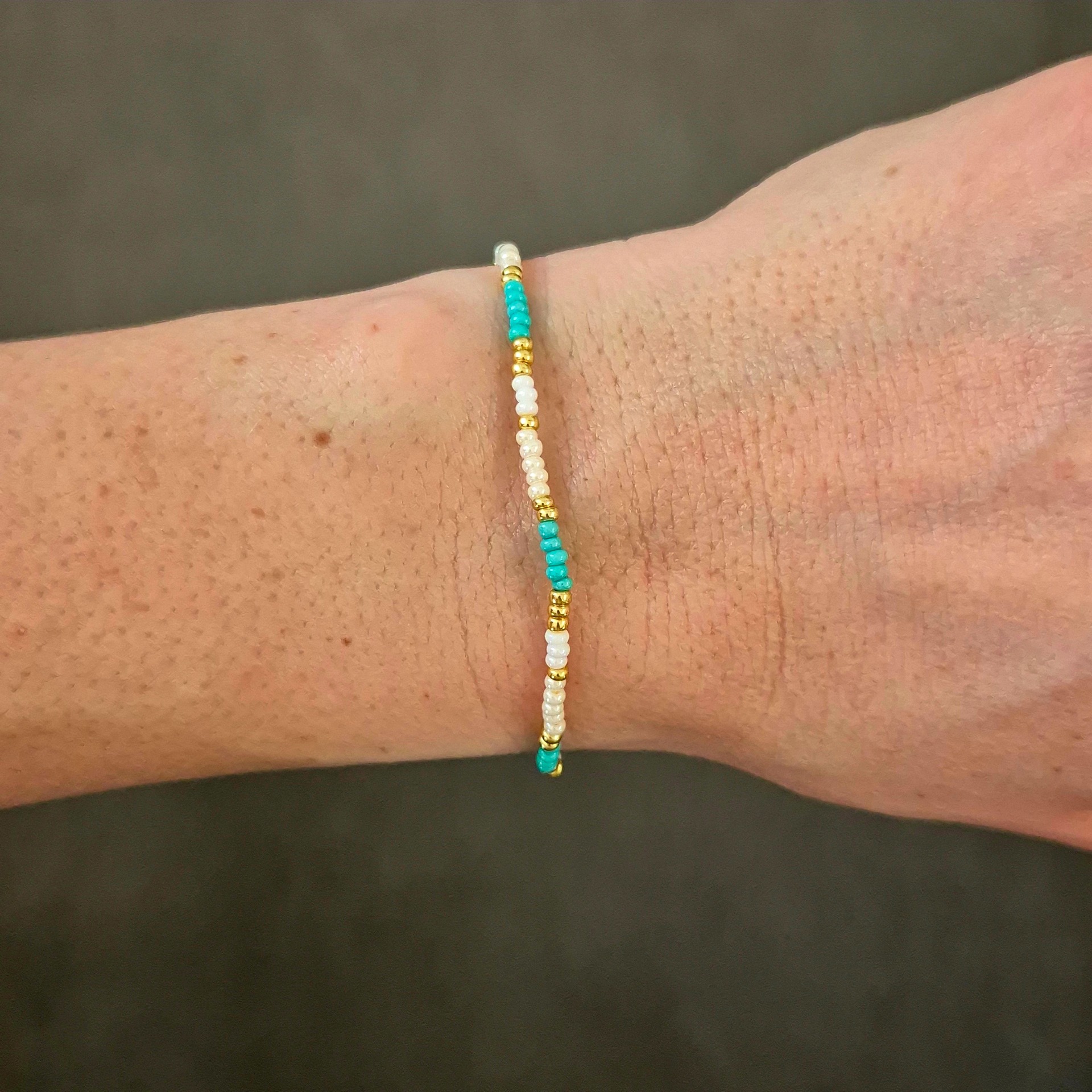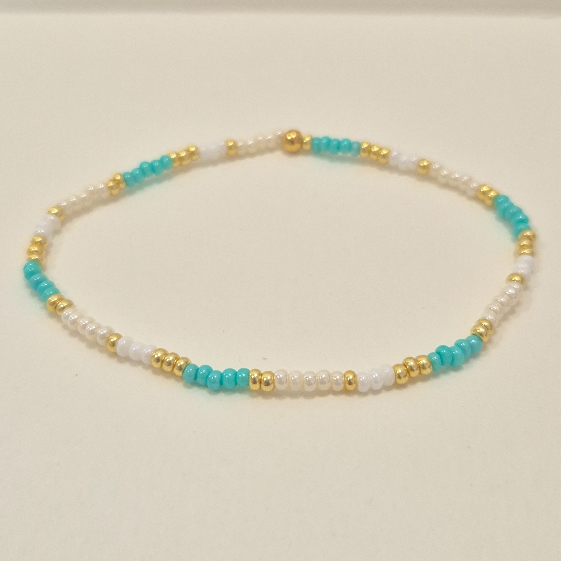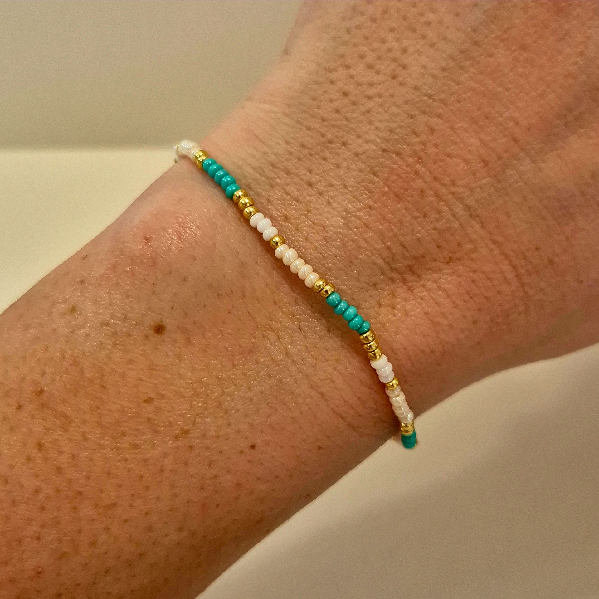 Jemný ručně vyráběný náramek z drobných skleněných korálků v kombinaci mentolové, bílé a zlaté barvy.