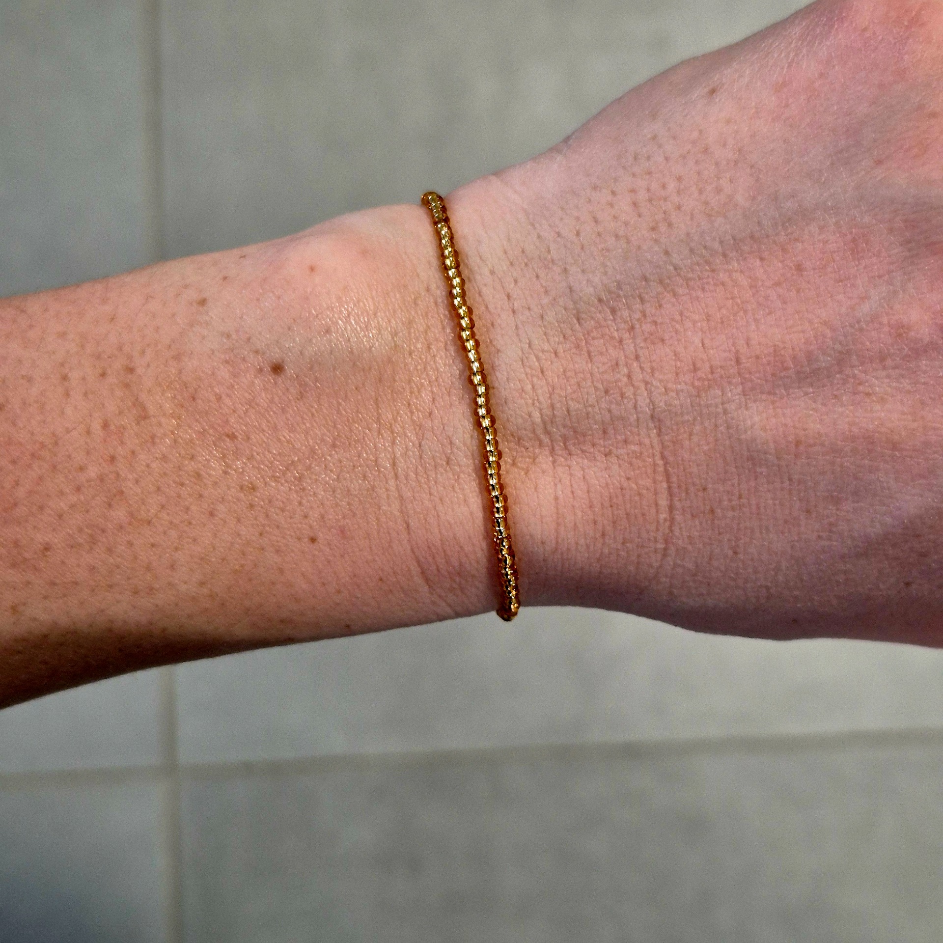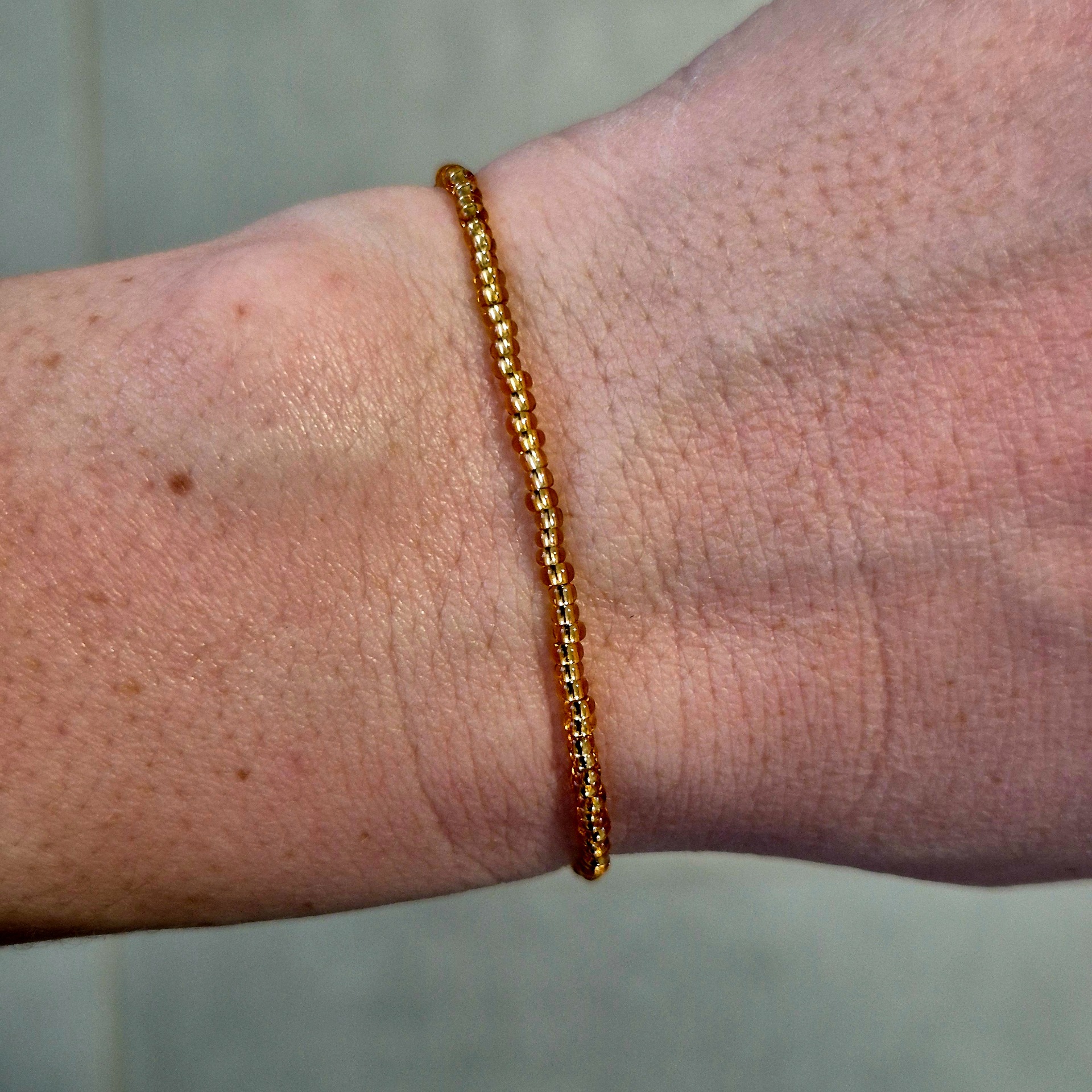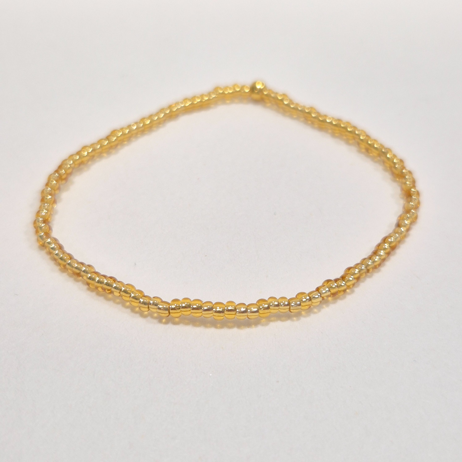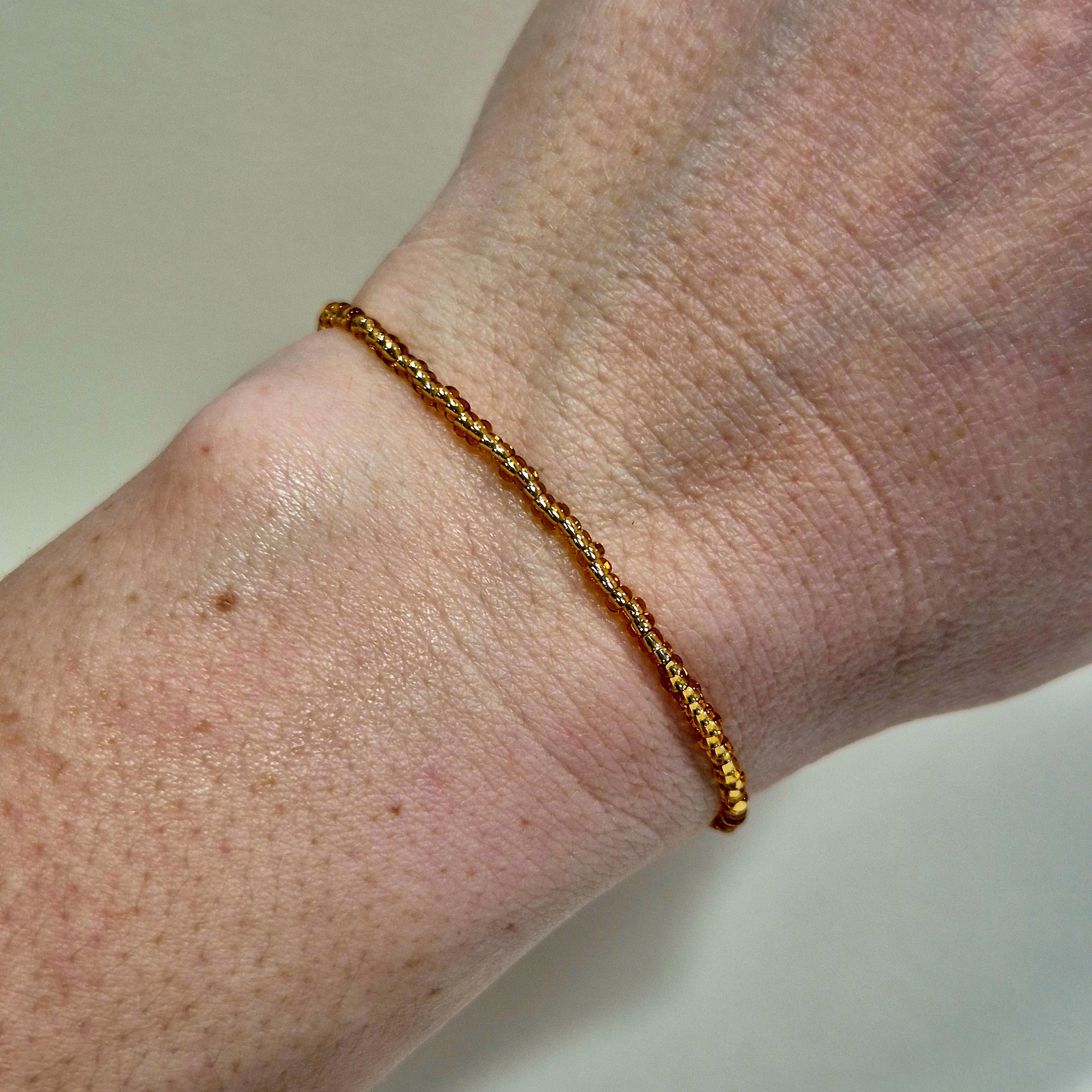 Jemný korálkový náramek ze skleněných korálků v elegantním zlatém odstínu.