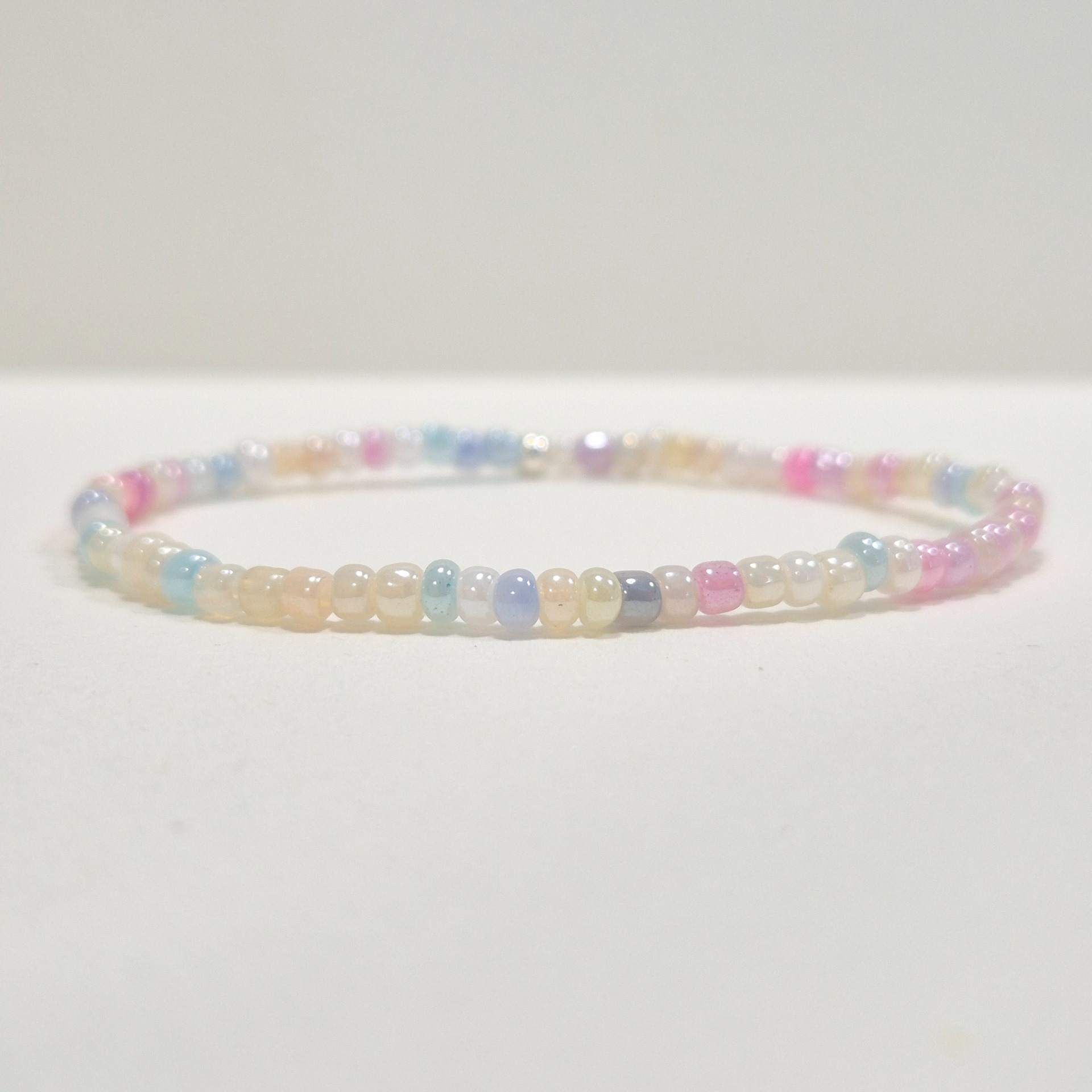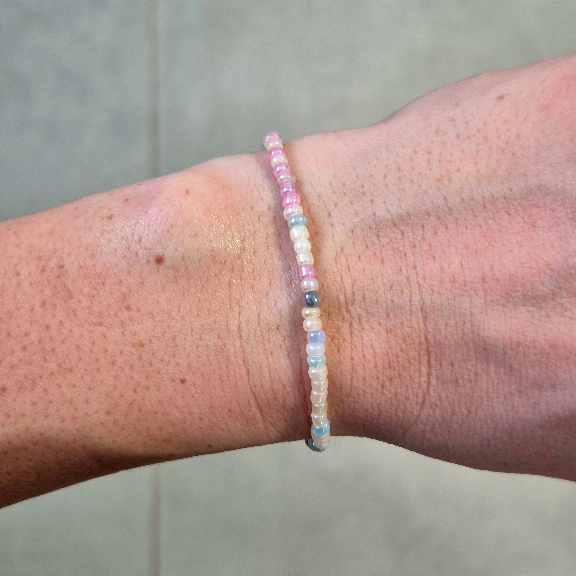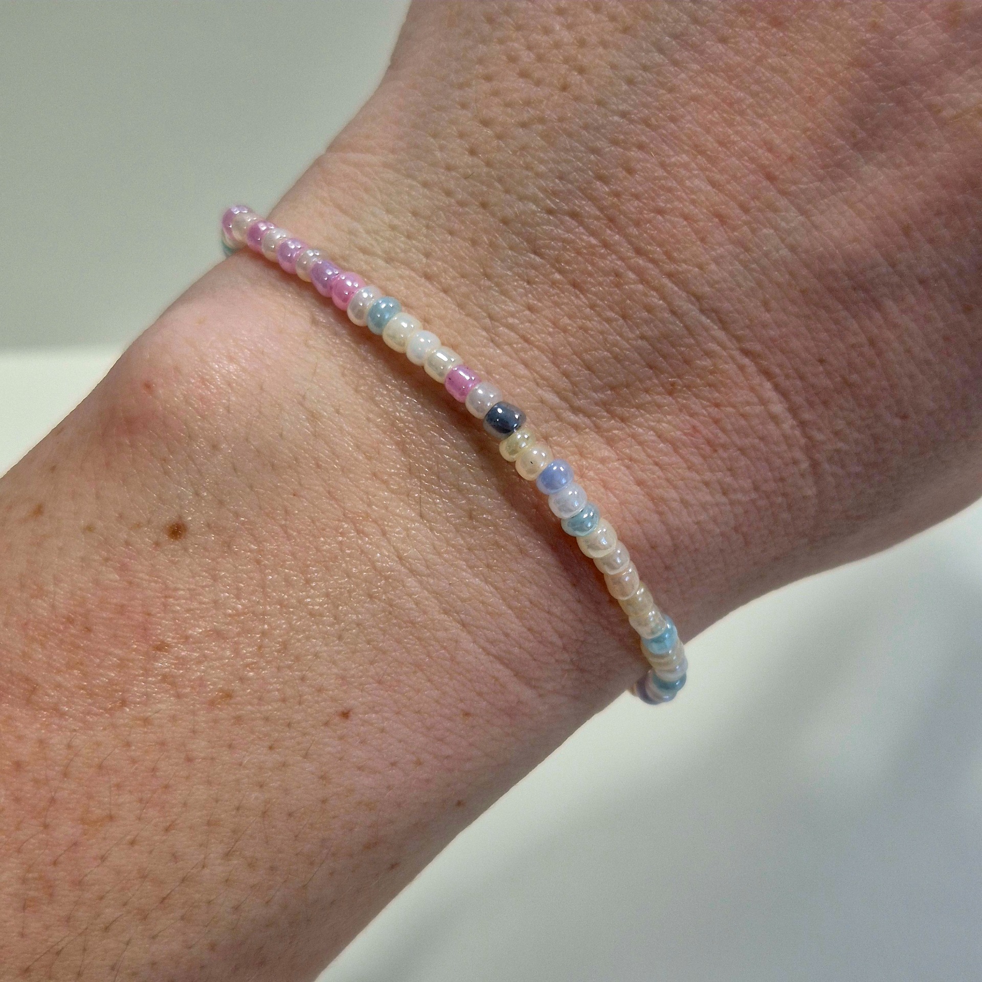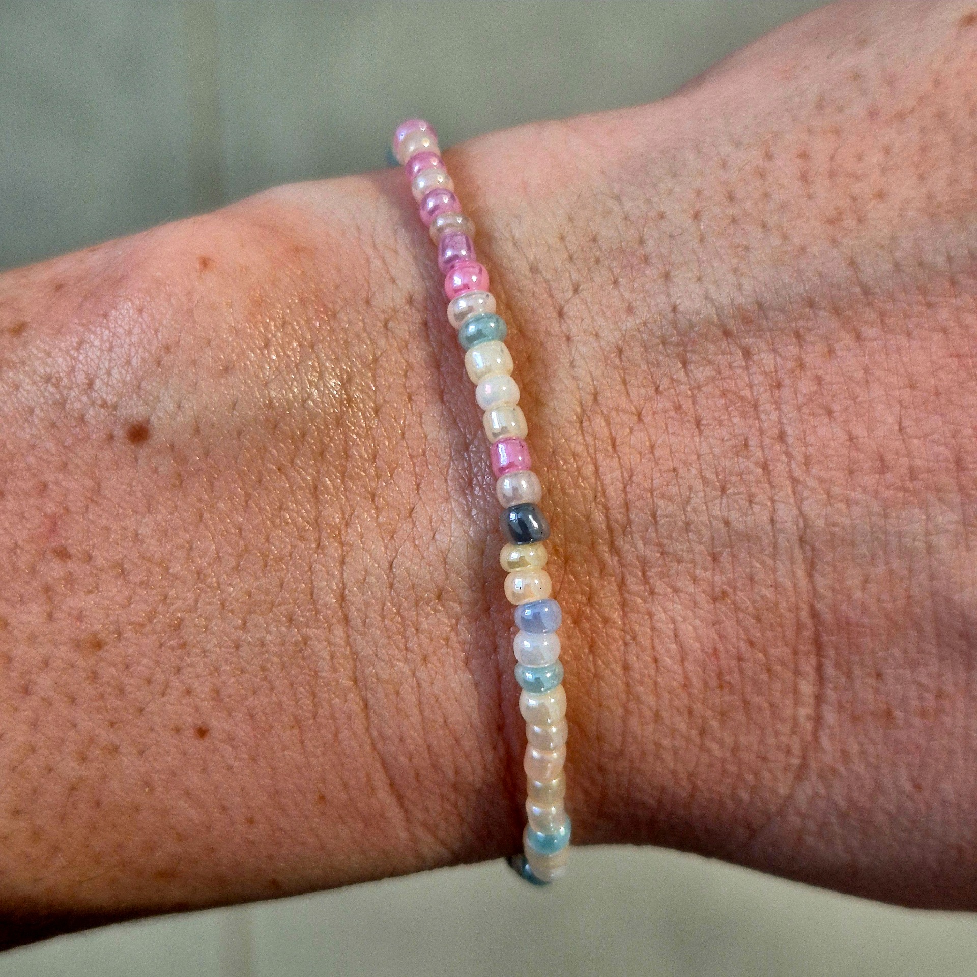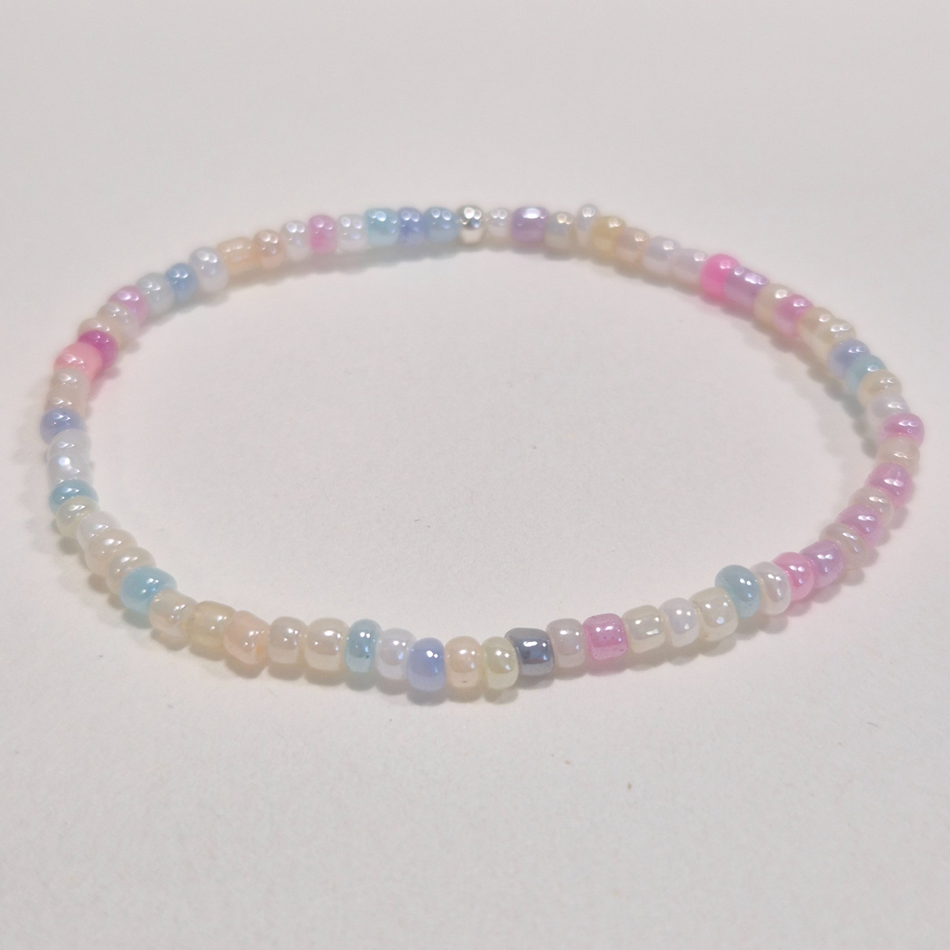 Jemný náramek z drobných korálků v pastelových odstínech, které spolu vytváří něžnou a hravou kombinaci.