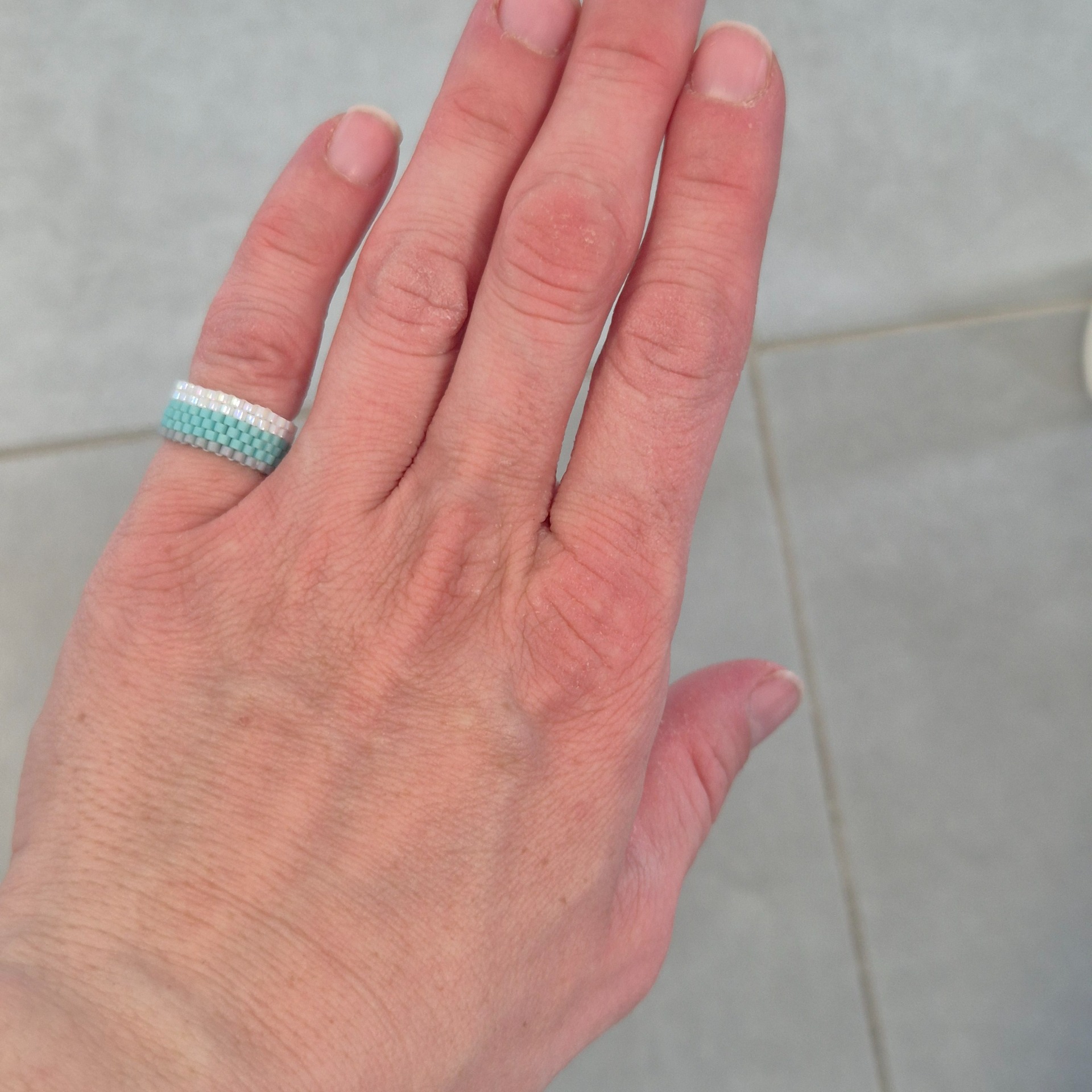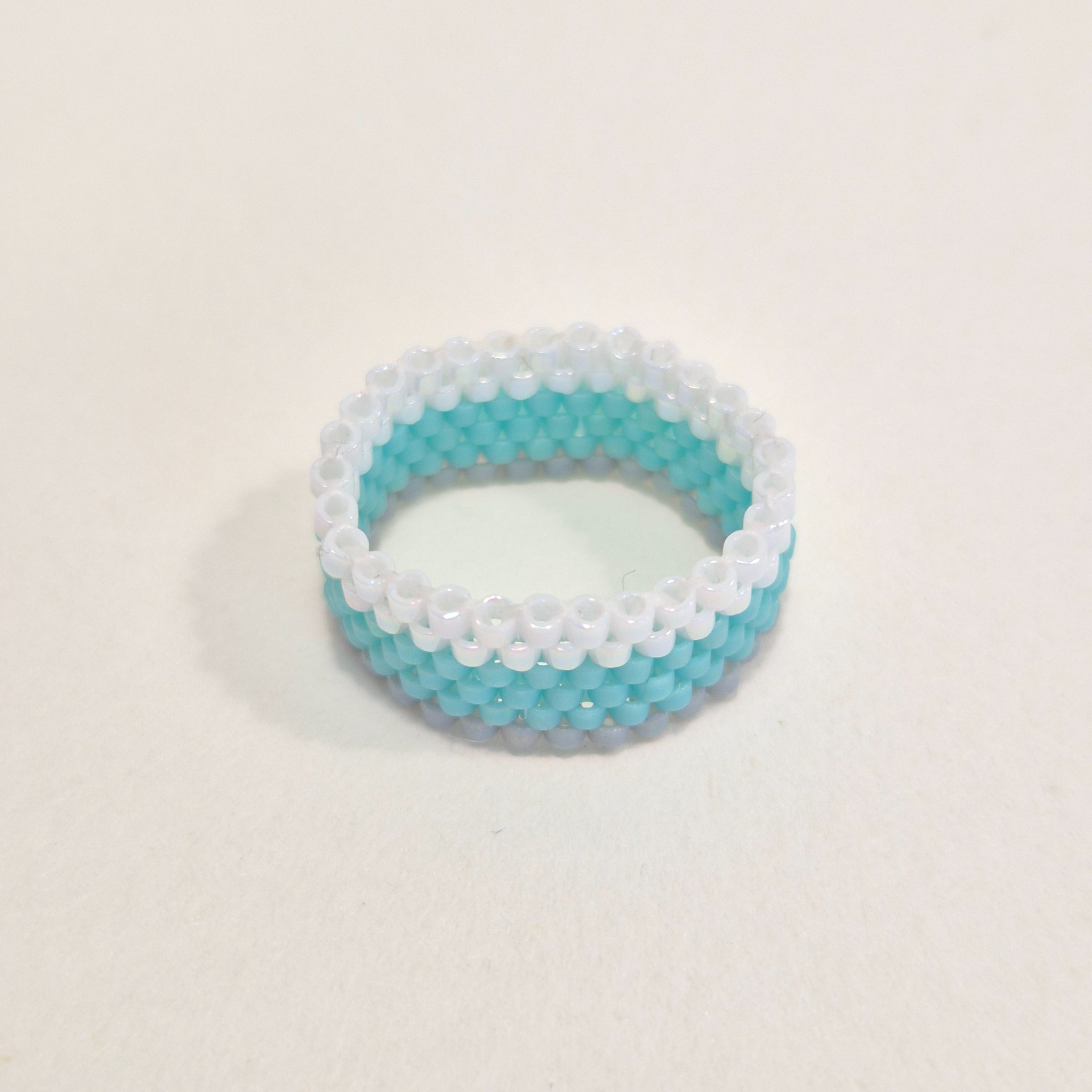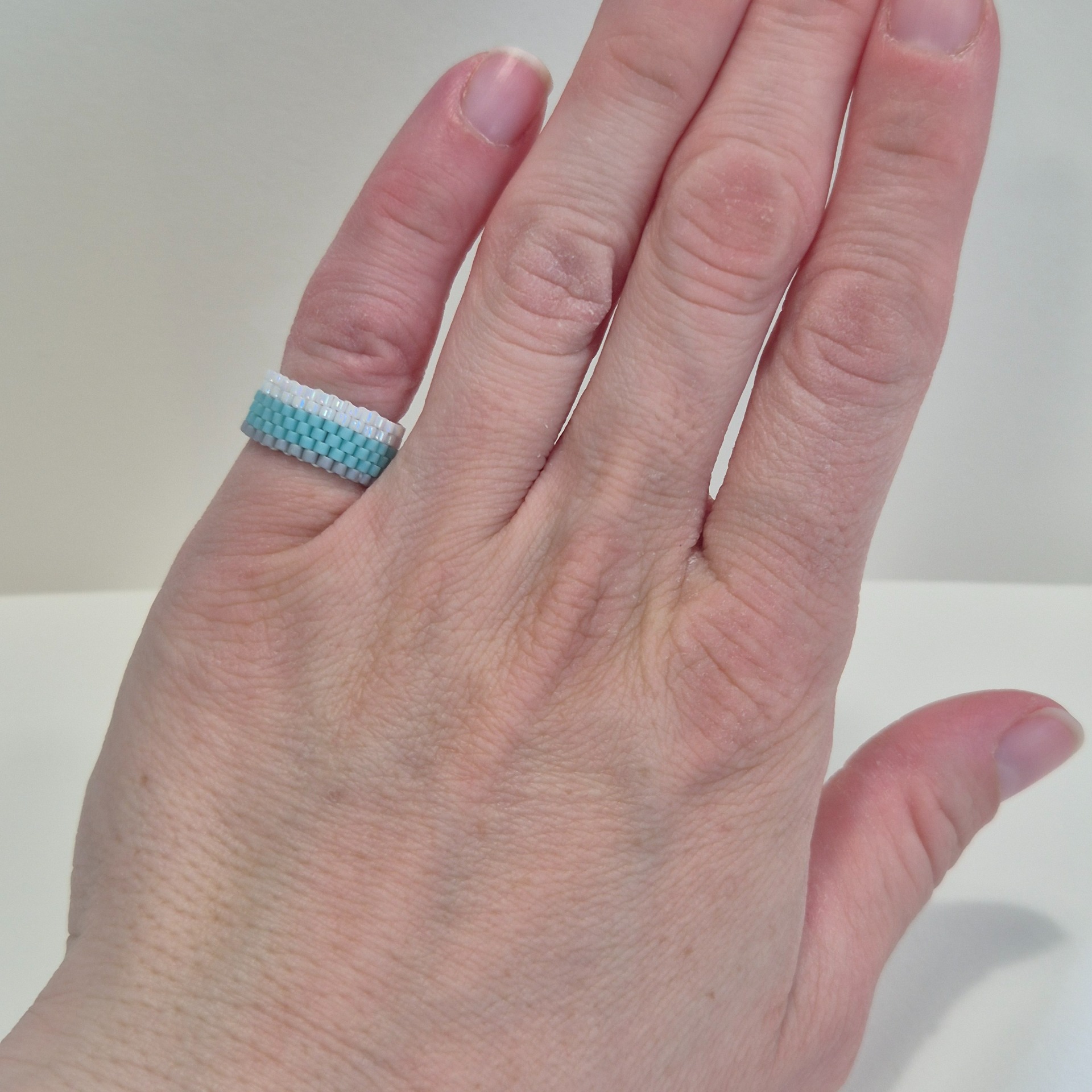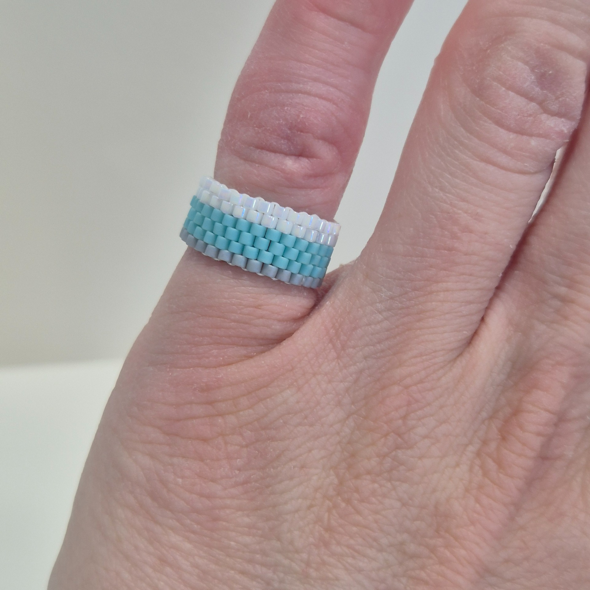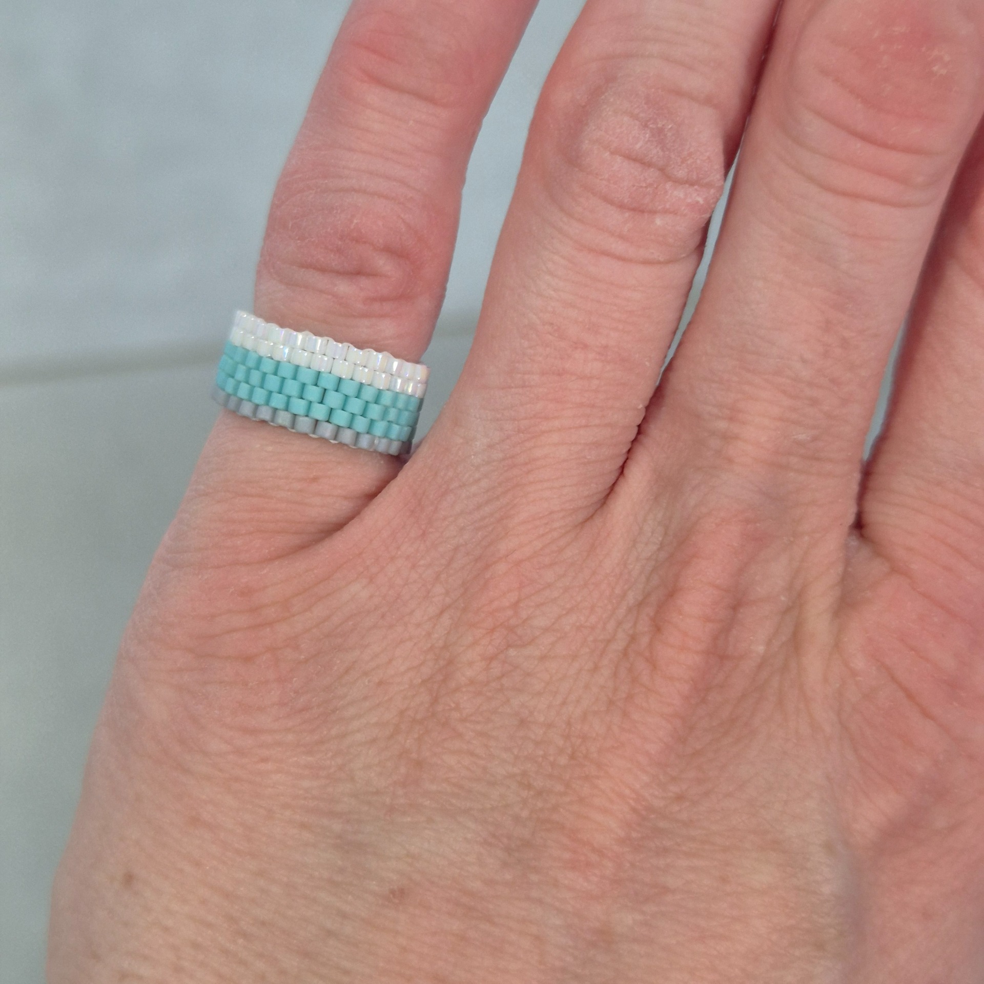 Ručně šitý prstýnek z japonských Miyuki korálků v jemné kombinaci bílé s perleťovým leskem, svěží mentolové modré a matné šedé. Šířka 6 řad vytváří elegantní a vyvážený šperk, který na ruce působí lehce a přirozeně.