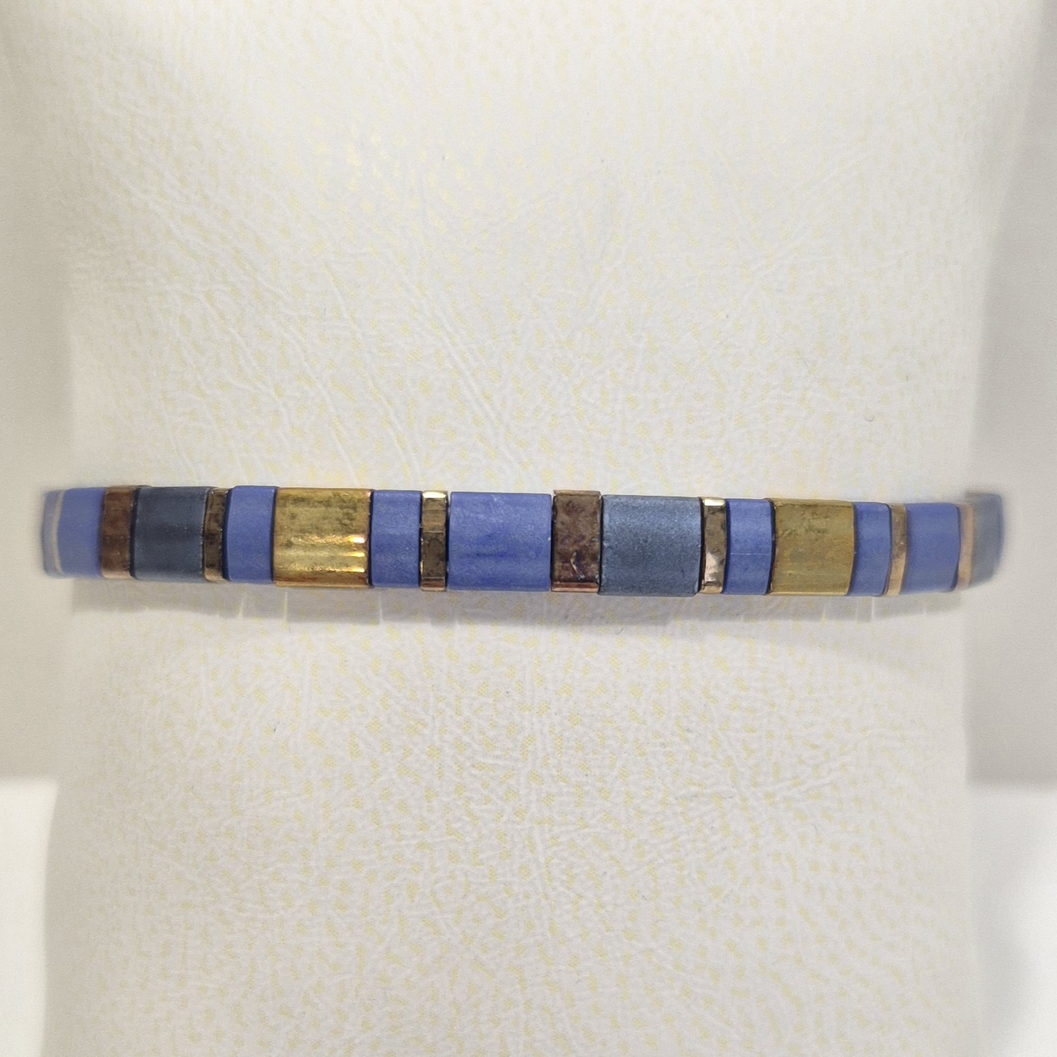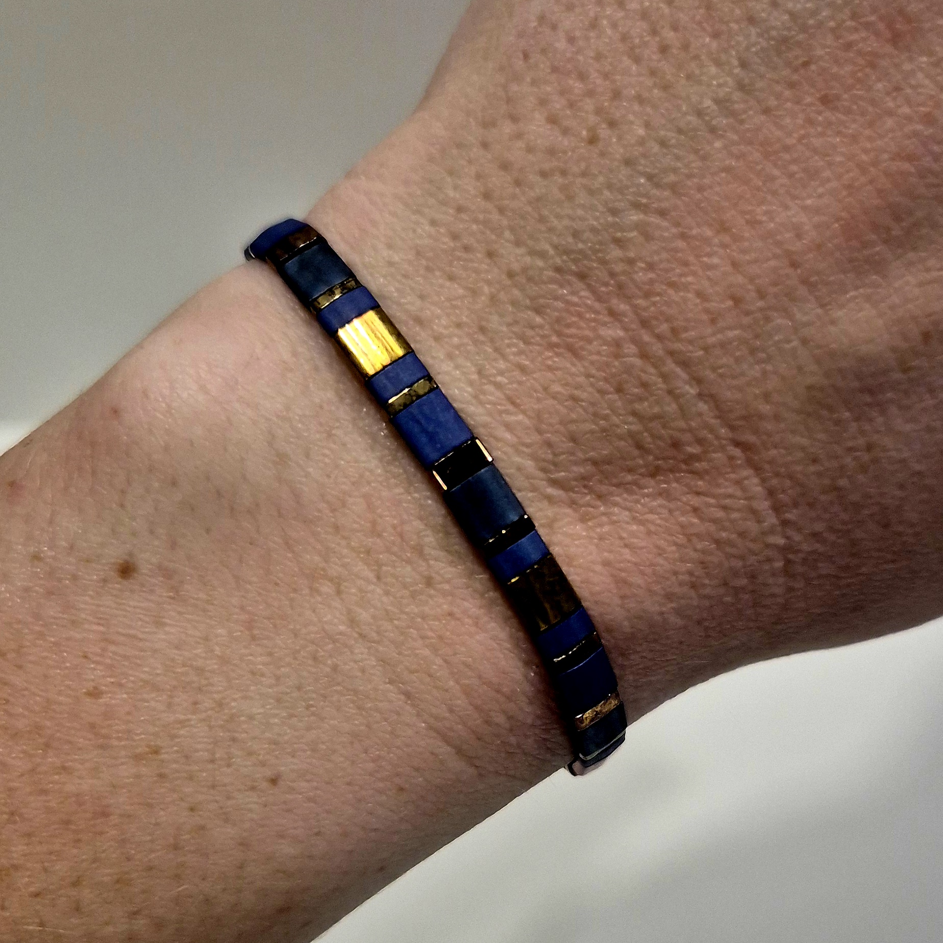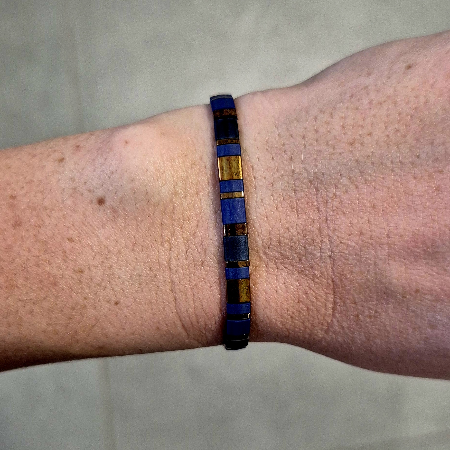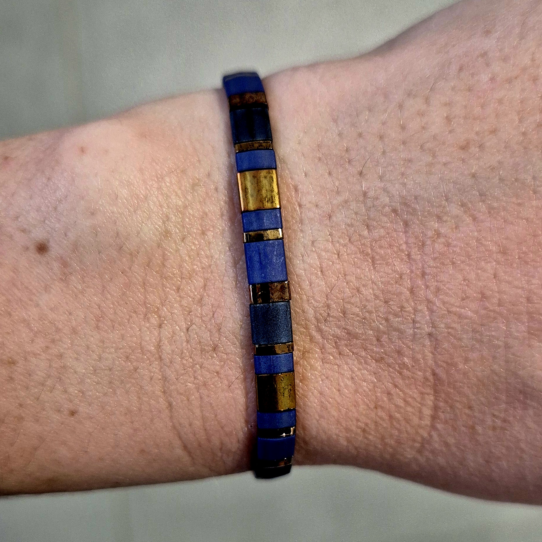 Elegantní náramek z plochých japonských korálků Miyuki v kombinaci tmavě modré, zlaté a jemných hnědých detailů. Tato barevná paleta působí luxusně a nadčasově, takže se skvěle hodí jak pro každodenní nošení, tak k výraznějším outfitům.