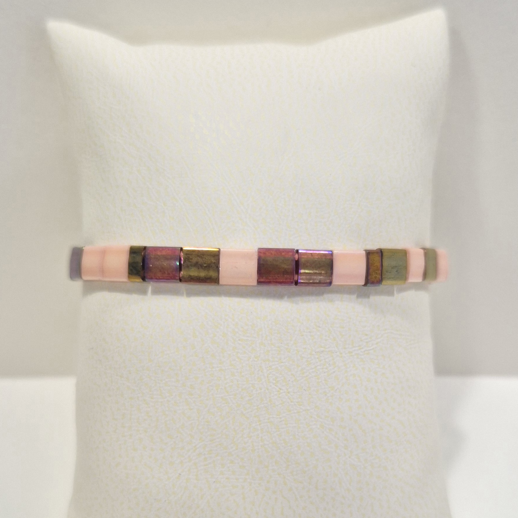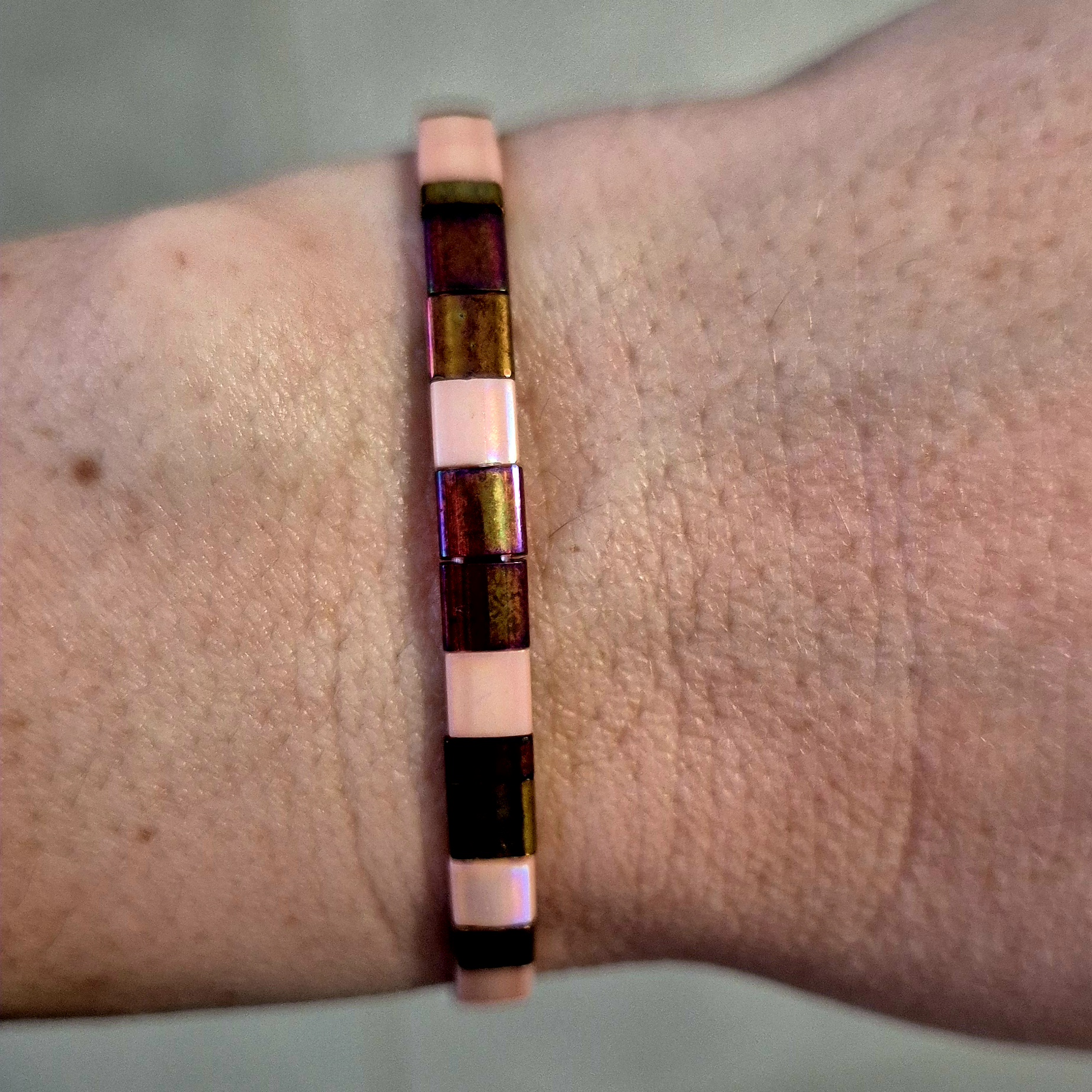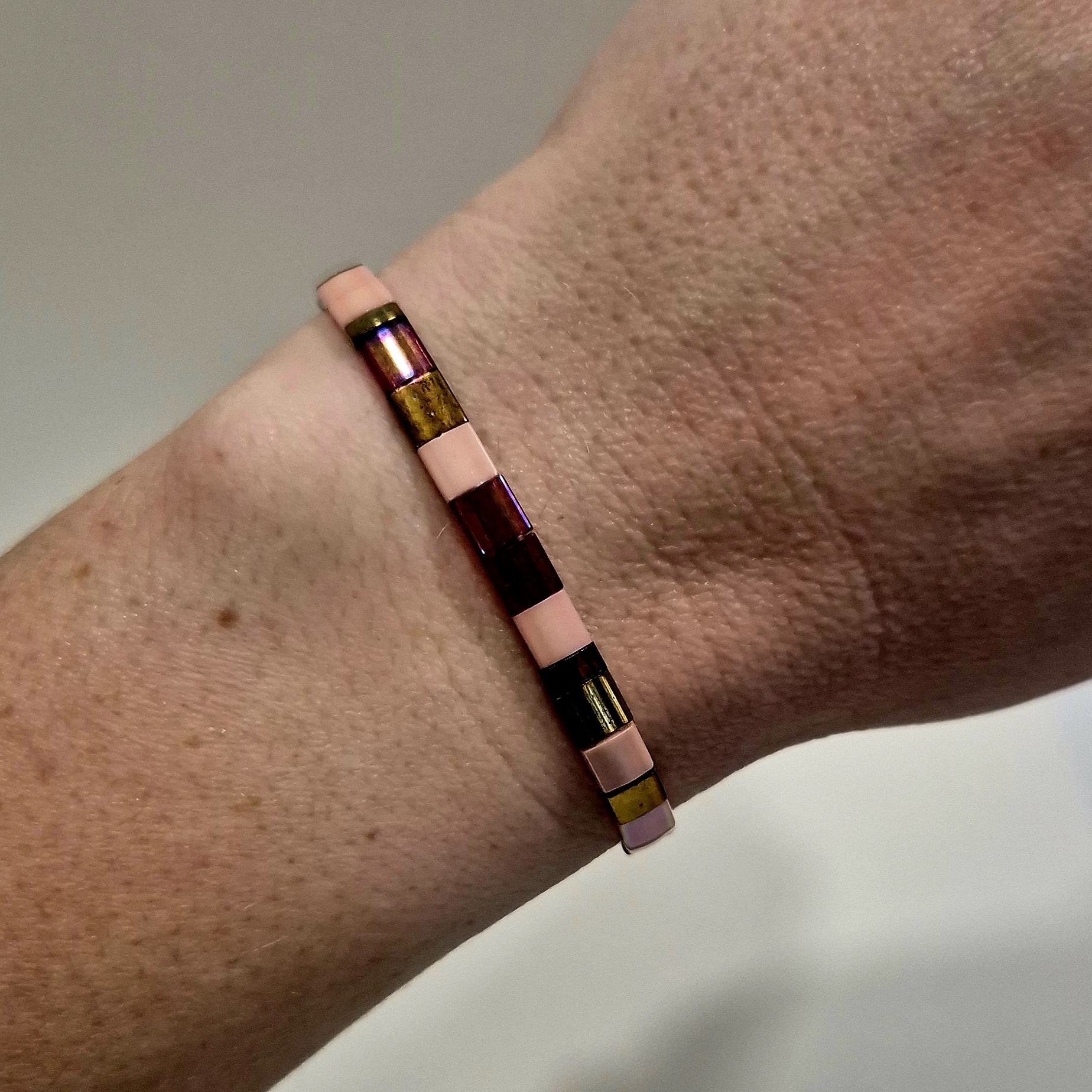 Elegantní náramek z plochých japonských korálků Miyuki v odstínech zlaté, doplněný o jemné světle růžové korálky. Při dopadu světla vytváří krásné měděné a růžové odlesky, které dodávají šperku teplý lesk a jedinečnou hloubku.