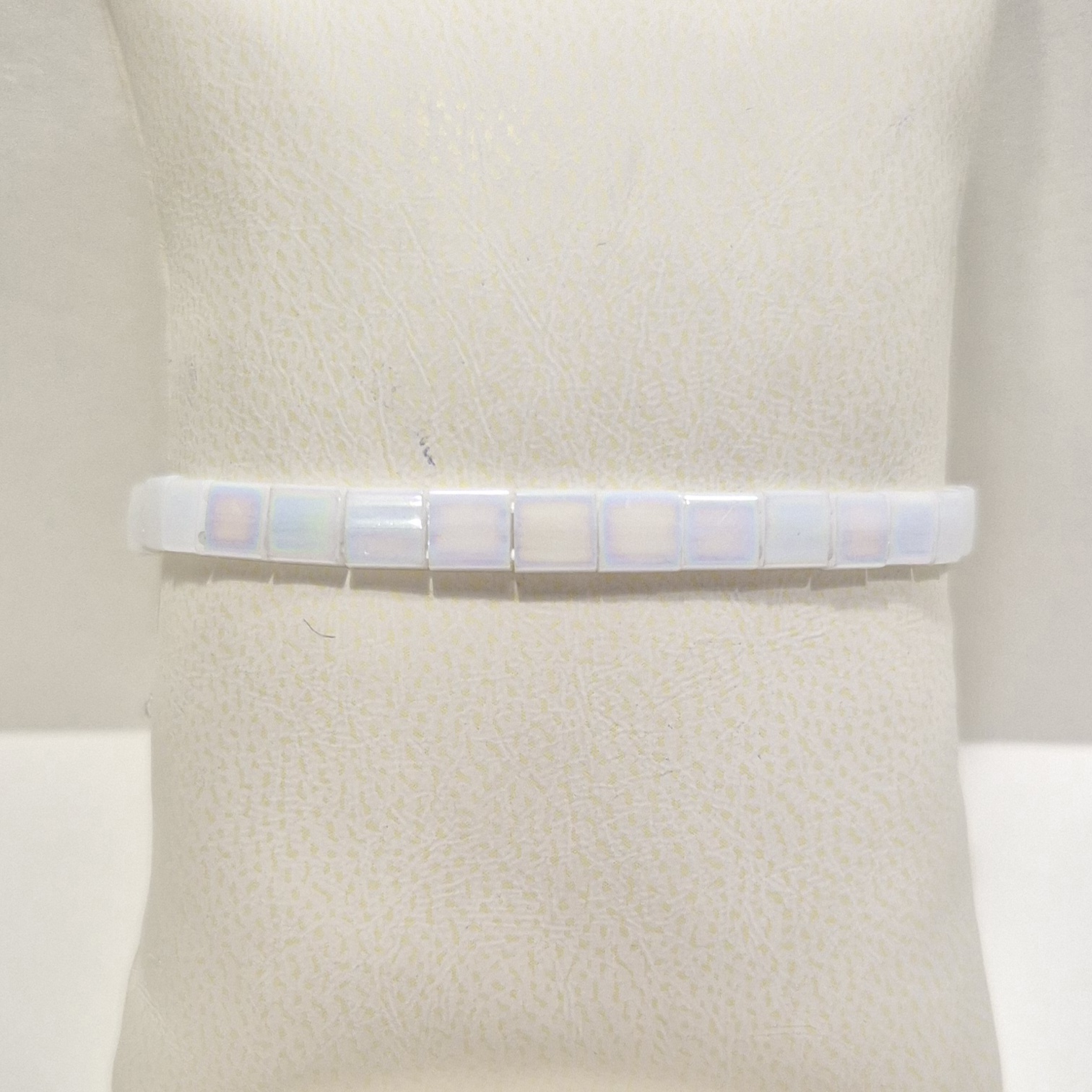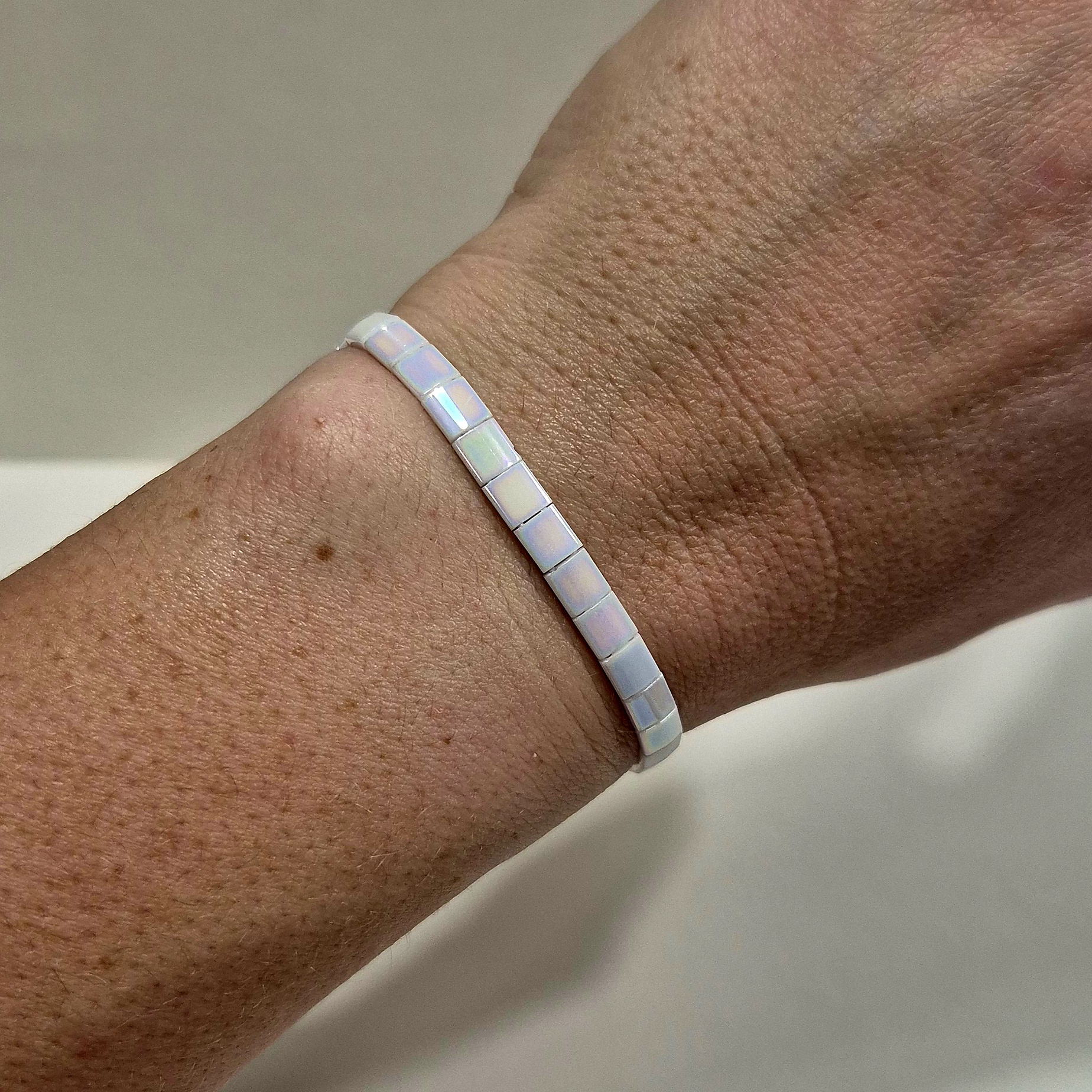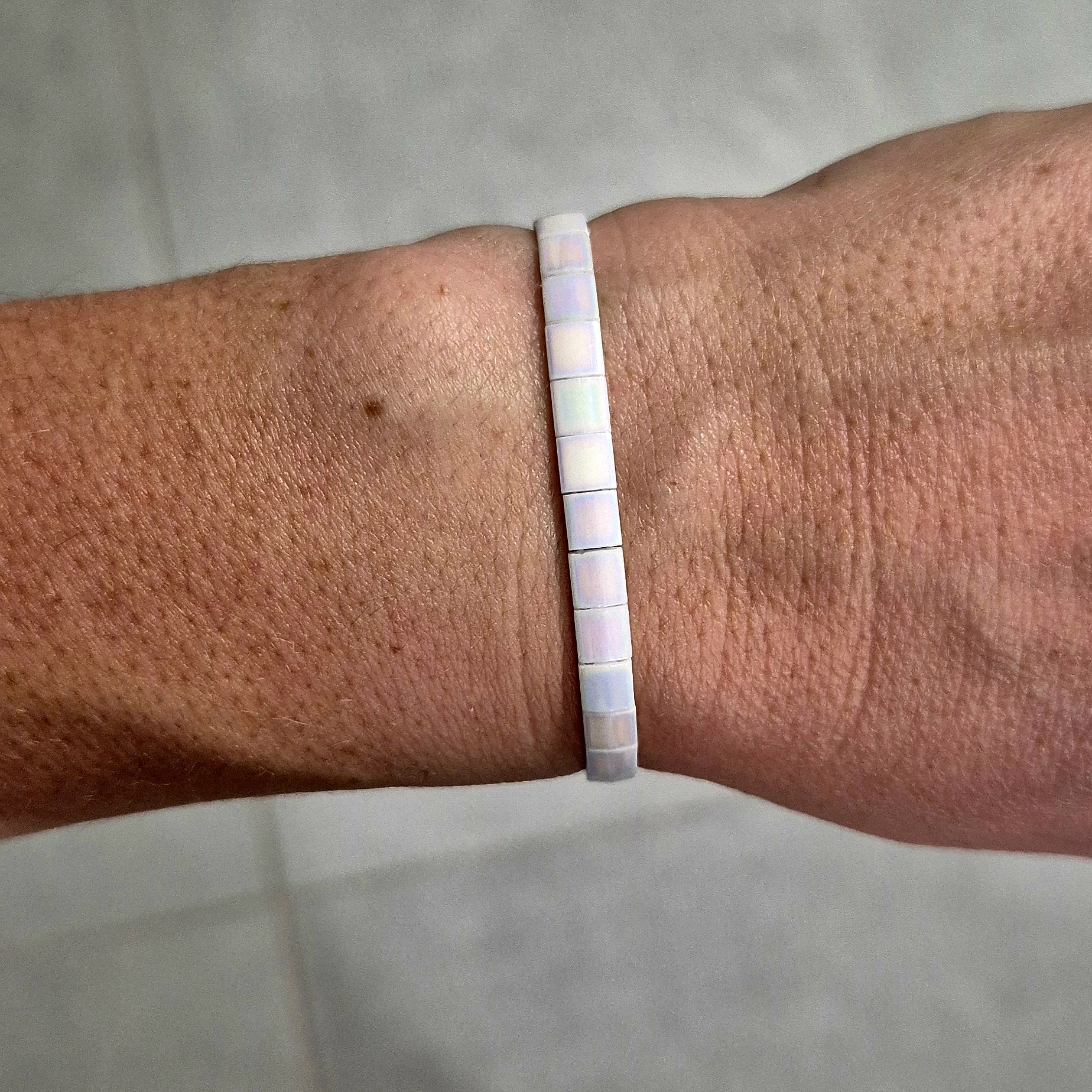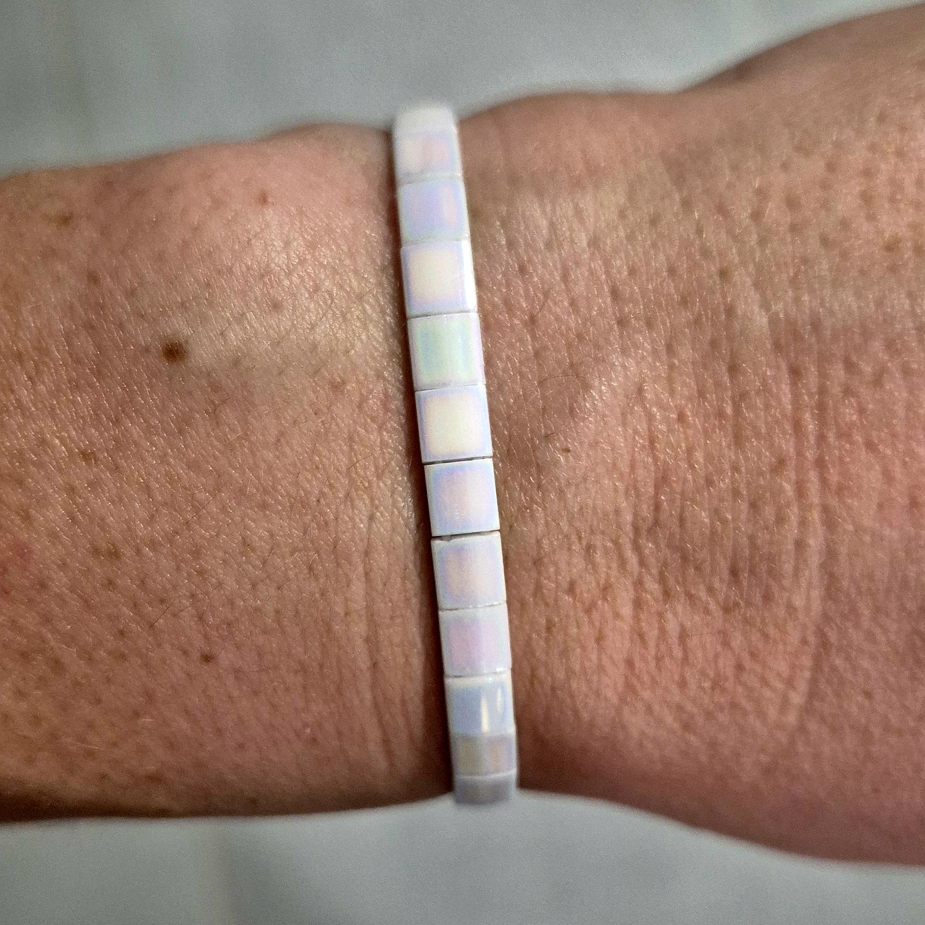 Elegantní a čistý náramek z plochých japonských korálků Miyuki v krásné lesklé bílé barvě s jemnými odlesky. Díky svému minimalistickému vzhledu působí velmi nadčasově a snadno doplní jakýkoliv outfit – od běžného dne až po slavnostní příležitosti.