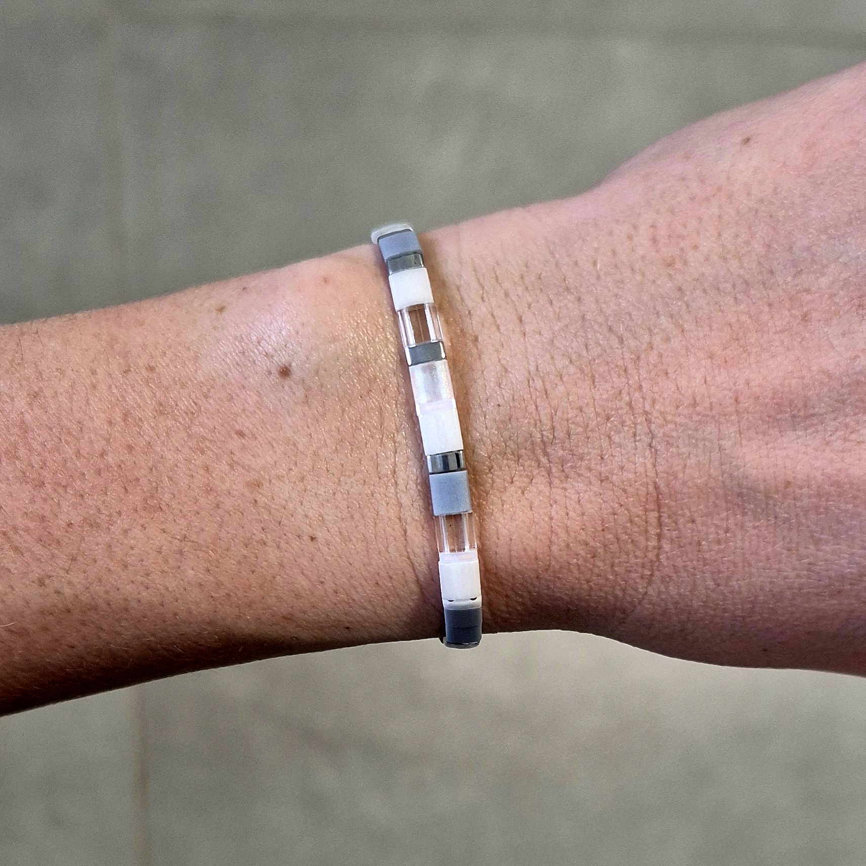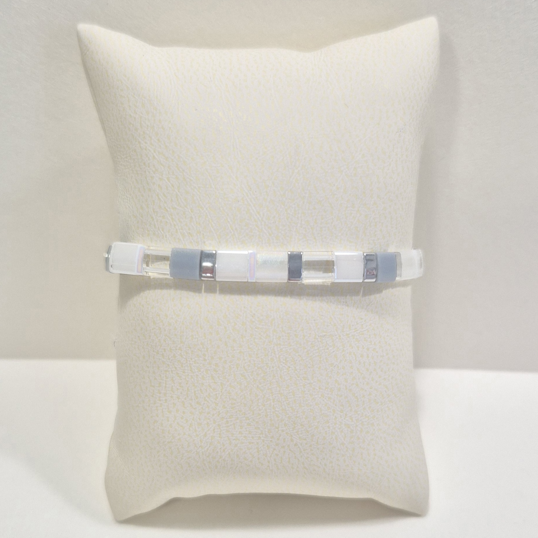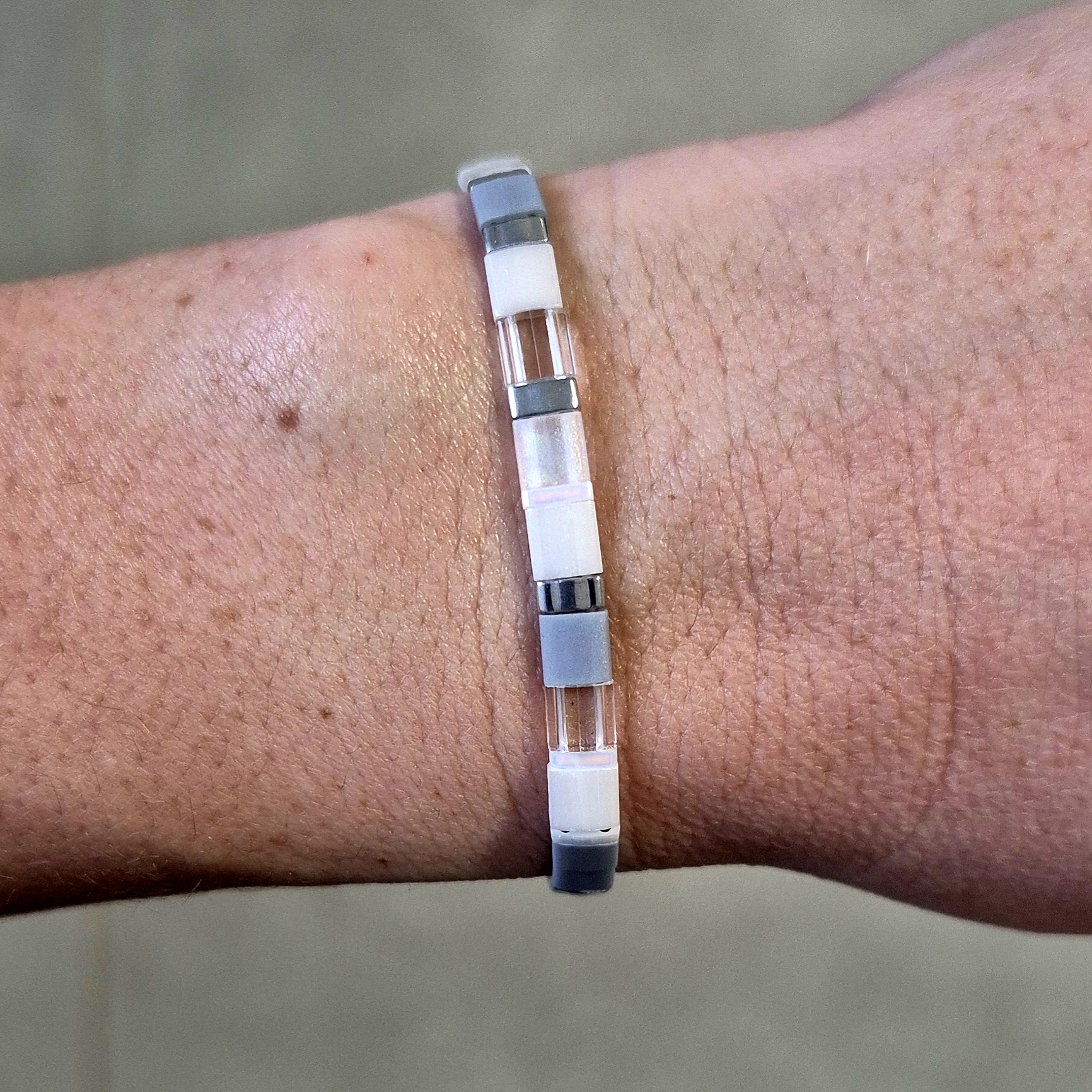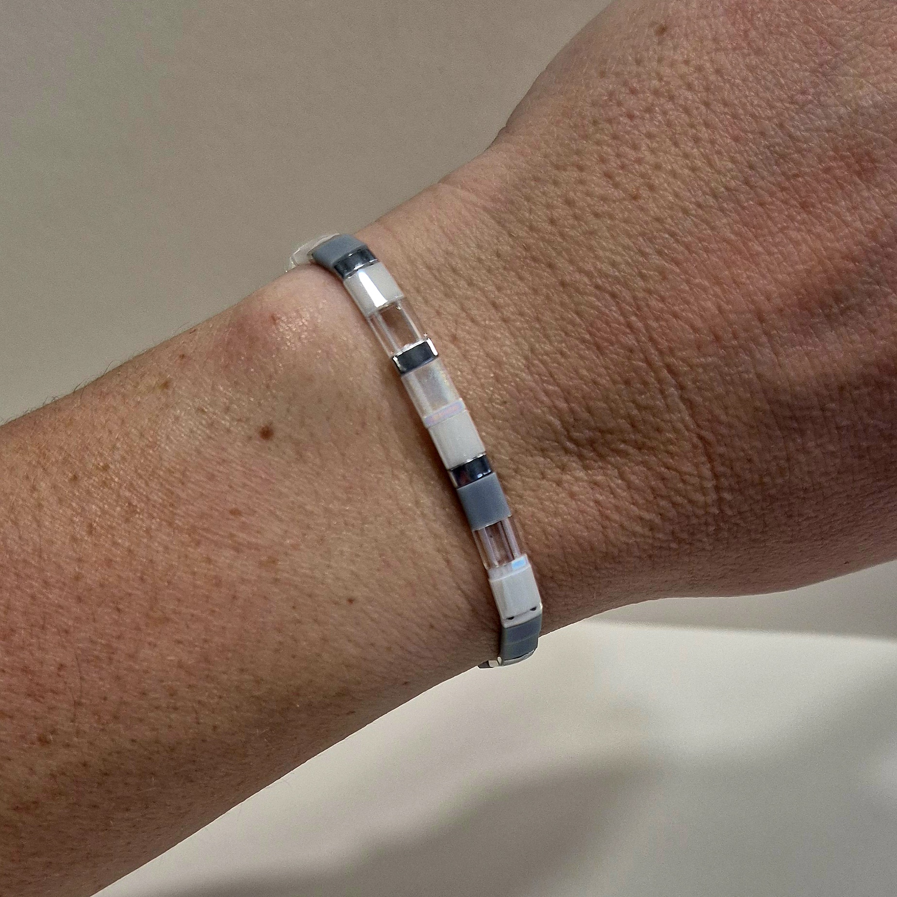 Jemný a nadčasový náramek z prvotřídních Miyuki korálků v kombinaci šedé, bílé a stříbrné. Tato harmonická paletka působí čistě, elegantně a snadno doplní jakýkoliv outfit – od volnočasového až po slavnostní.