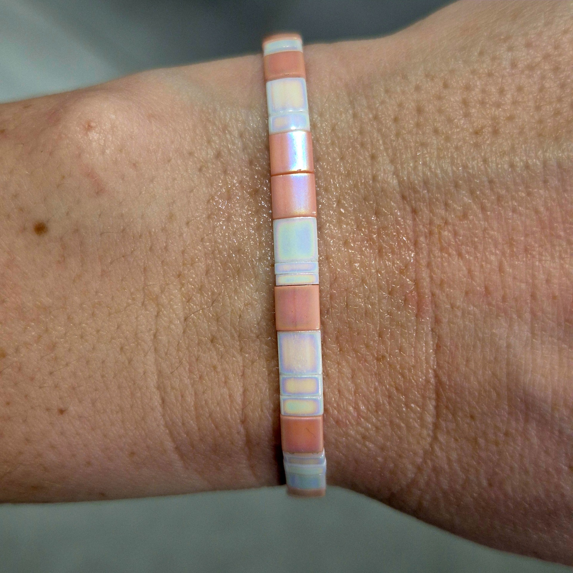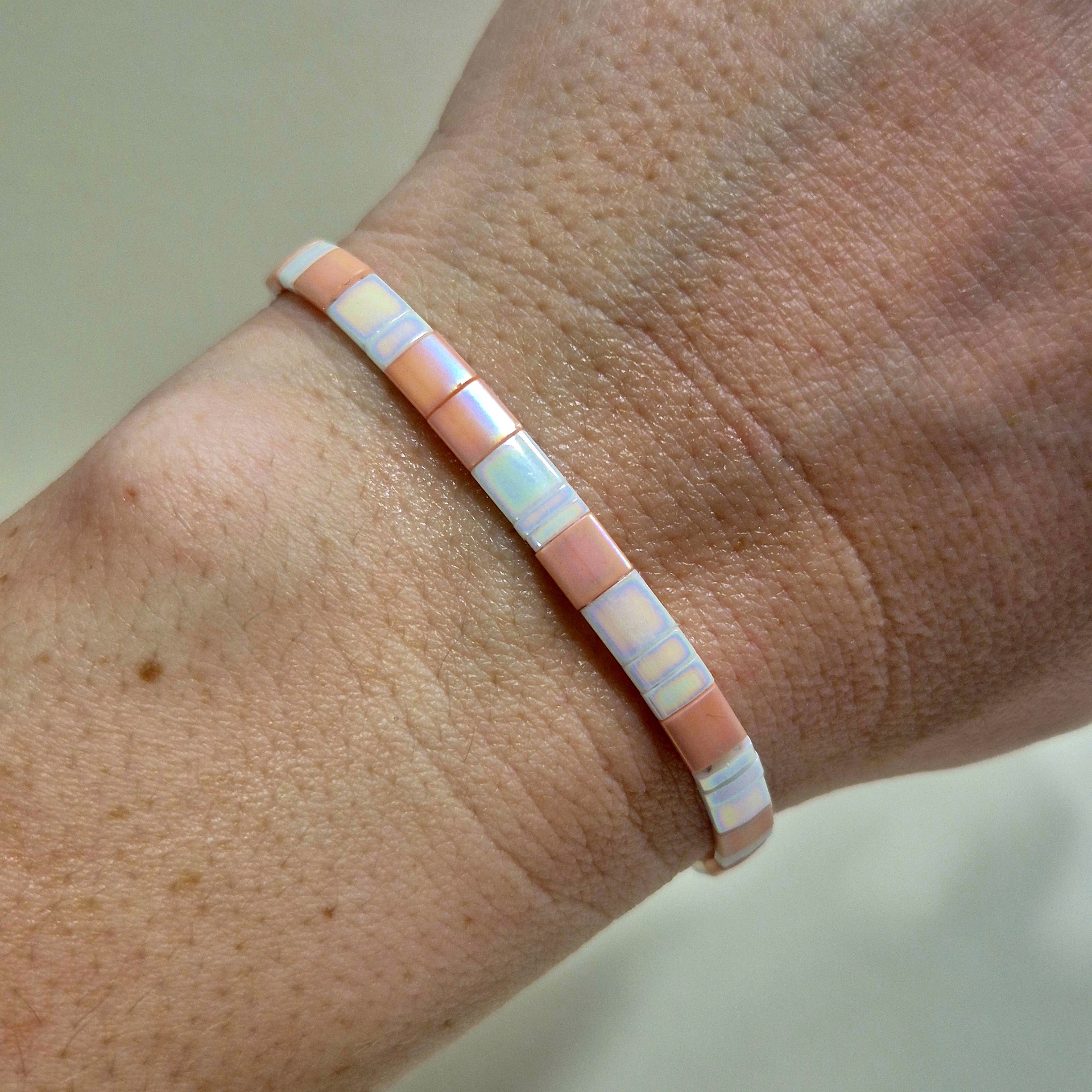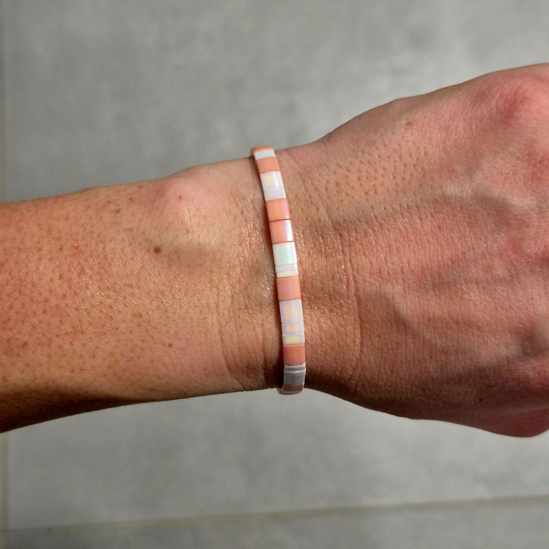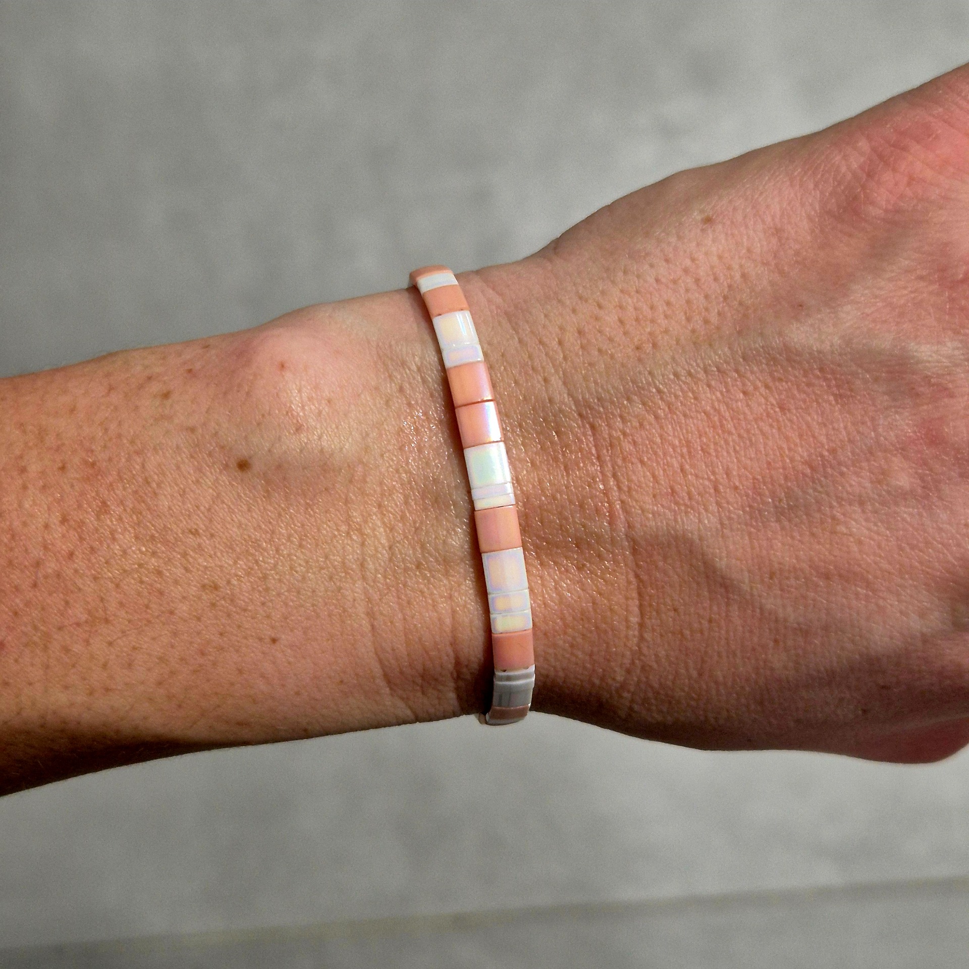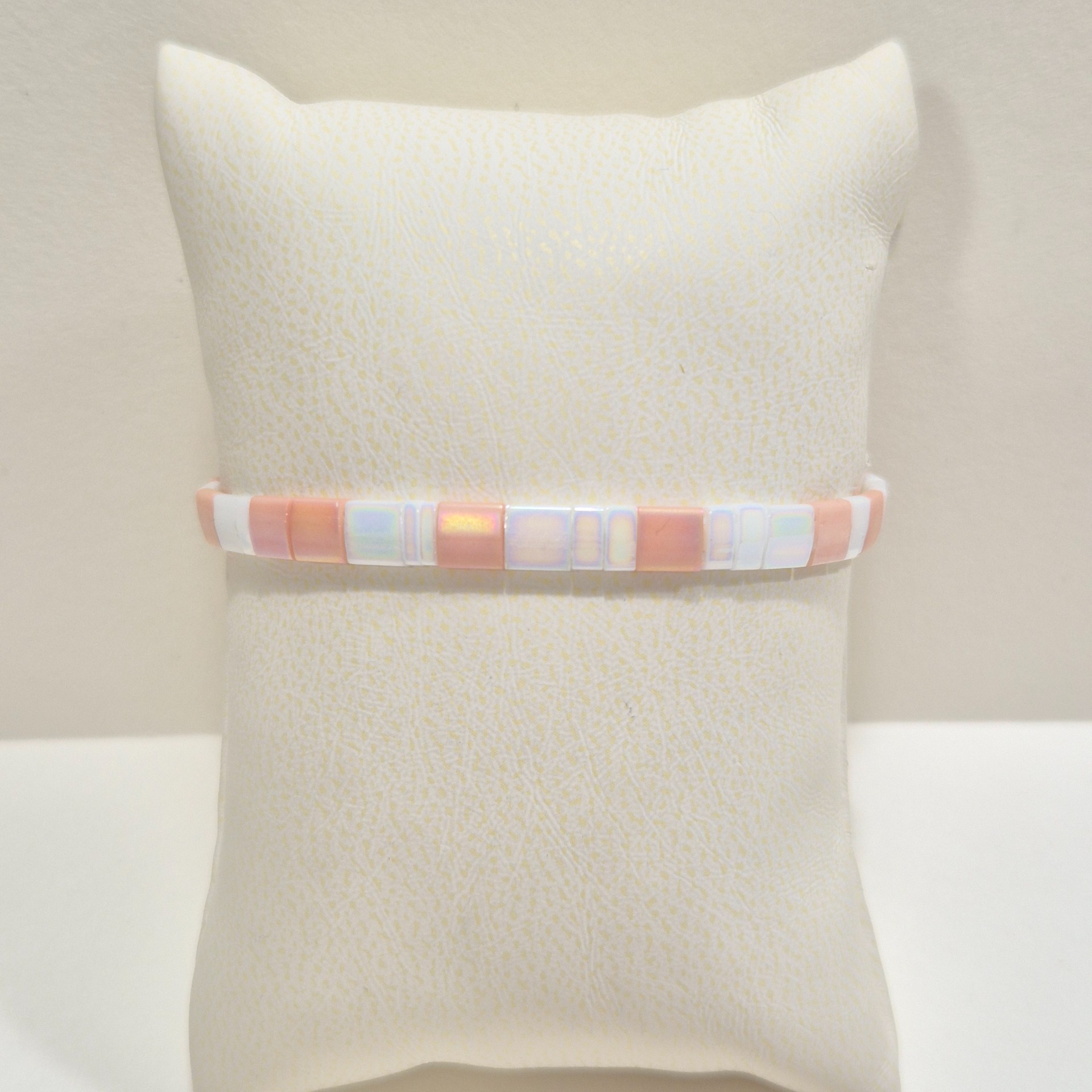 Ručně vyráběný náramek z kvalitních Miyuki korálků v jemné kombinaci růžové a bílé. Pravidelný tvar korálků a čisté barevné ladění vytváří elegantní a nadčasový doplněk, který se snadno kombinuje s dalšími náramky i samostatně.