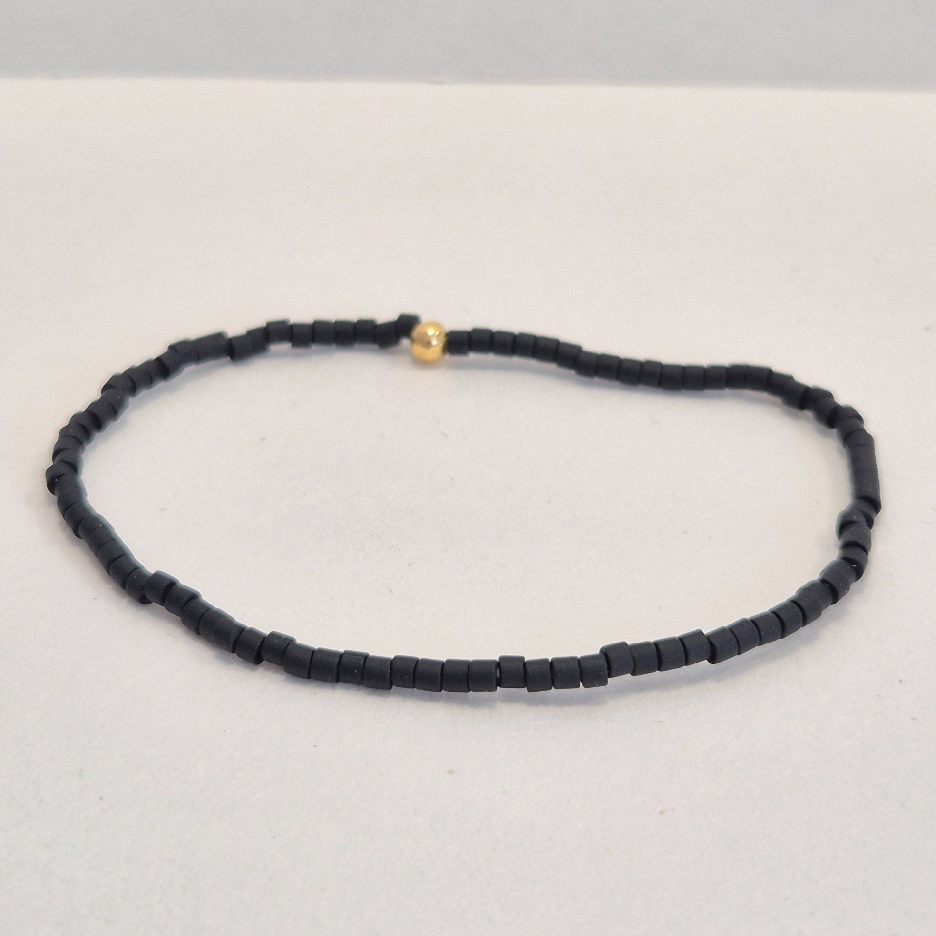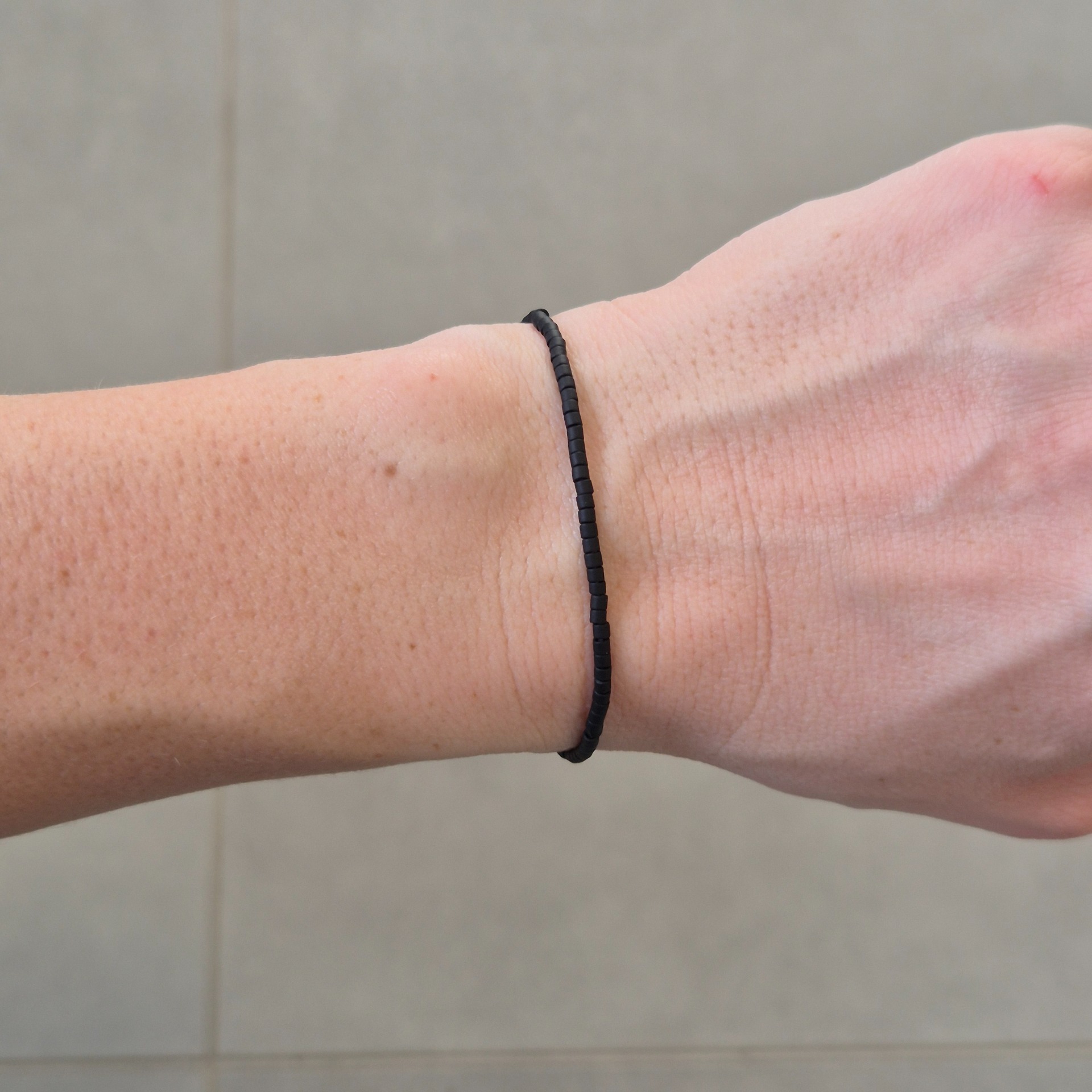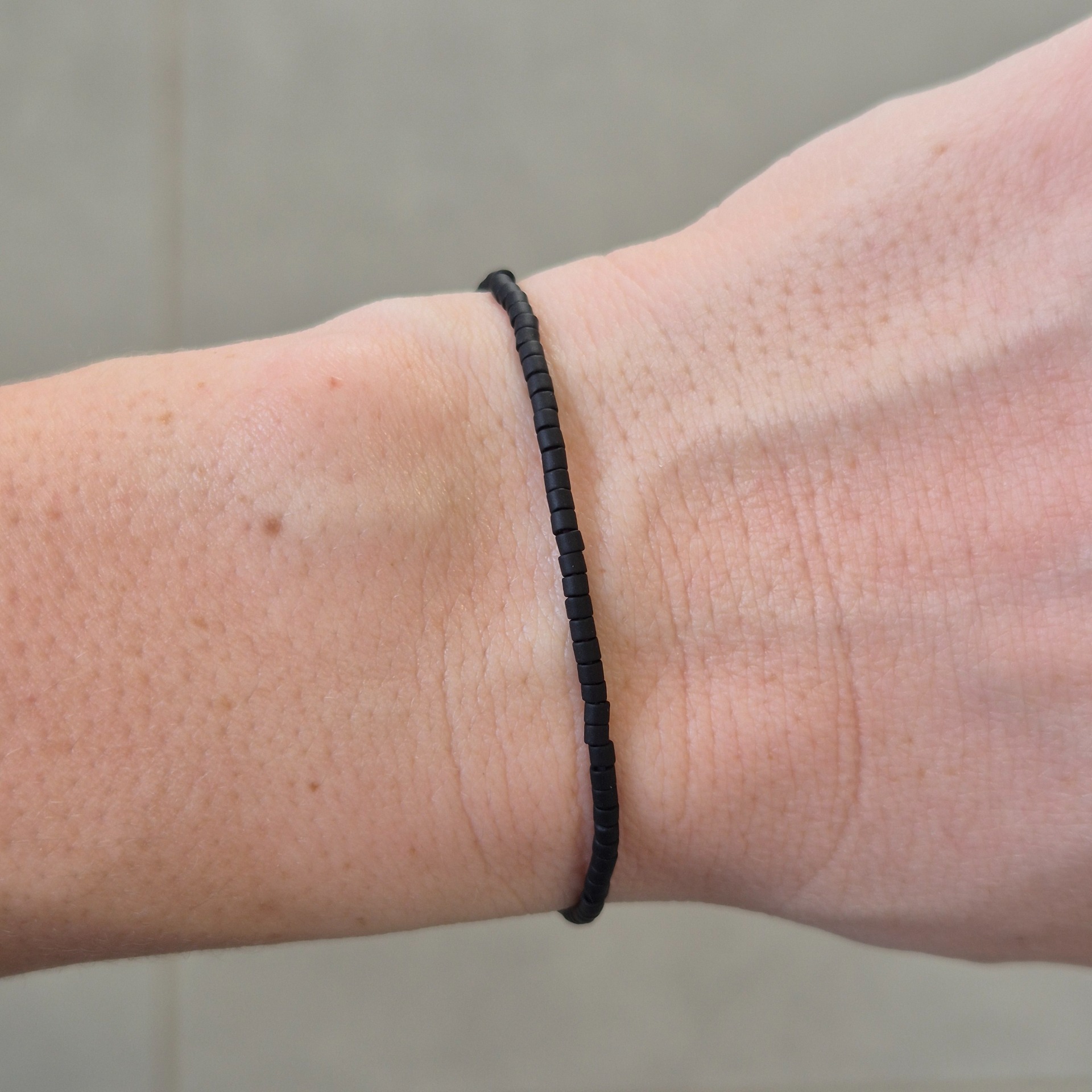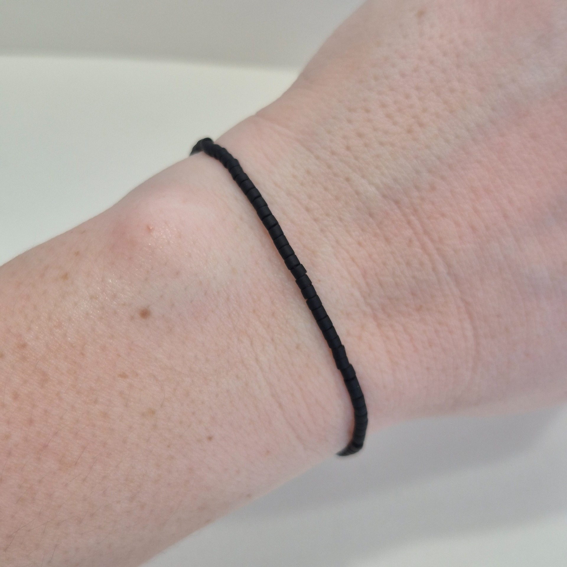 Jemný náramek z matných černých Miyuki korálků je ztělesněním jednoduchosti a nadčasového stylu. Čistá linie drobných korálků vytváří elegantní, nenápadný doplněk, který se snadno kombinuje s dalšími šperky.