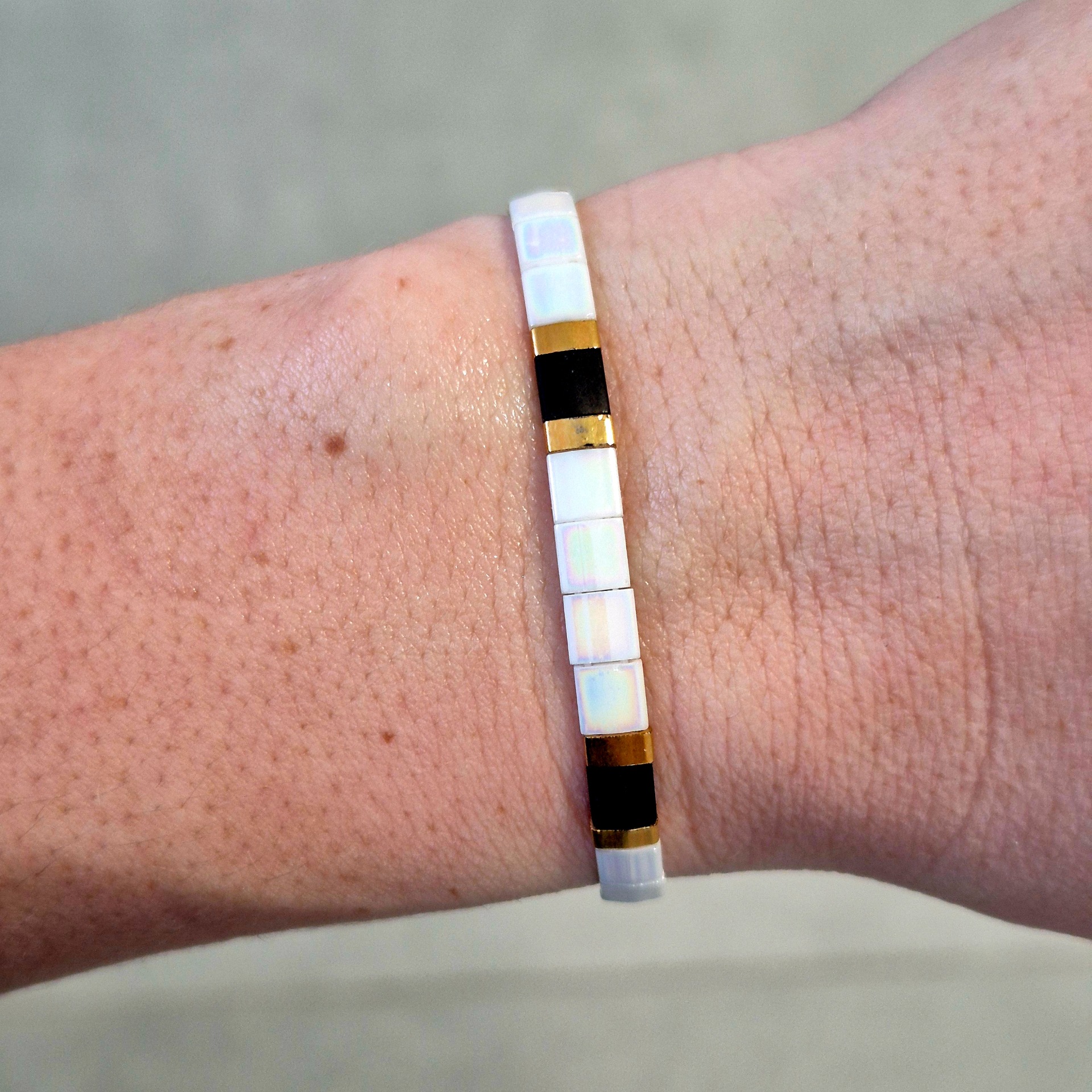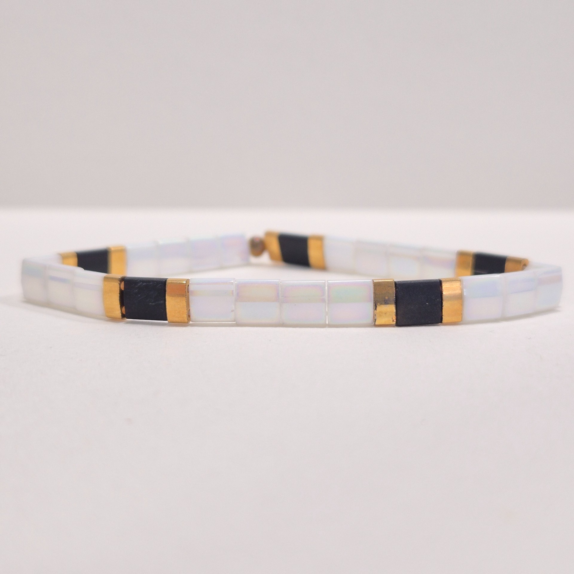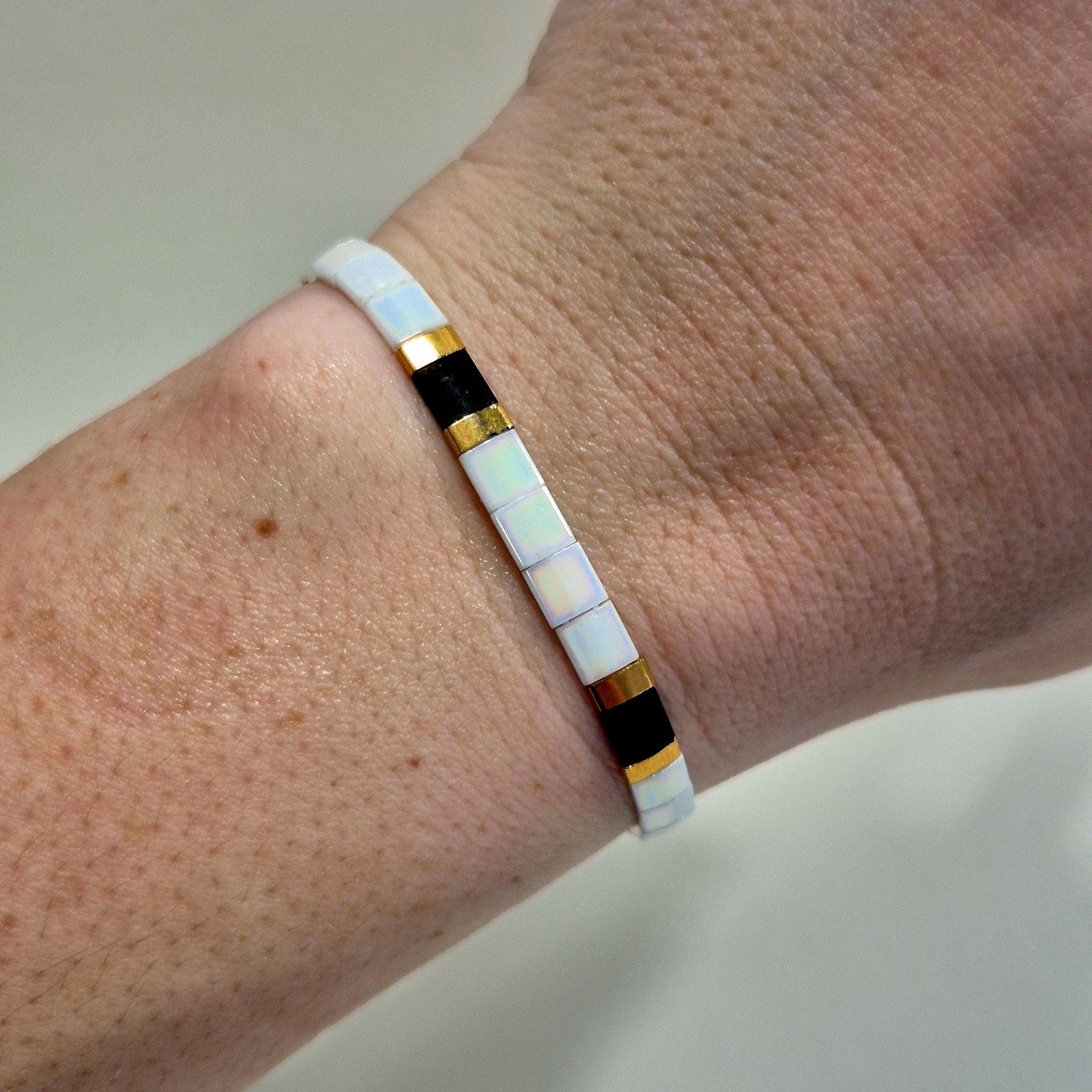 Jemný a svěží náramek v kombinaci bílé, zlaté a černé působí elegantně a lehce.