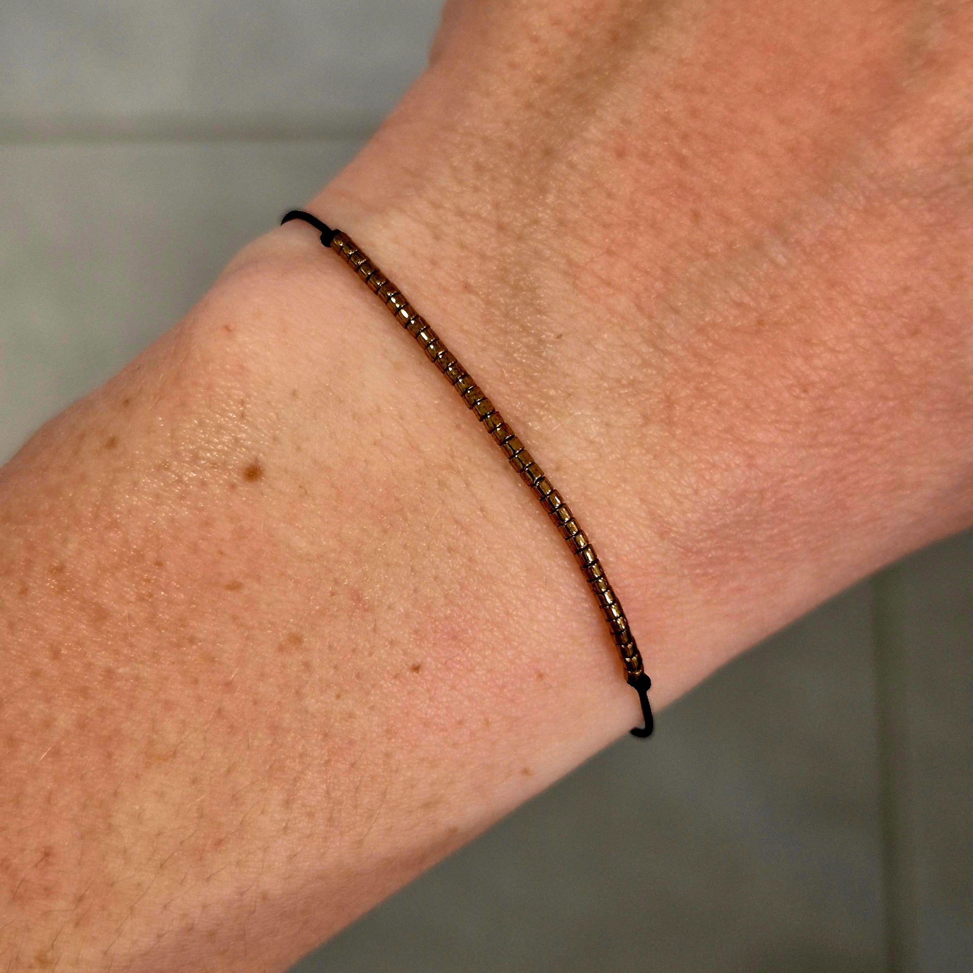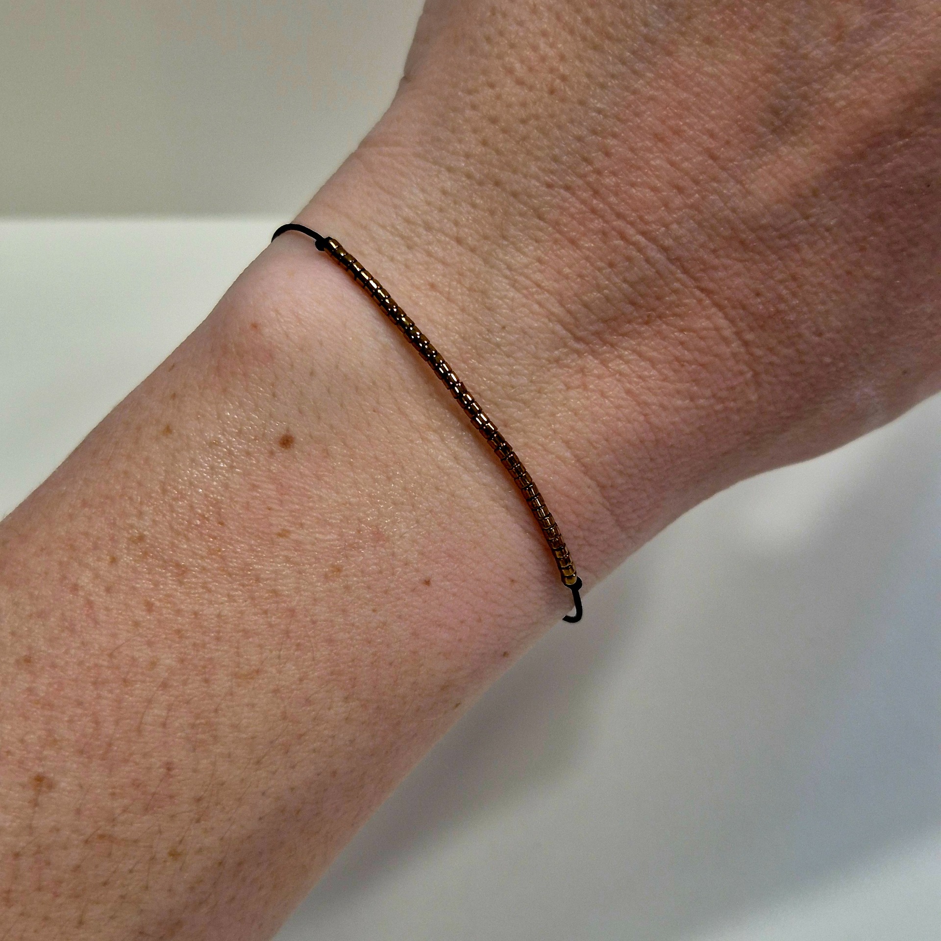 Jemný náramek z japonských Miyuki korálků v elegantním zlatém odstínu. Minimalistický design působí čistě a nadčasově, díky čemuž je ideální pro každodenní nošení i vrstvení s dalšími šperky.