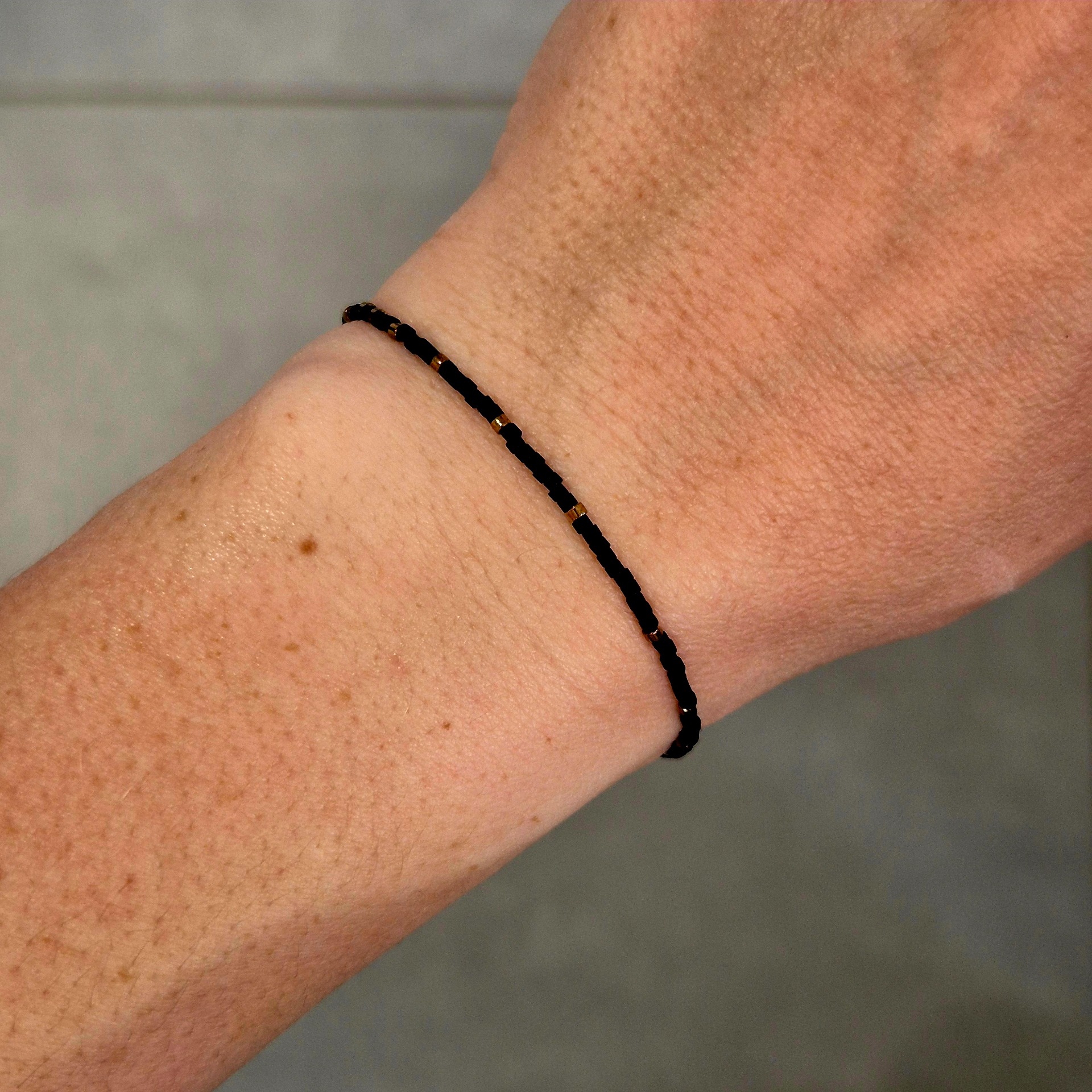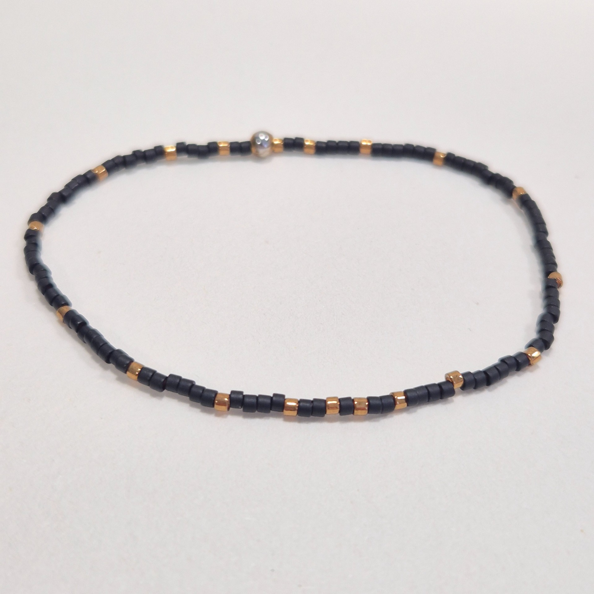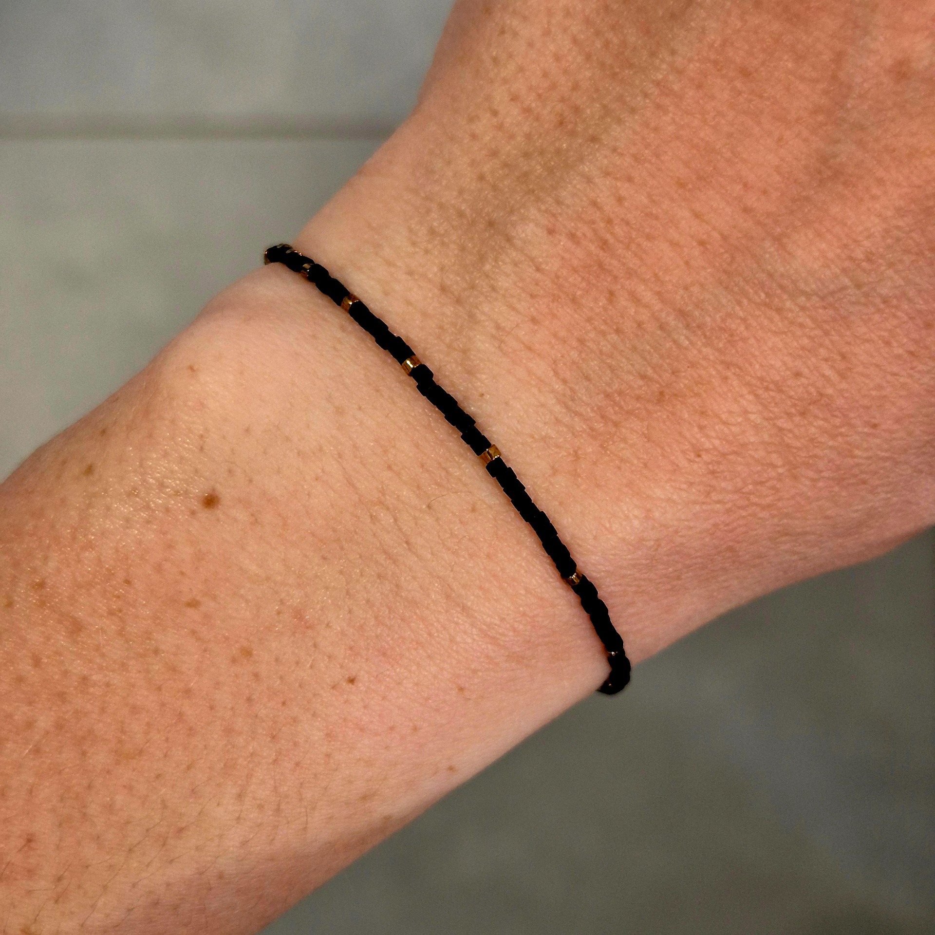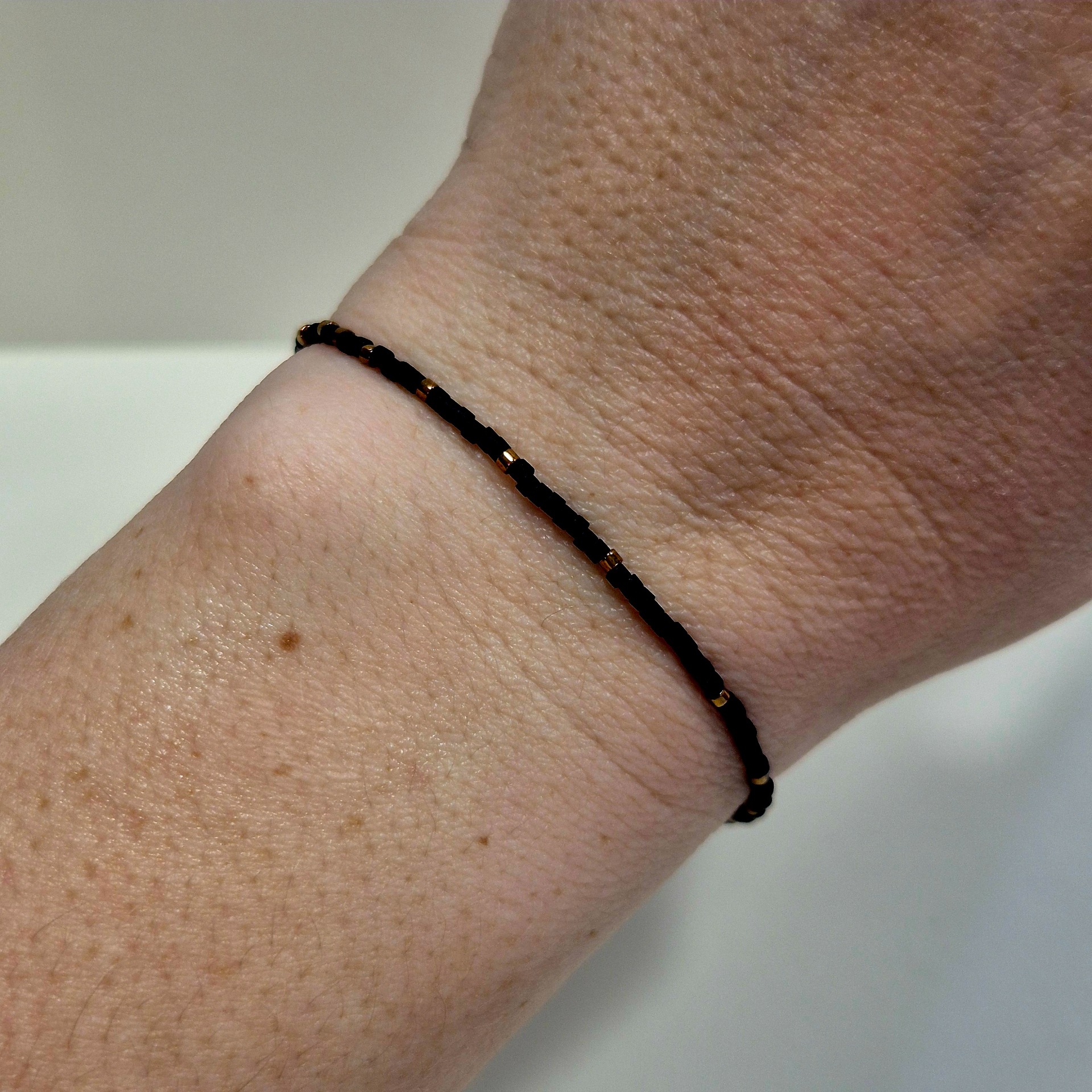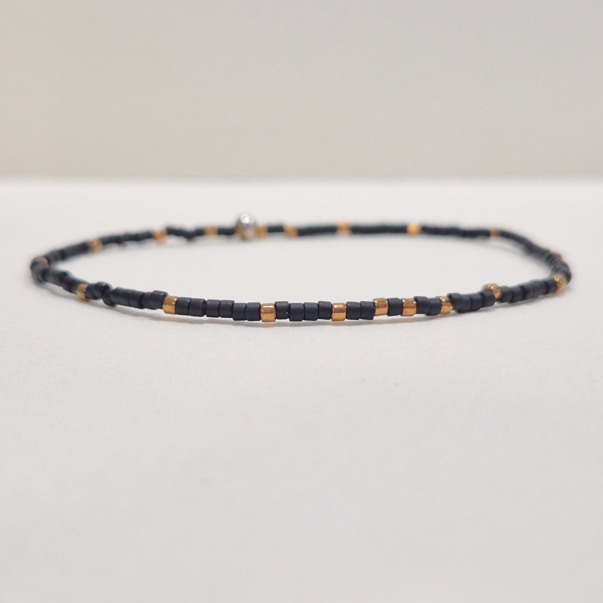 Jemný náramek z japonských Miyuki korálků v kombinaci matné černé a zlaté. Minimalistické střídání barev vytváří elegantní a nadčasový design, který se snadno kombinuje s dalšími šperky i outfity.