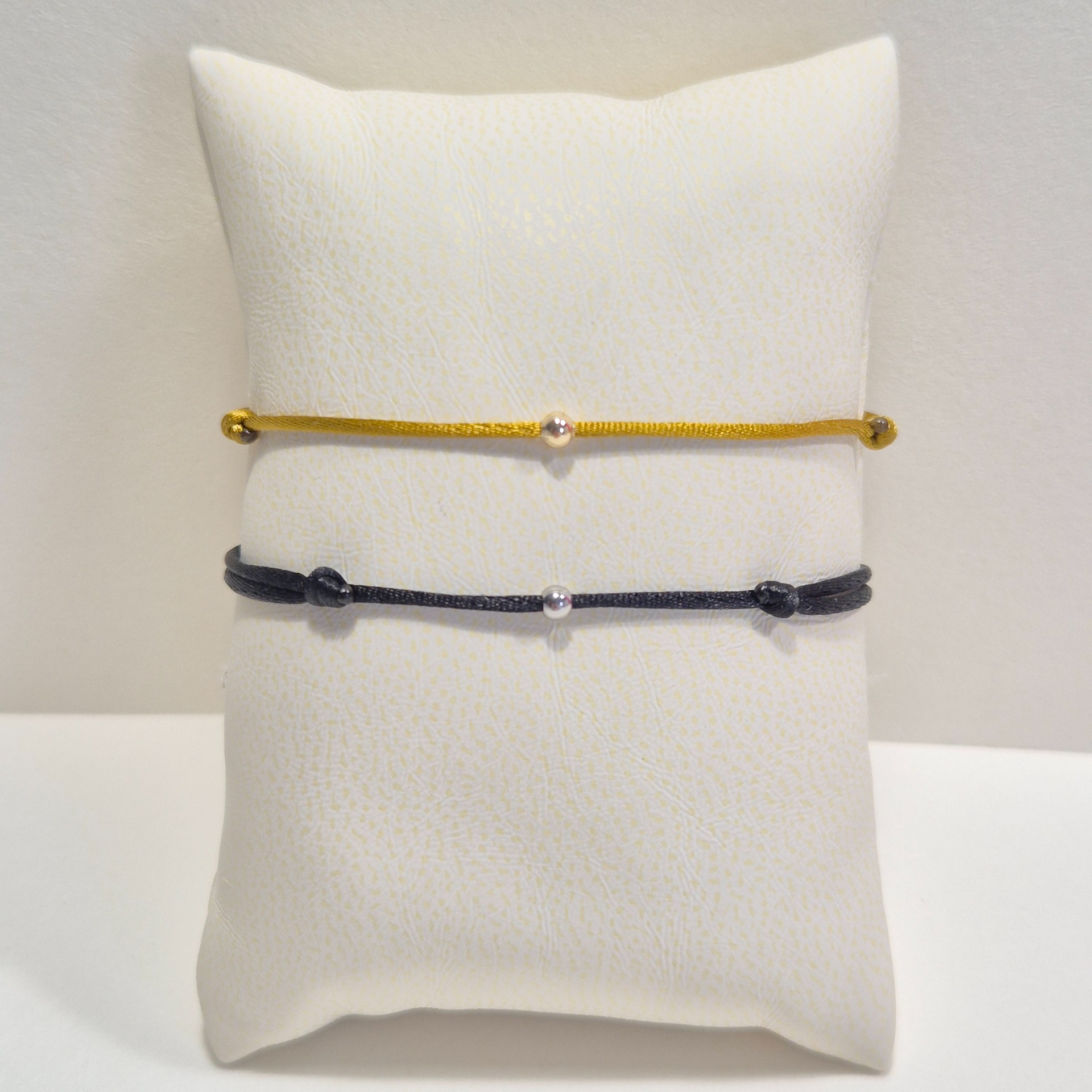 Náramky jsou vyrobeny z kvalitní polyesterové šňůrky, která je příjemná na nošení a odolná při každodenním používání. Dominantou je drobný kovový detail – kulička – která náramku dodává jemný význam i nadčasový vzhled.