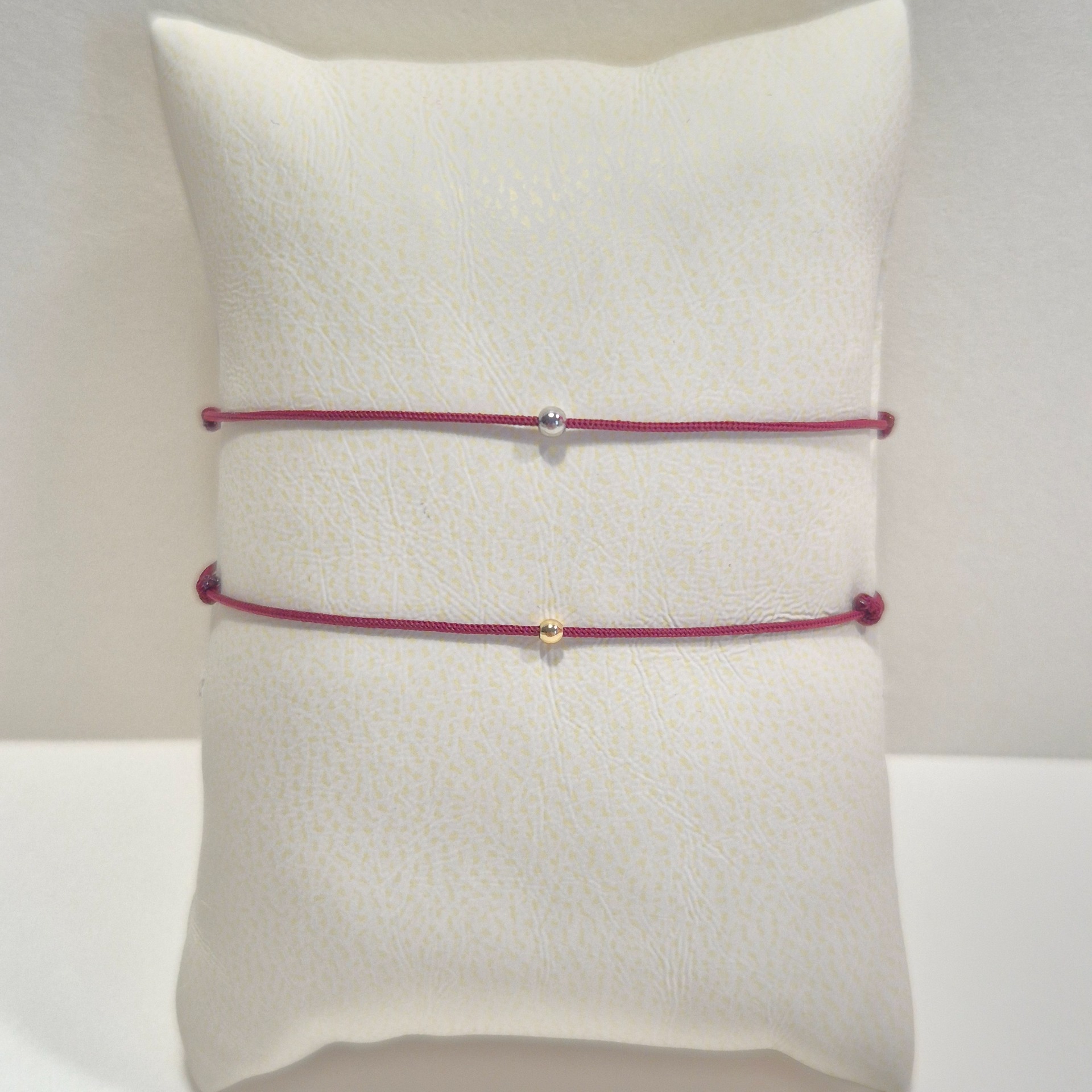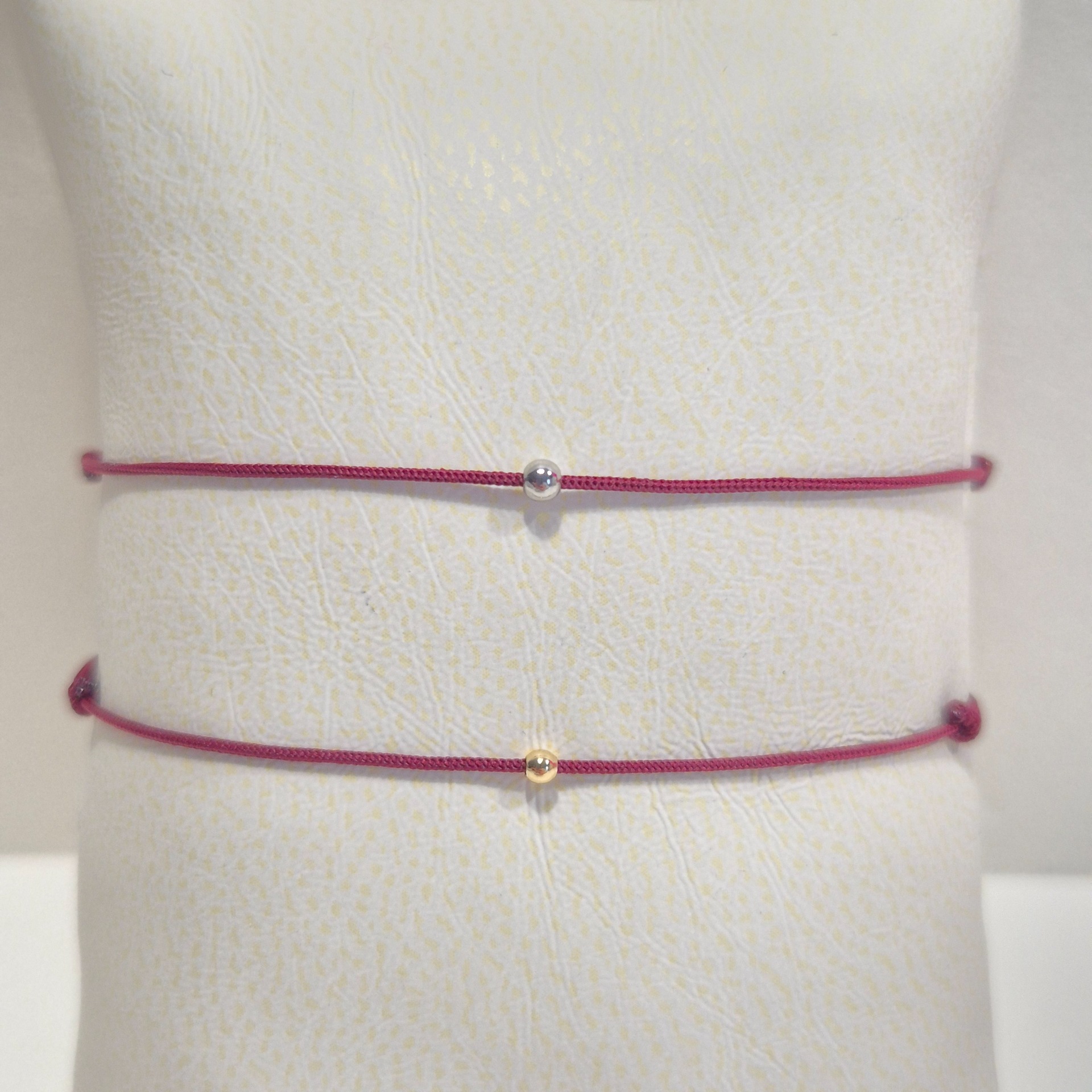 Náramky jsou vyrobeny z kvalitní polyesterové šňůrky, která je příjemná na nošení a odolná při každodenním používání. Dominantou je drobný kovový detail – kulička – která náramku dodává jemný význam i nadčasový vzhled.