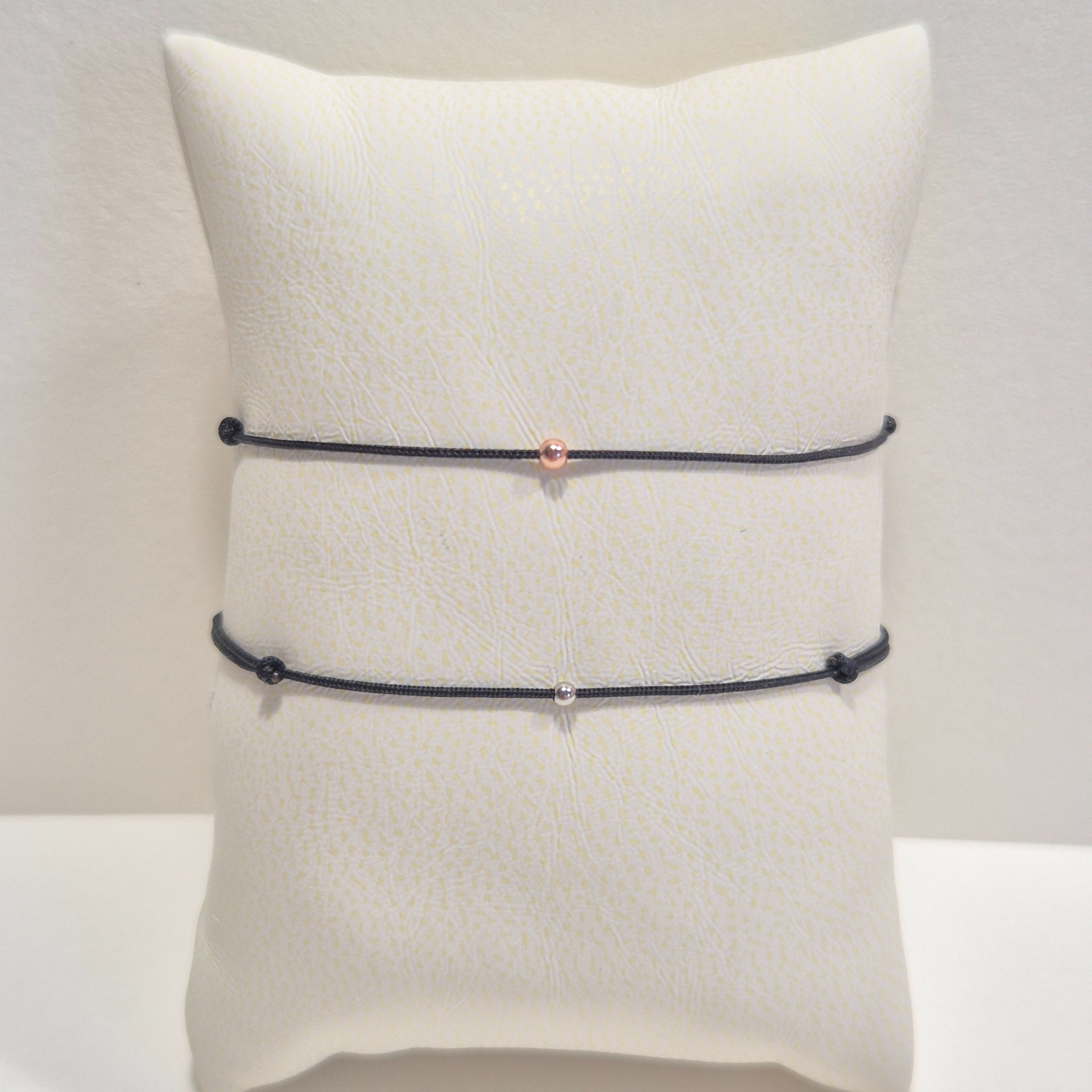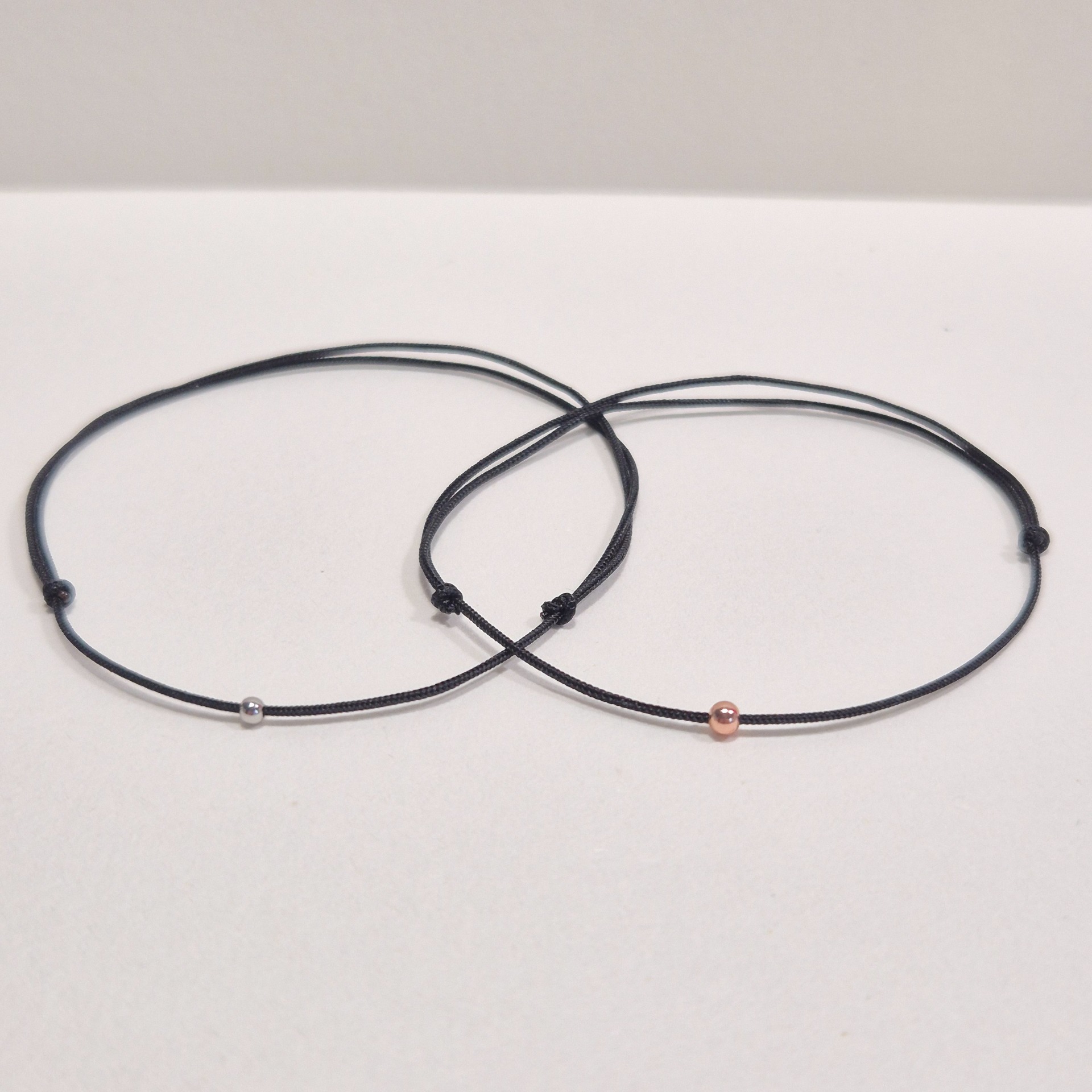 Náramky jsou vyrobeny z kvalitní polyesterové šňůrky, která je příjemná na nošení a odolná při každodenním používání. Dominantou je drobný kovový detail – kulička – která náramku dodává jemný význam i nadčasový vzhled.