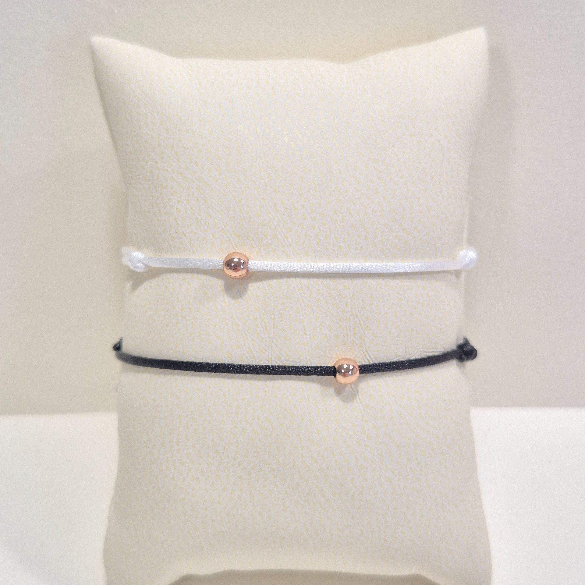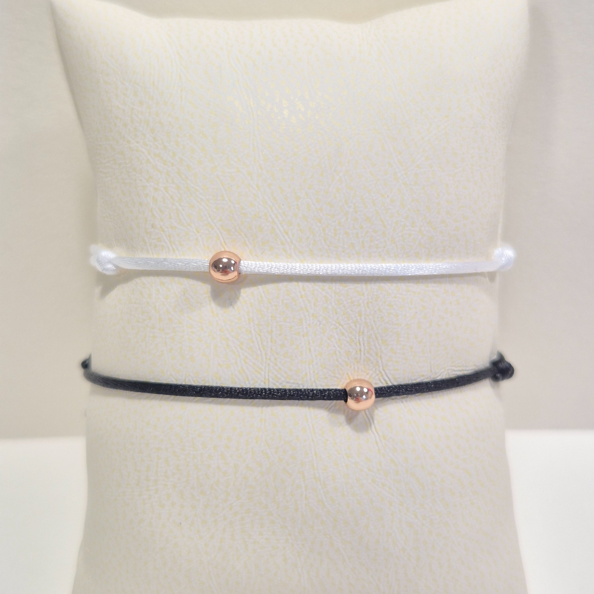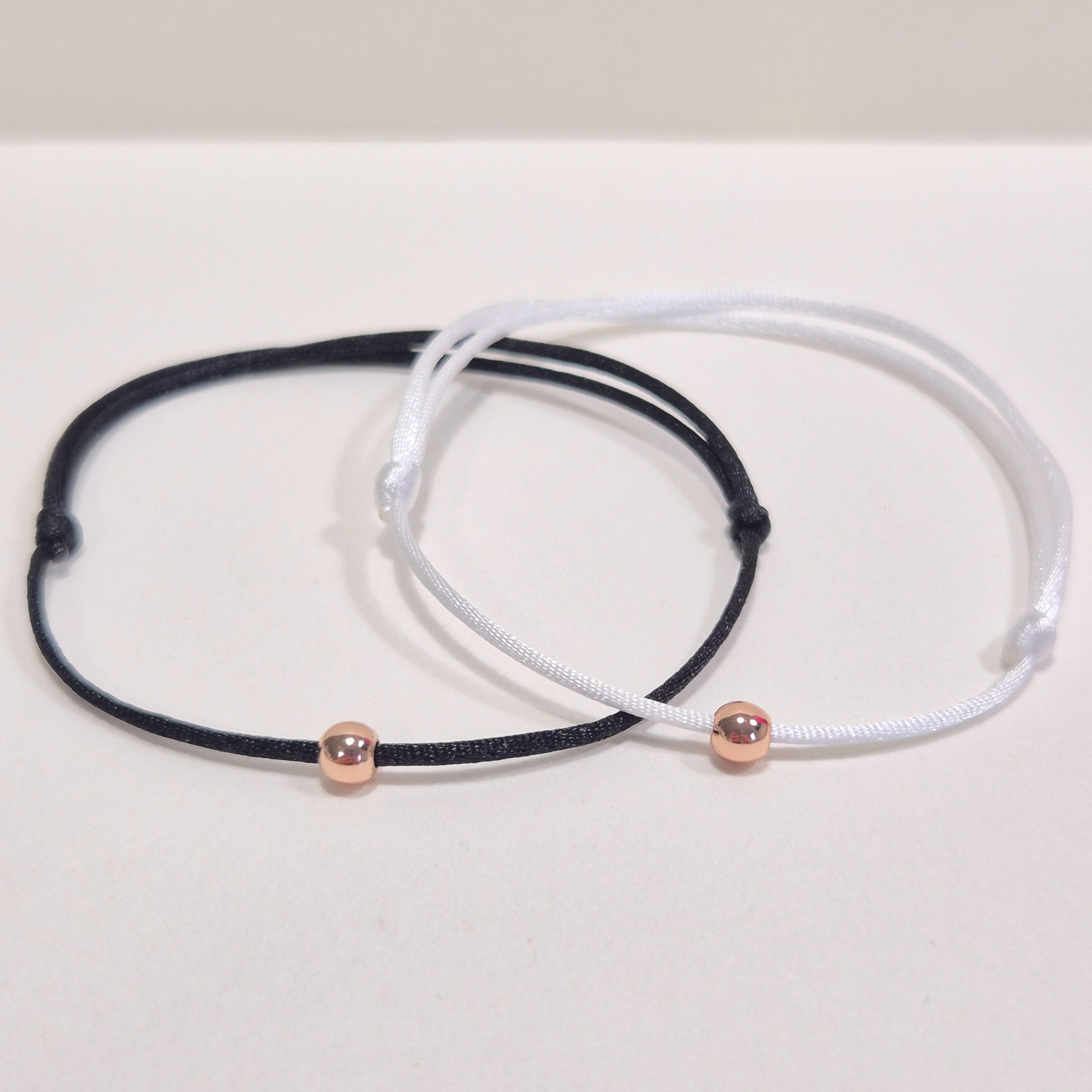 Náramky jsou vyrobeny z kvalitní polyesterové šňůrky, která je příjemná na nošení a odolná při každodenním používání. Dominantou je drobný kovový detail – kulička – která náramku dodává jemný význam i nadčasový vzhled.