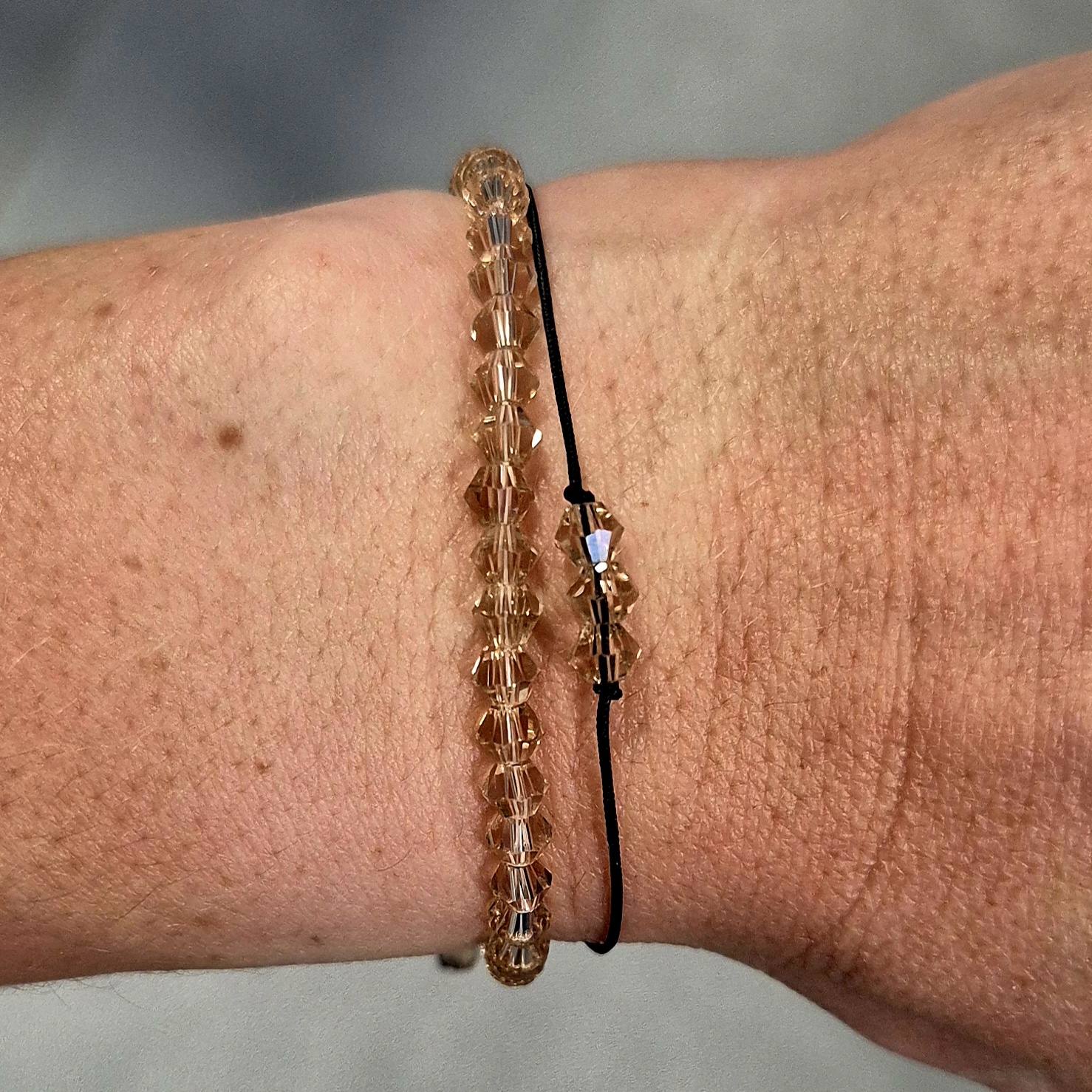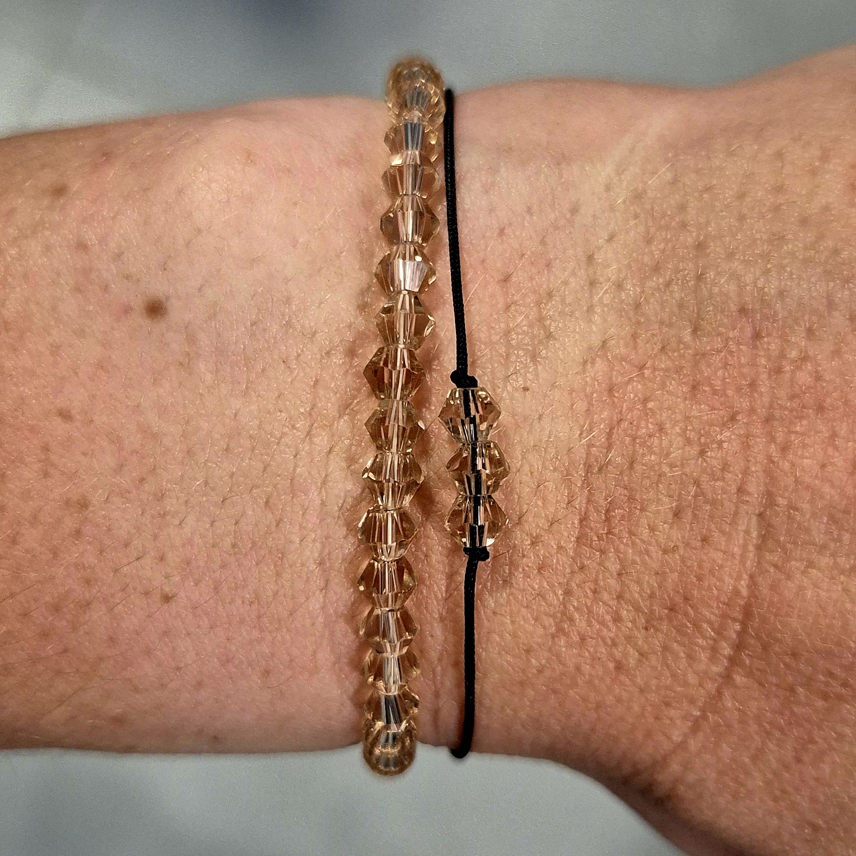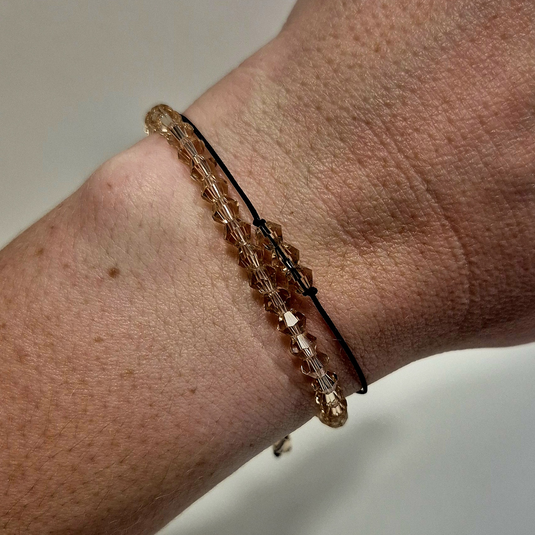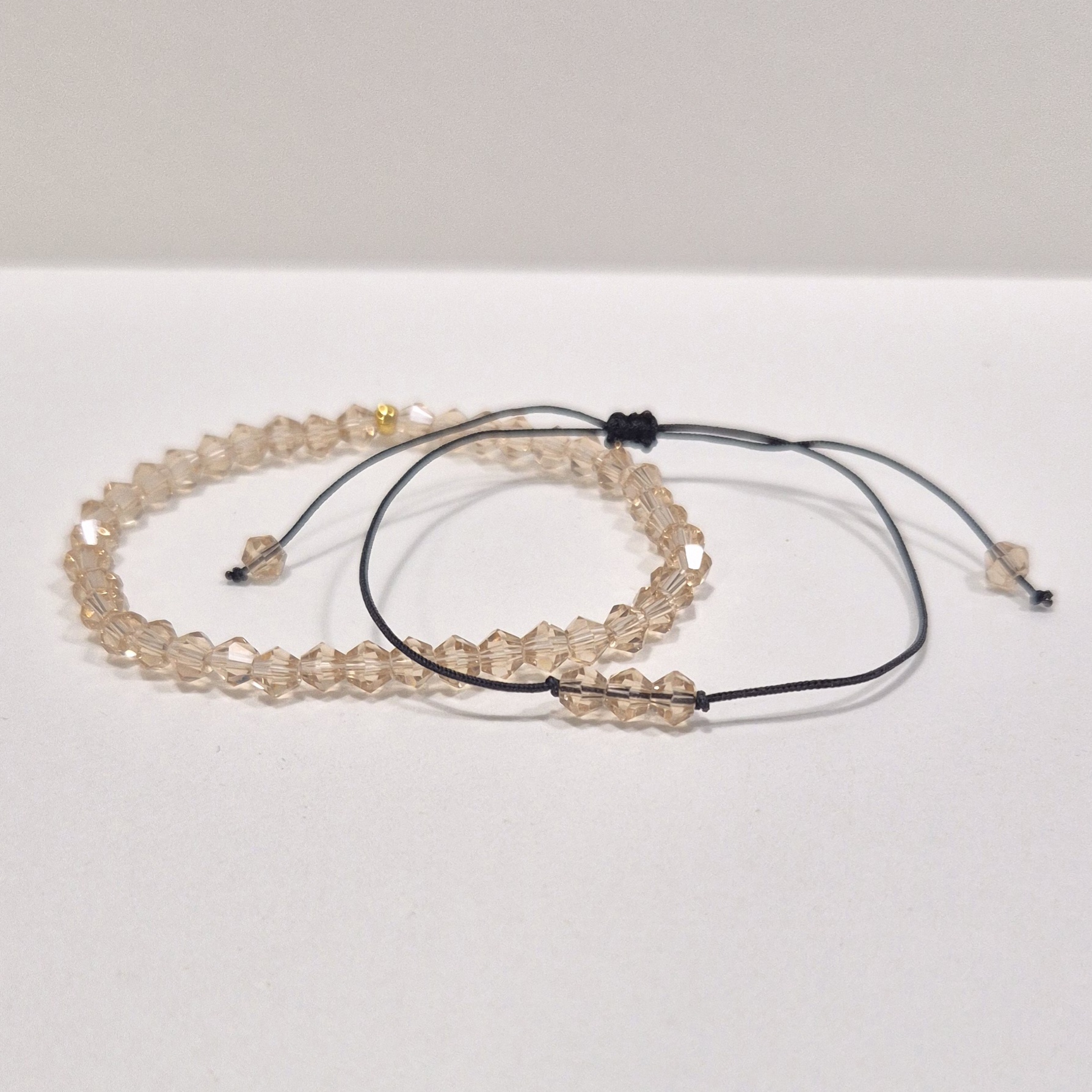 První náramek je na gumičce, tvořený broušenými korálky v barvě šampaň – jemný lesk, který působí elegantně a nadčasově.