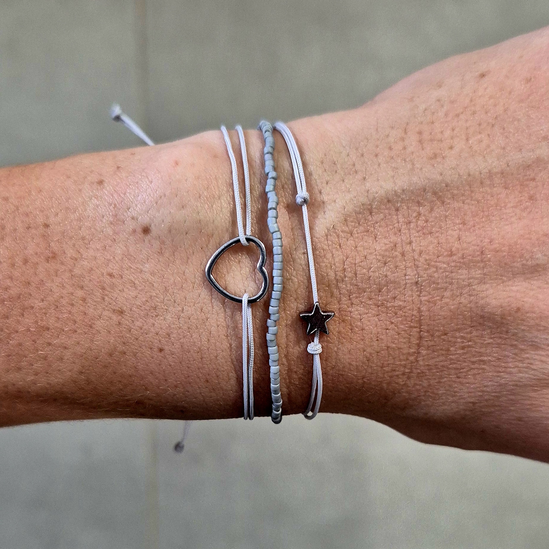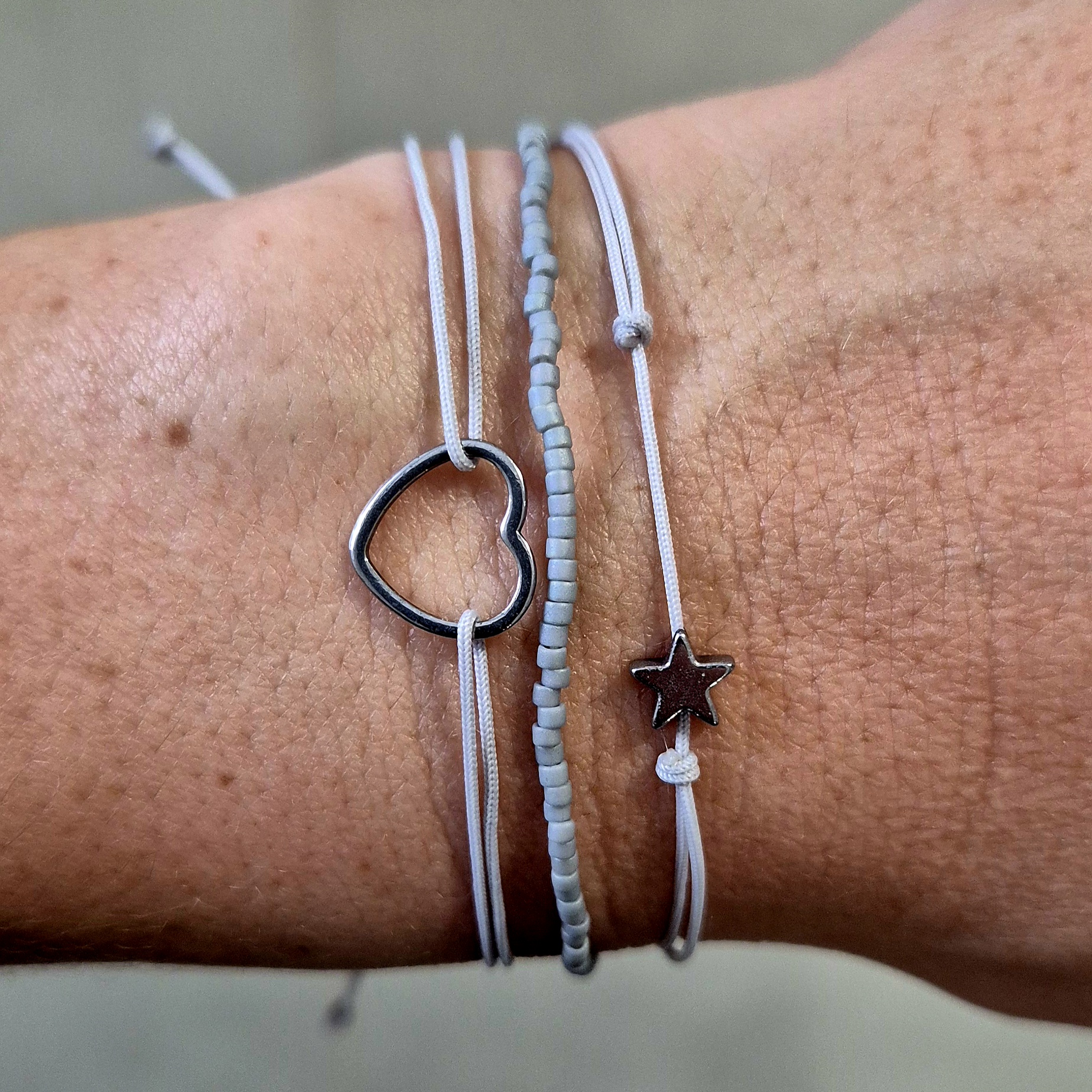 Tři náramky v jemných odstínech šedé, které spolu dokonale ladí a působí elegantně, klidně a nadčasově.