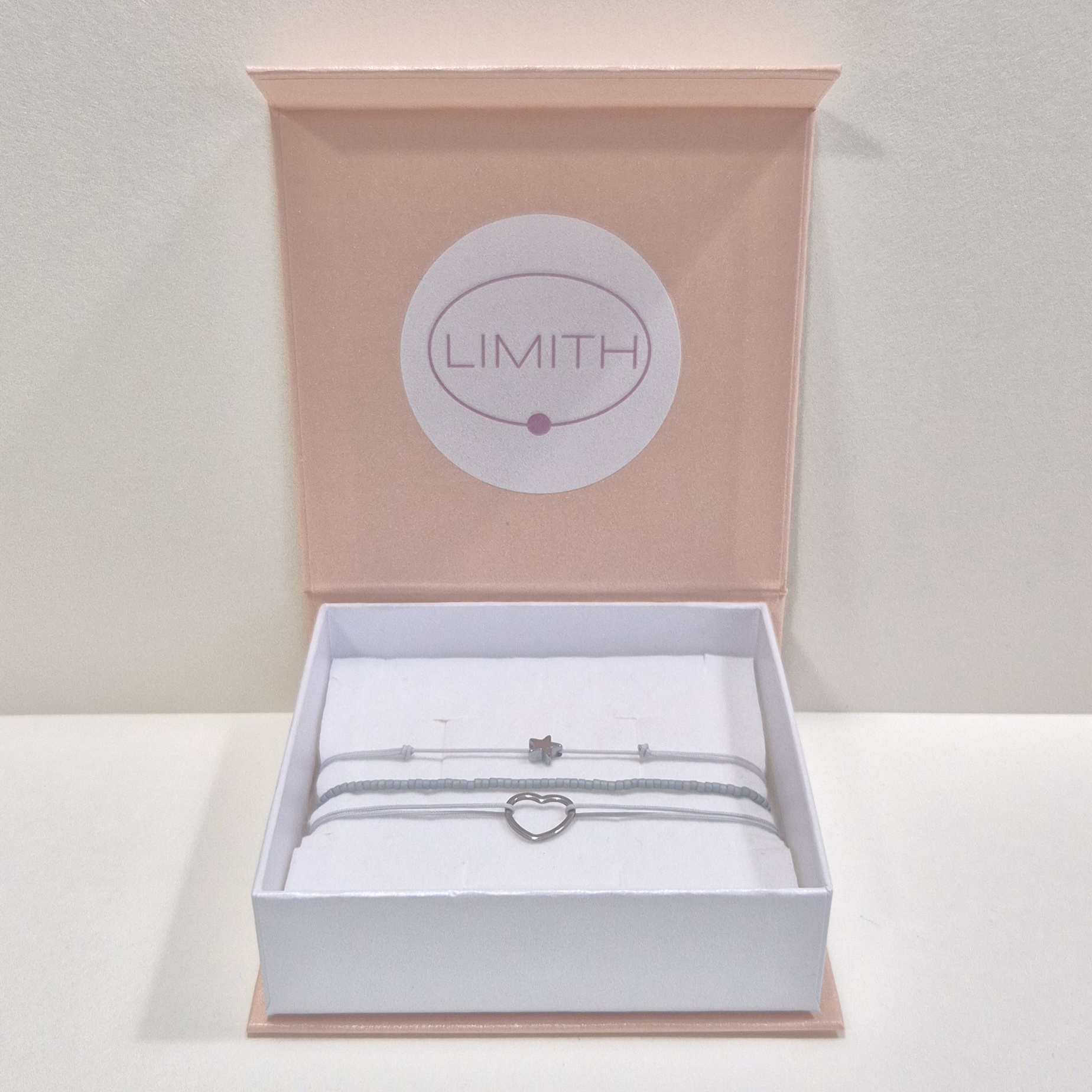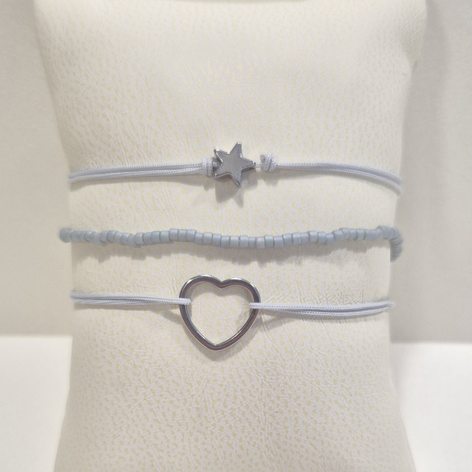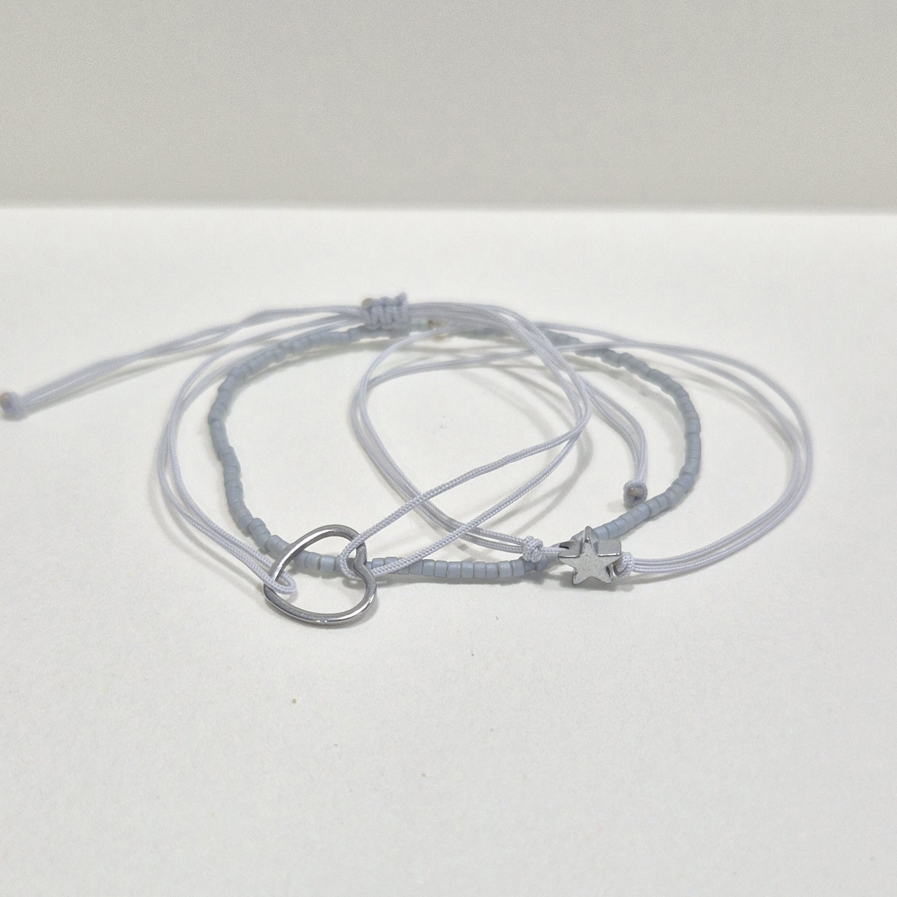 První náramek je šňůrkový, zdobený srdíčkem z nerezové oceli – symbolem lásky a propojení.