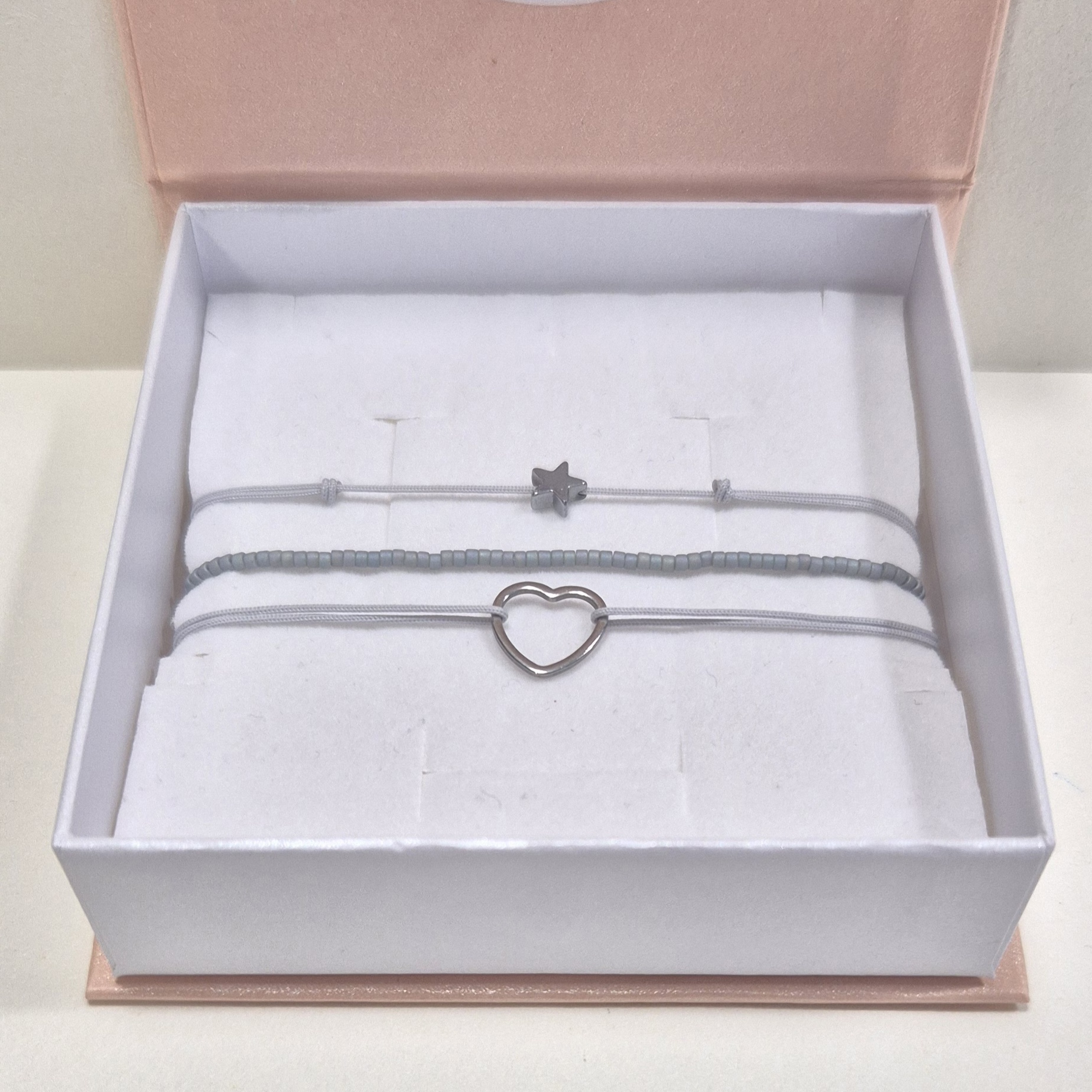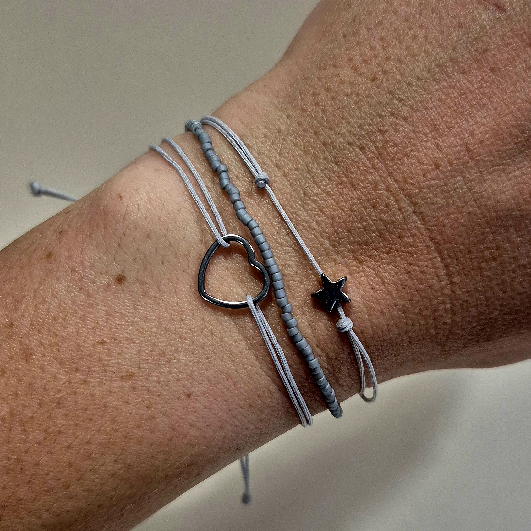 Třetí náramek tvoří šedá šňůrka s hvězdičkou ze syntetického hematitu ve stříbrné barvě, doplněný stahovacím zapínáním pro snadné přizpůsobení zápěstí.