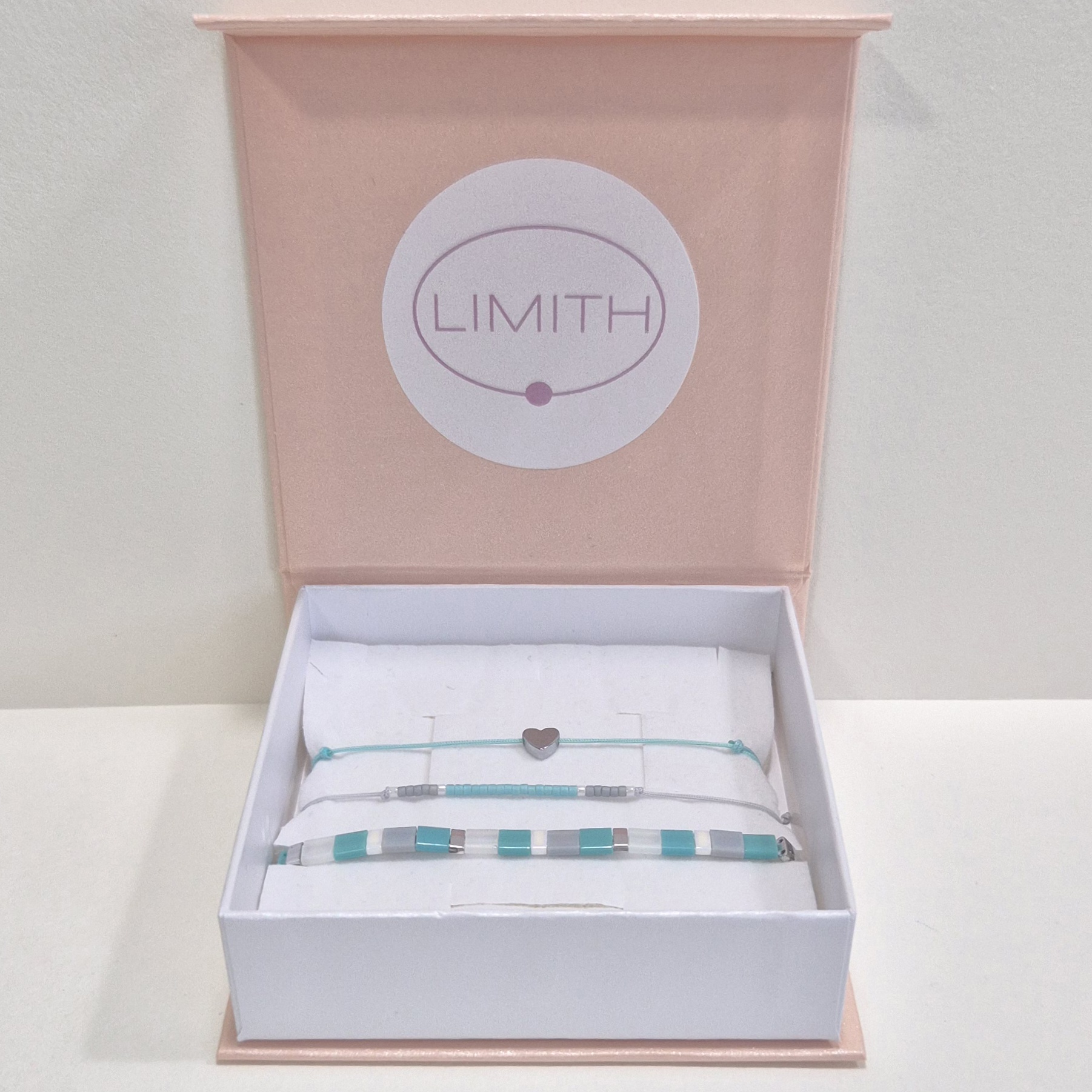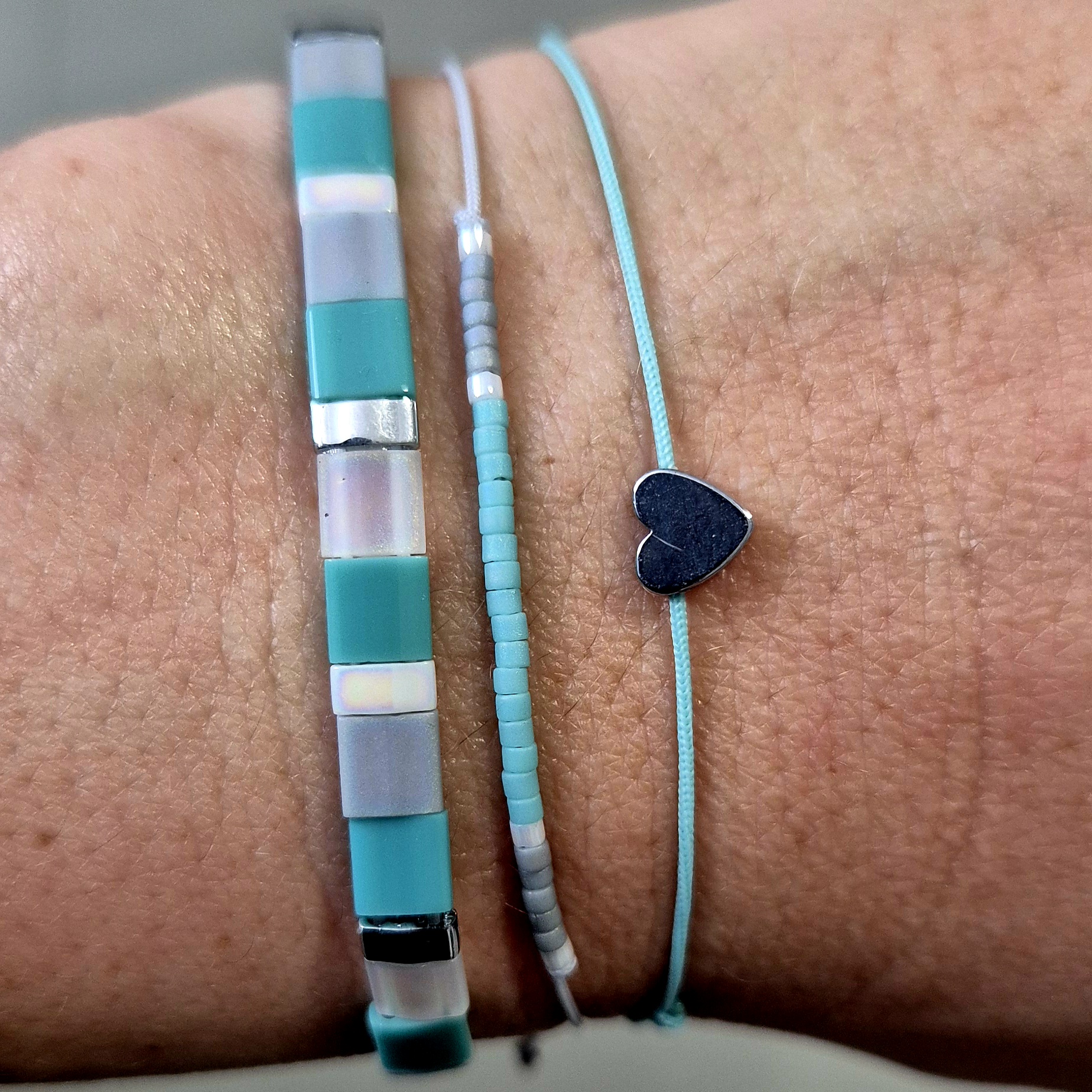 Třetí náramek je šňůrkový v tyrkysové barvě, zdobený srdíčkem ze syntetického hematitu ve stříbrném odstínu – symbolem rovnováhy, klidu a propojení.