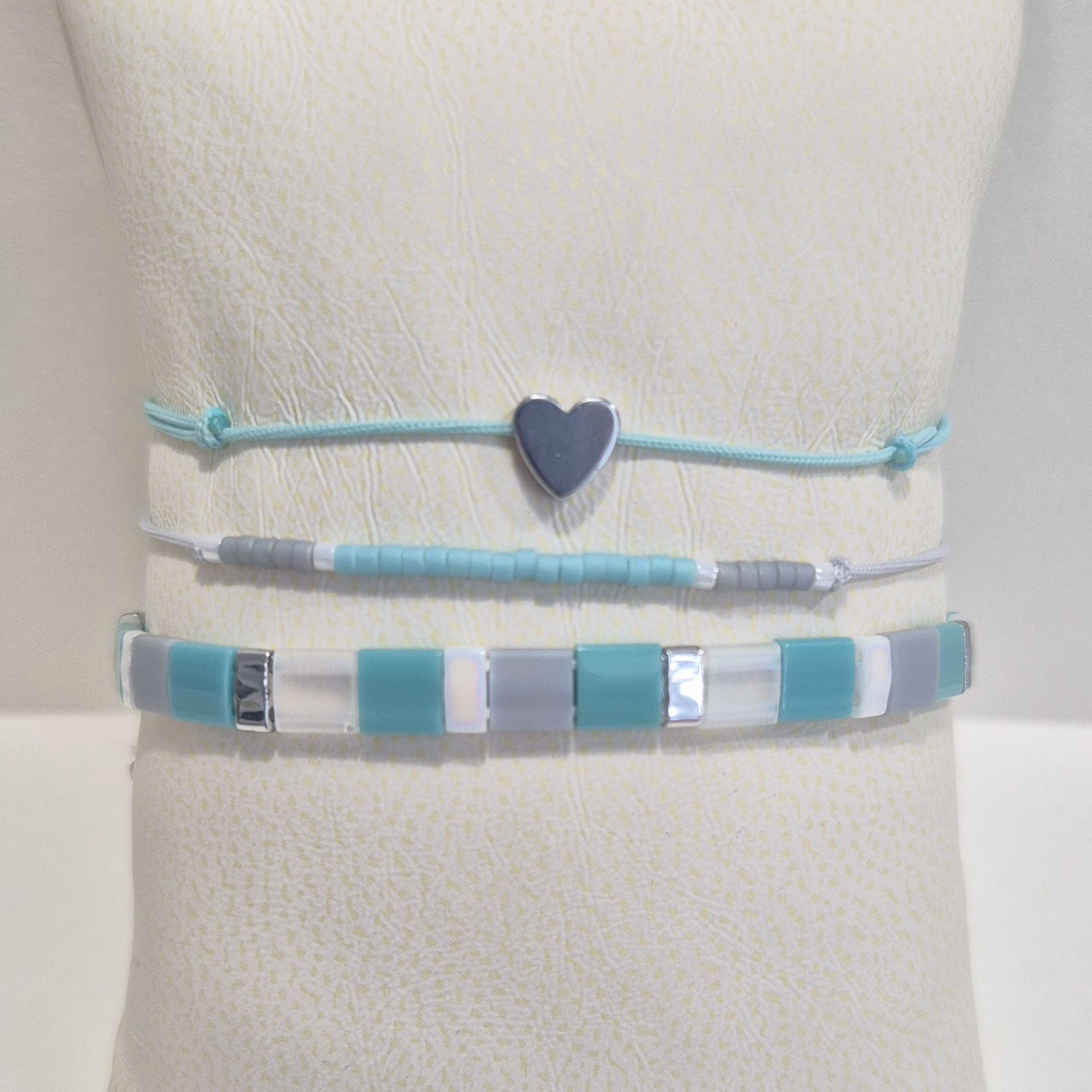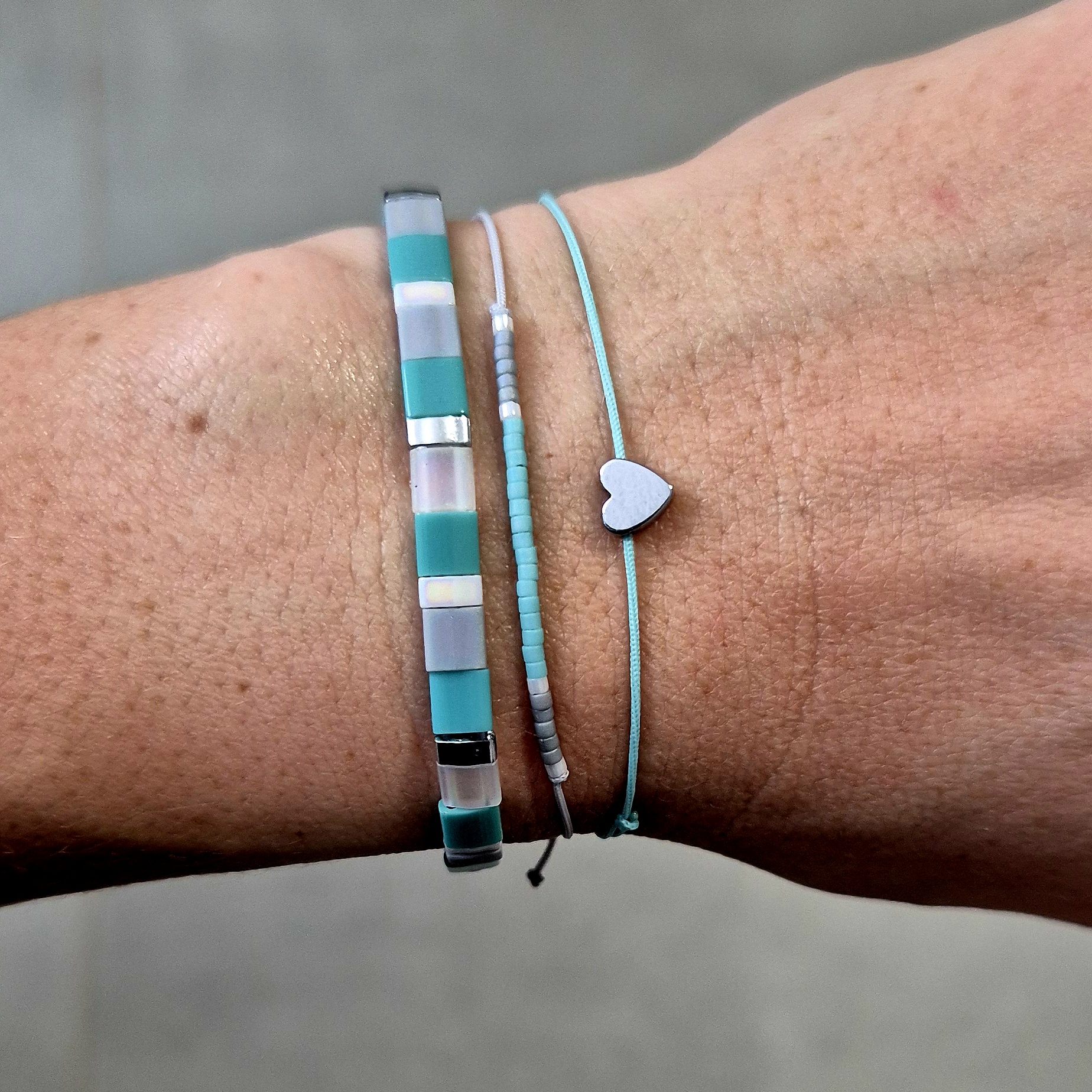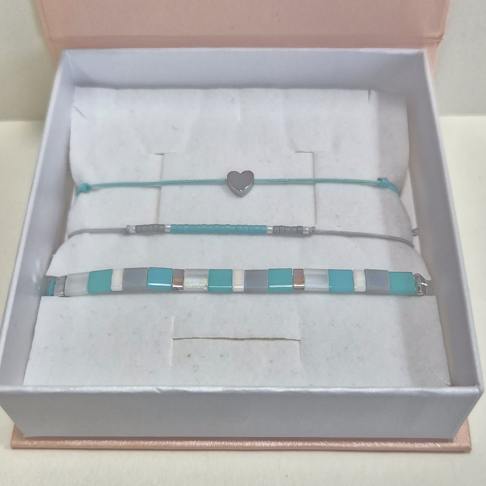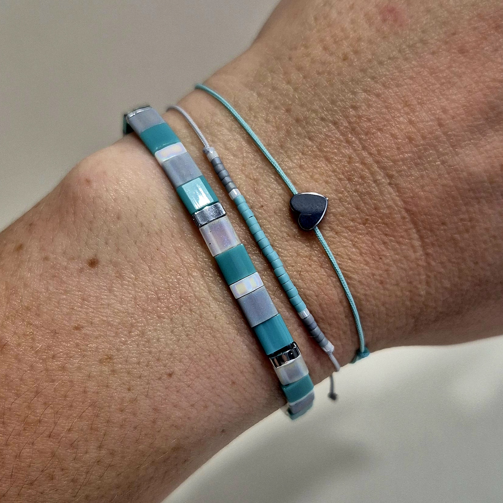 Tři náramky, které spolu ladí v jemných tónech tyrkysové, šedé a stříbrné.
