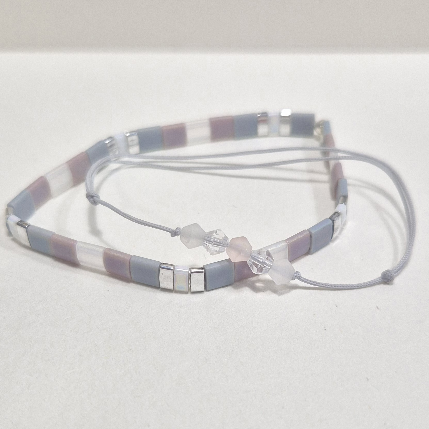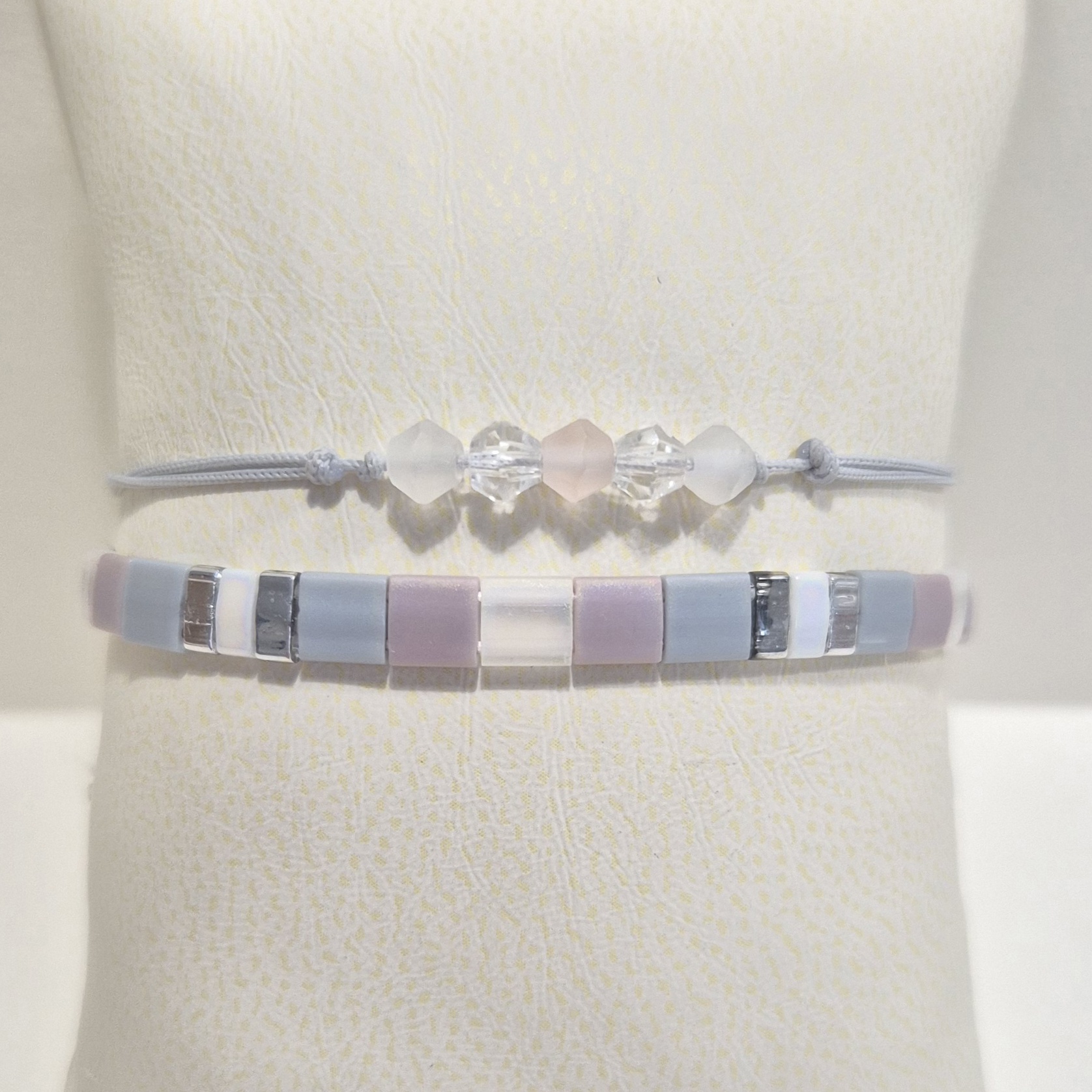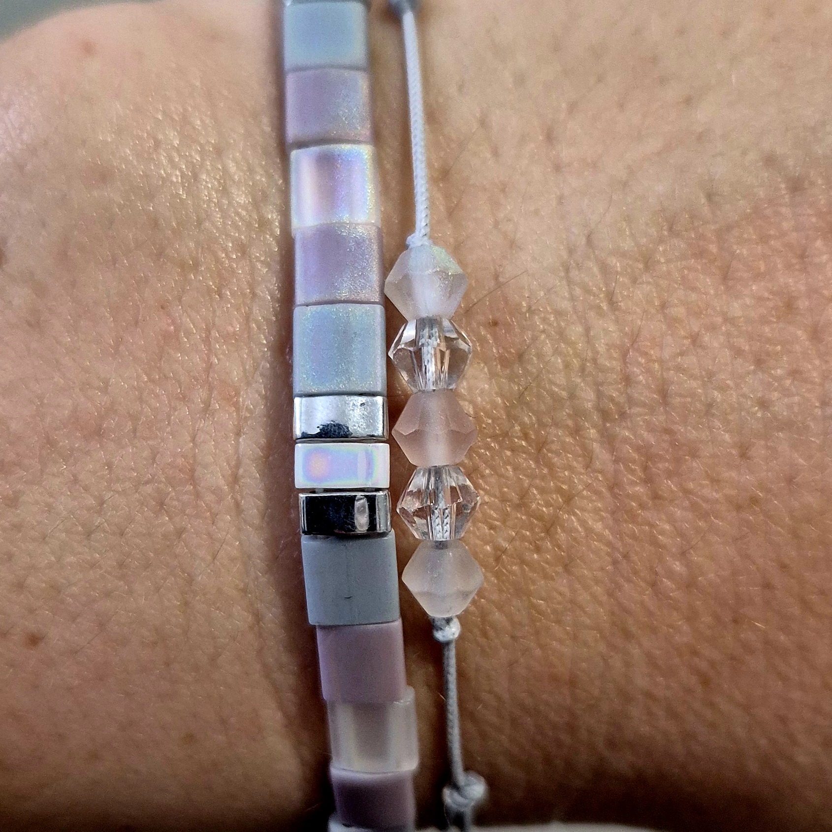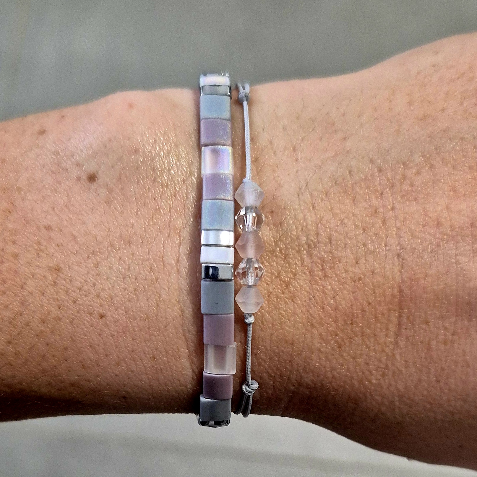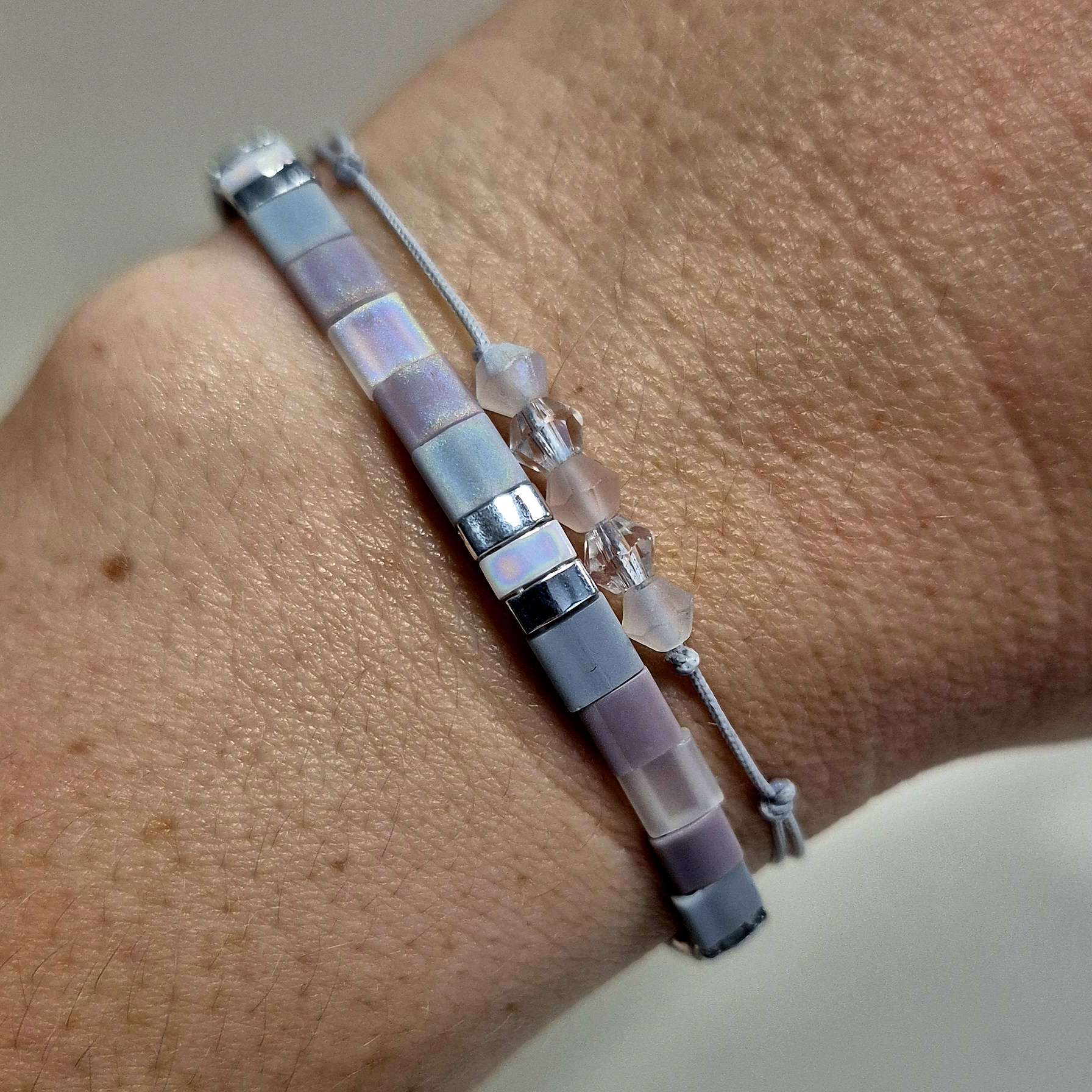 Dva náramky, které spolu tvoří elegantní a vyvážený celek v odstínech šedé, světle fialové a stříbrné.