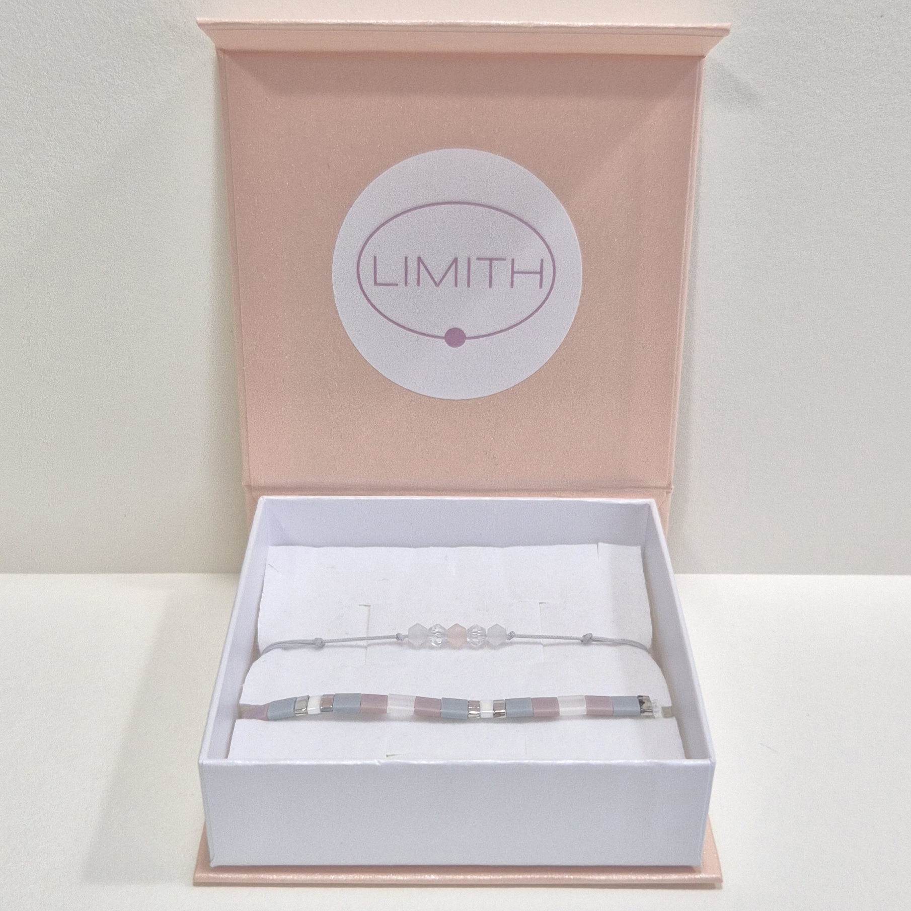 Druhý náramek je šňůrkový, zdobený matnými broušenými korálky (imitace Swarovski) a má stahovací zapínání, díky kterému se snadno přizpůsobí zápěstí.