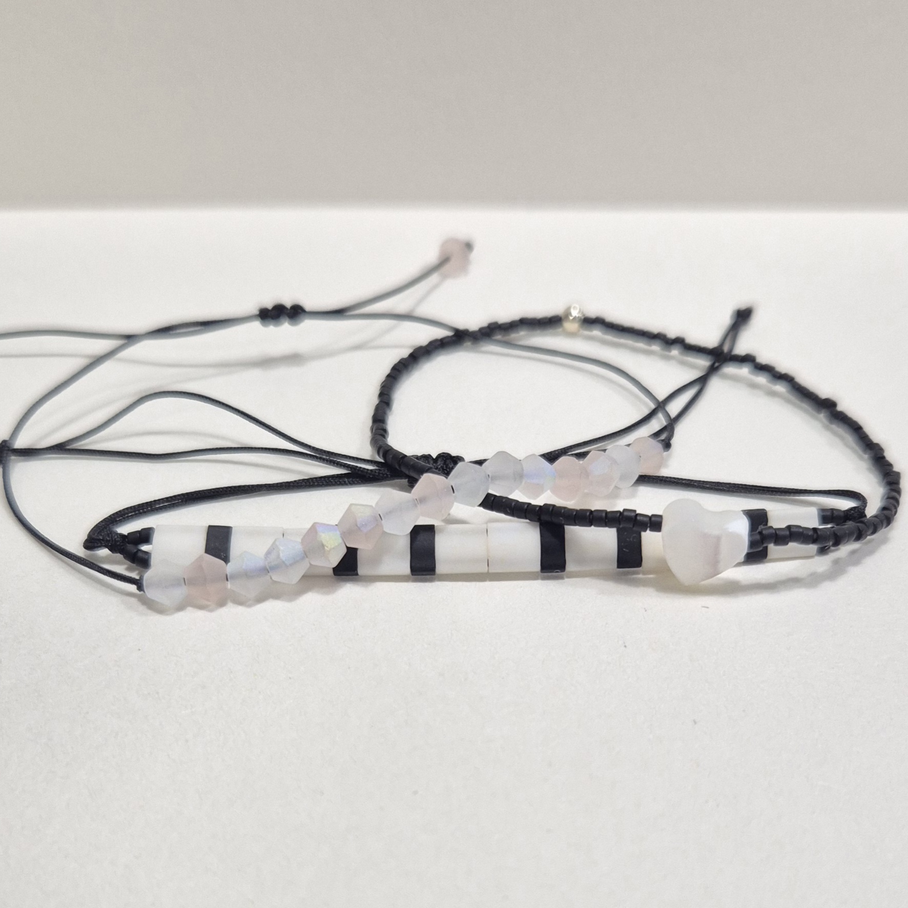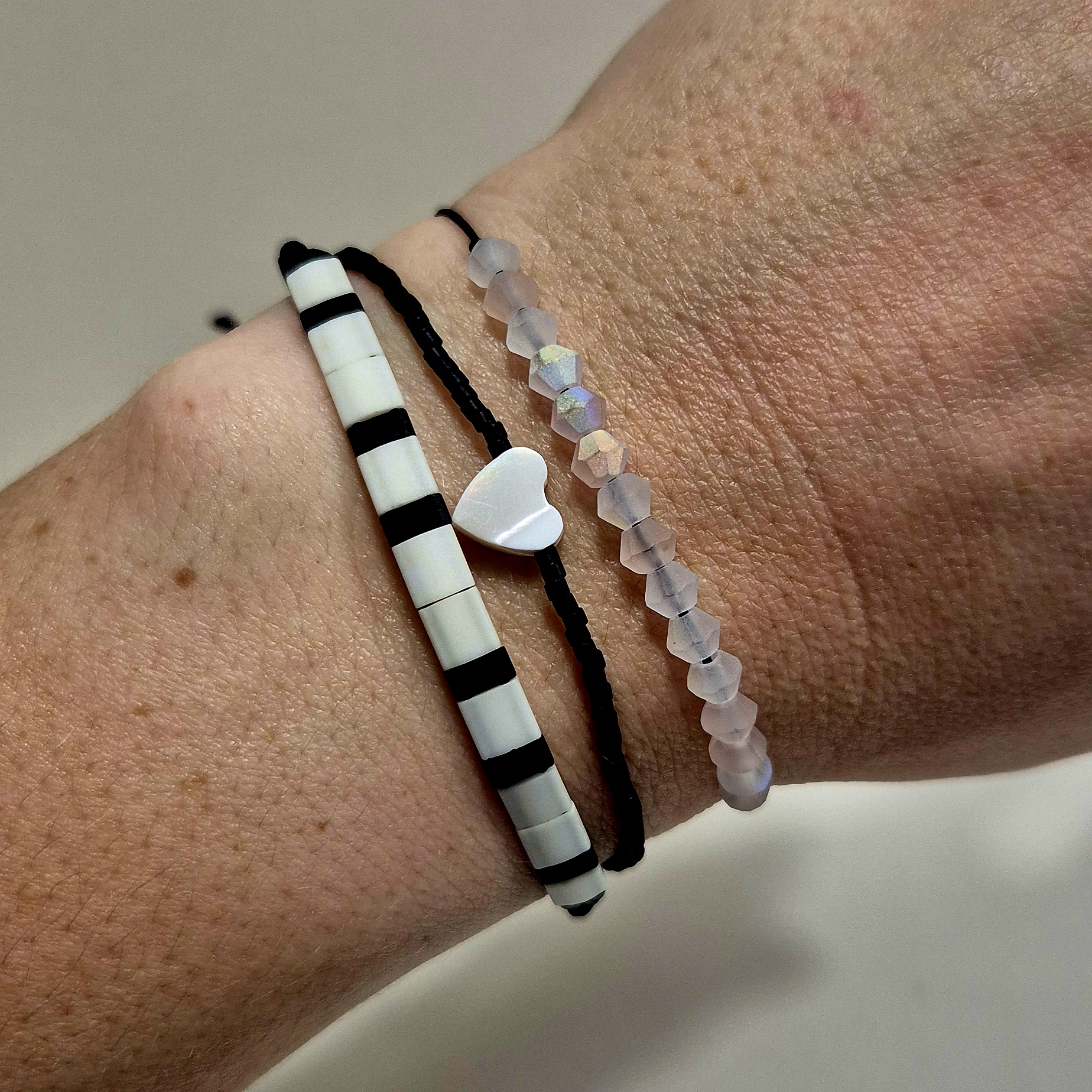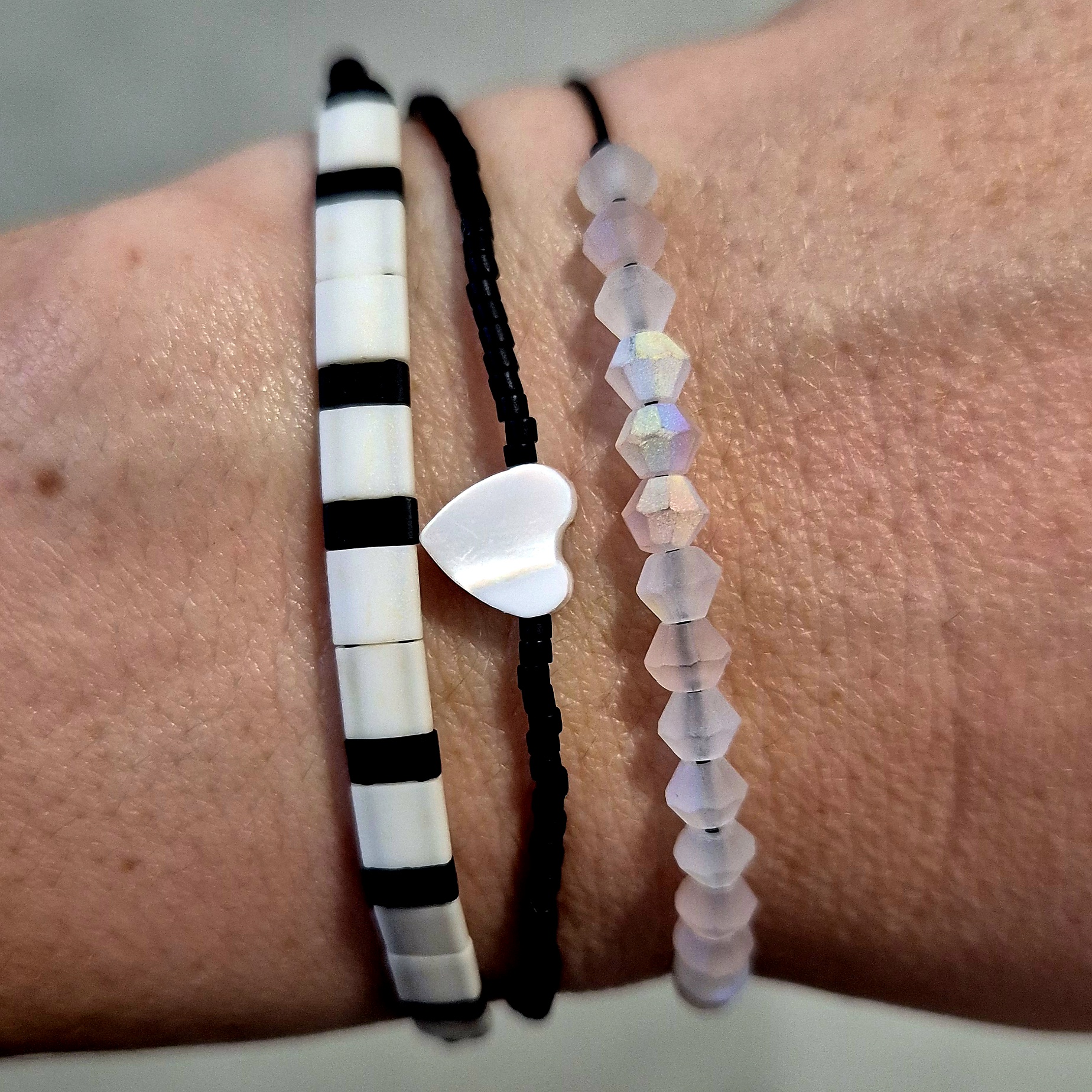 Druhý náramek je z černých Miyuki korálků navlečených na gumičce, doplněný o bílé srdce z perleti, které dodává celému setu něžný lesk.