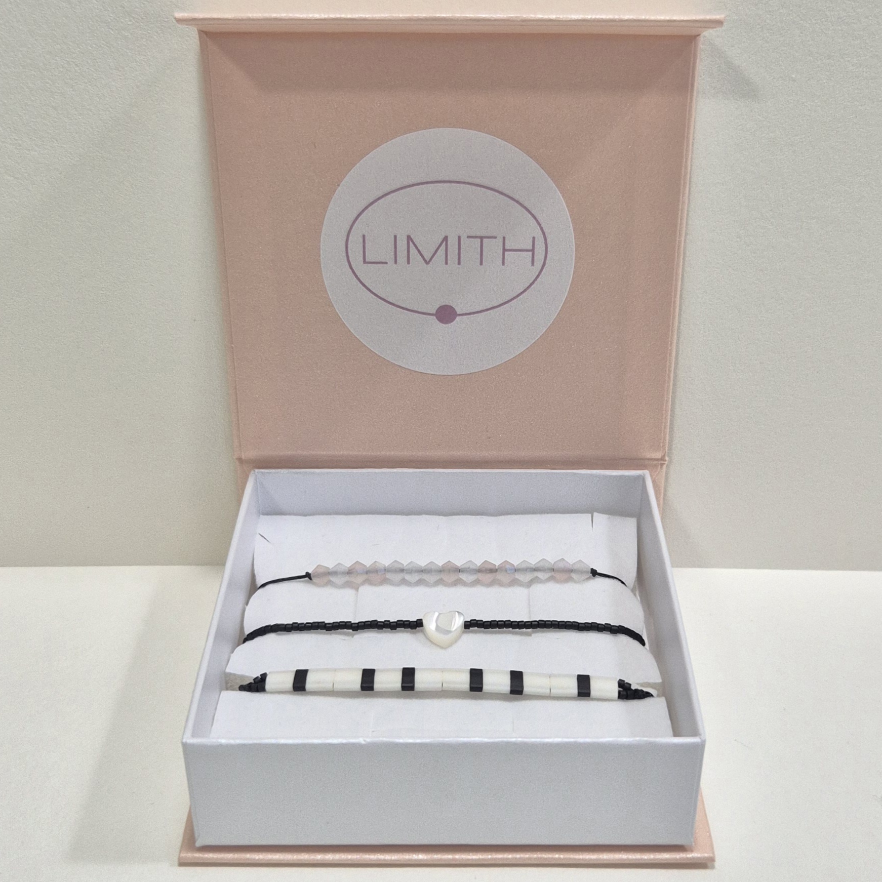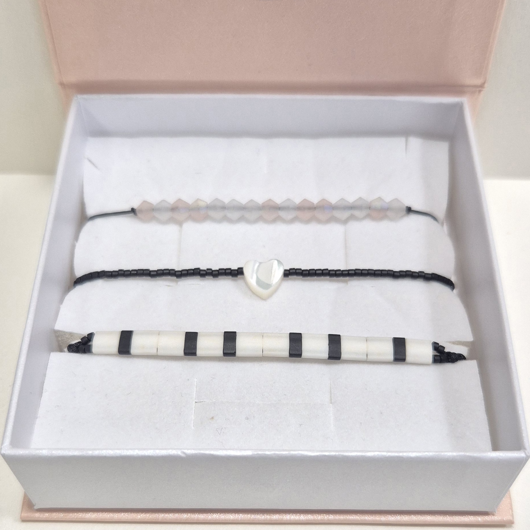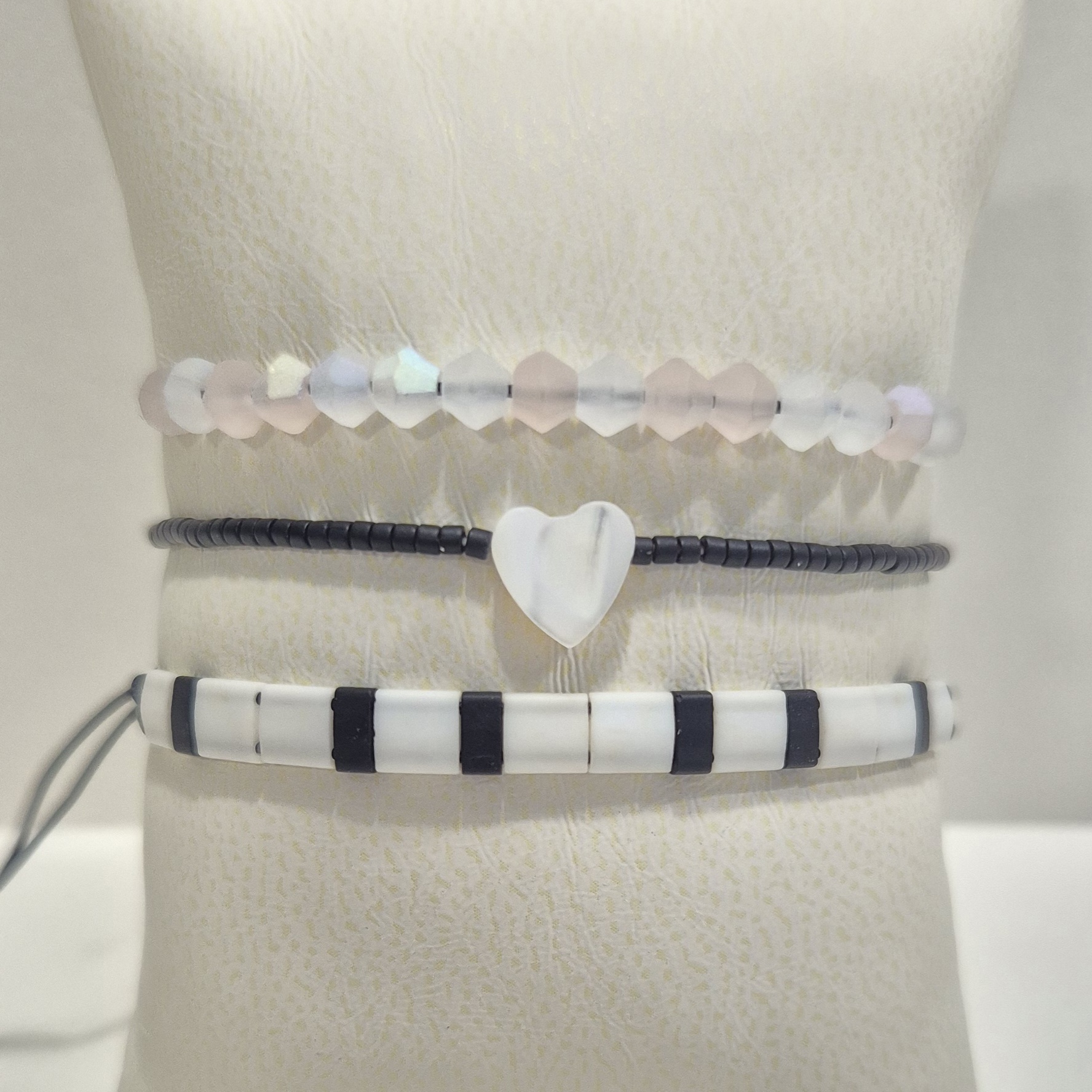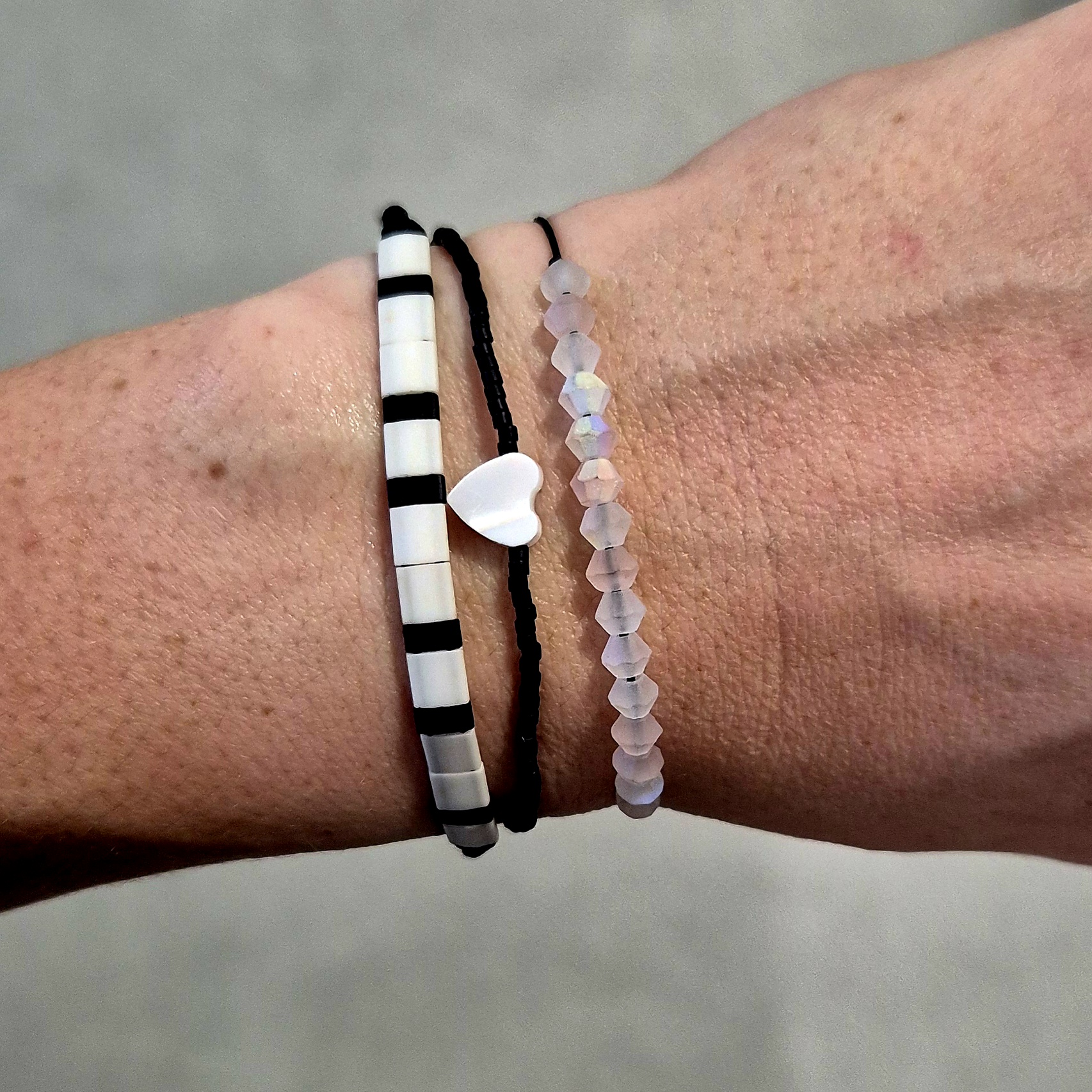 Druhý náramek je z černých Miyuki korálků navlečených na gumičce, doplněný o bílé srdce z perleti, které dodává celému setu něžný lesk.