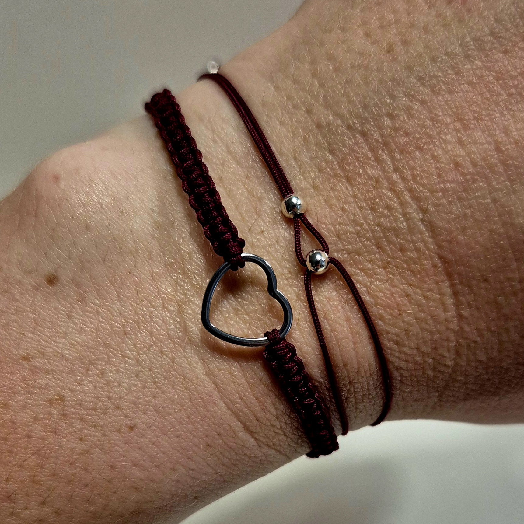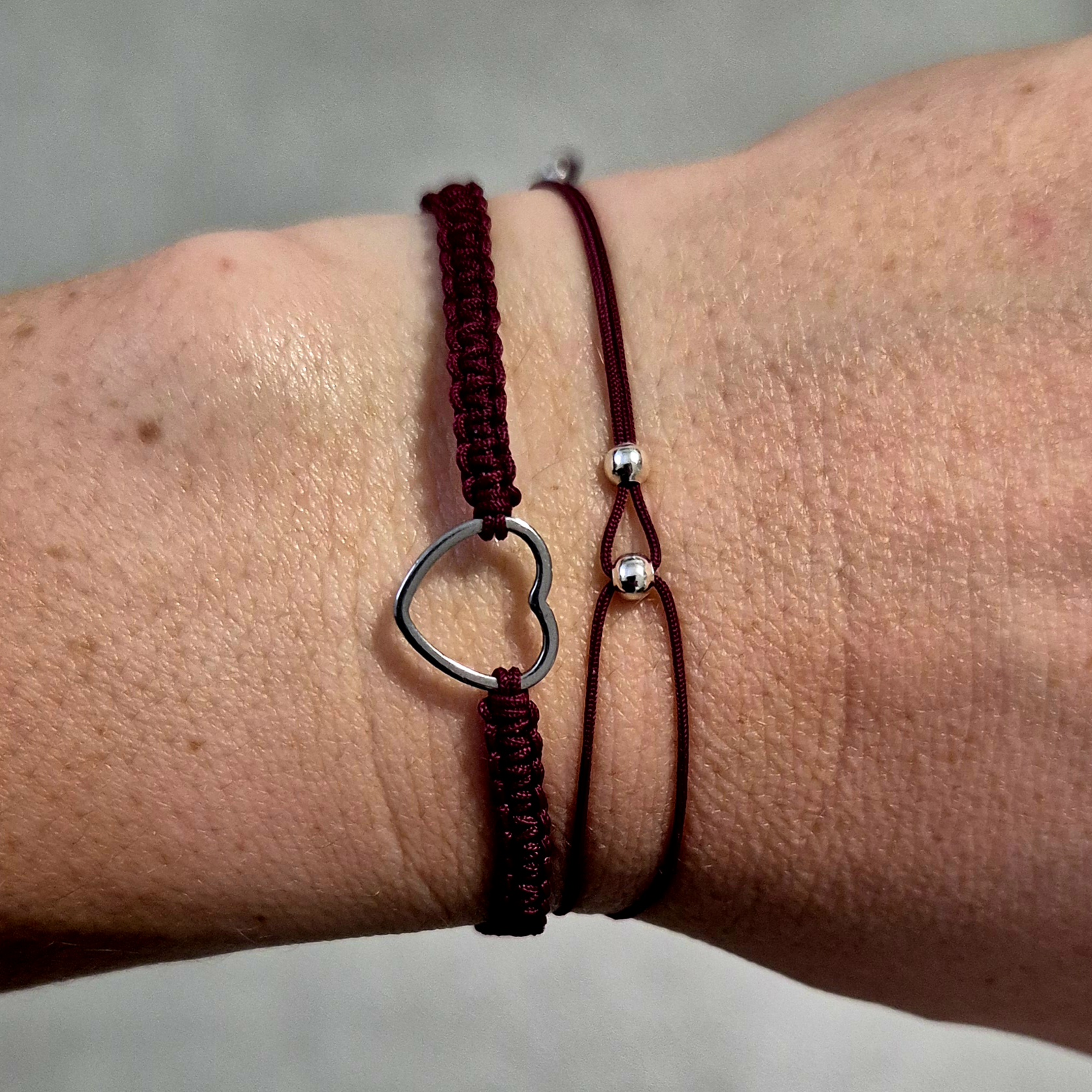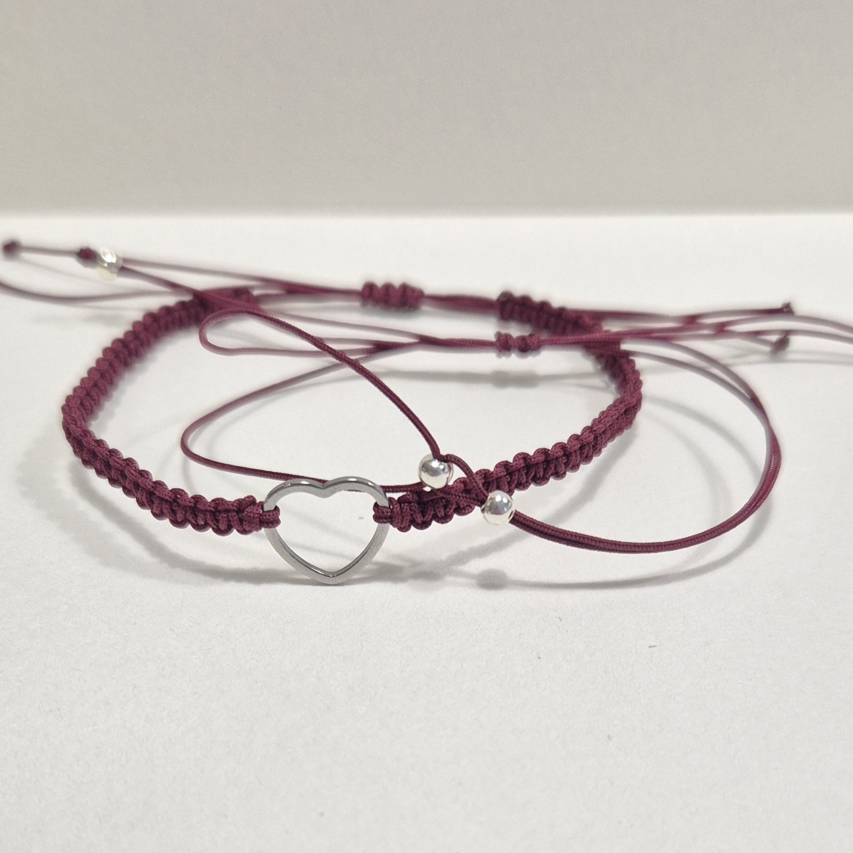 První náramek je pletený z vínové šňůrky a zdobený srdcem z nerezové oceli, které krásně vyniká v kontrastu s hlubokým odstínem vínové.