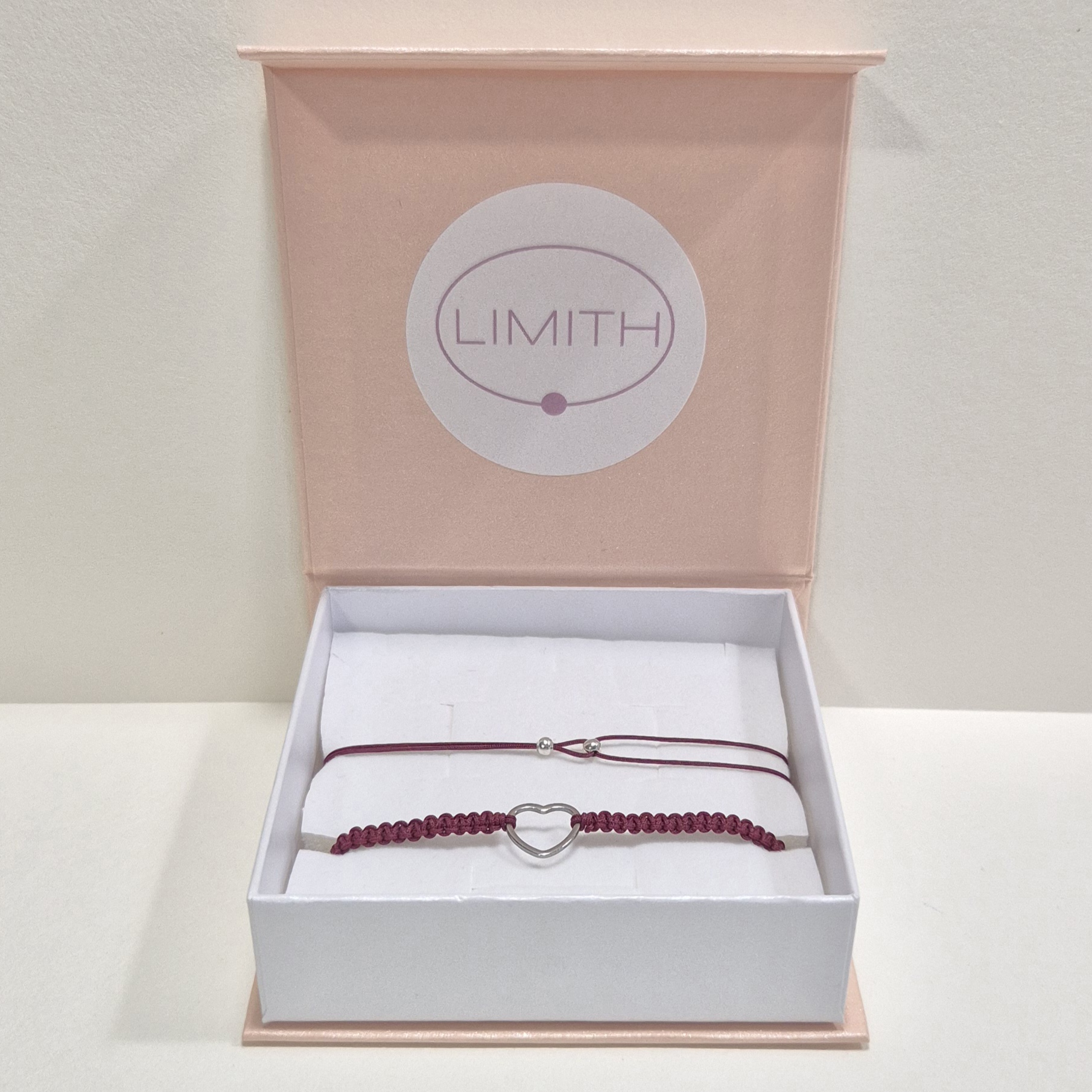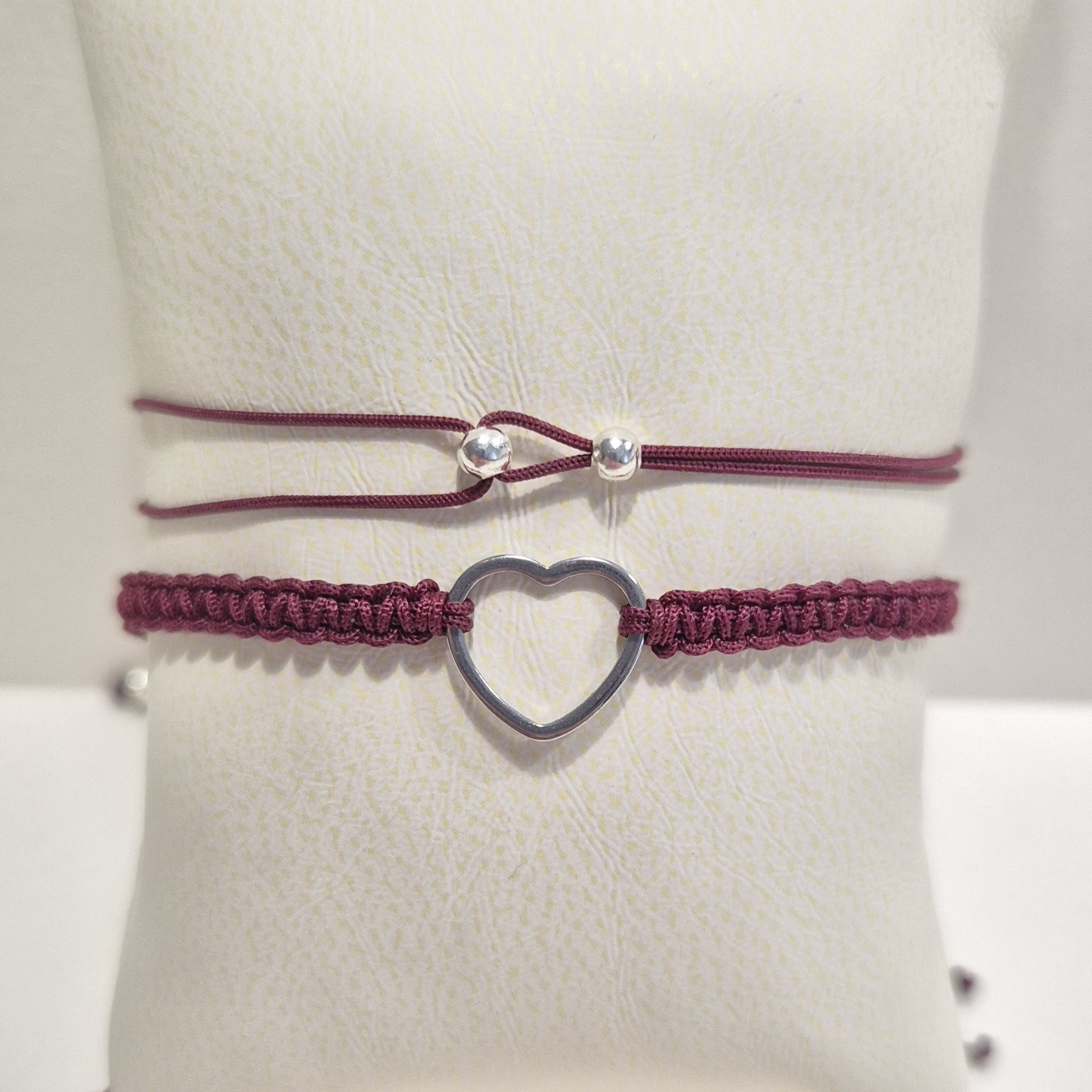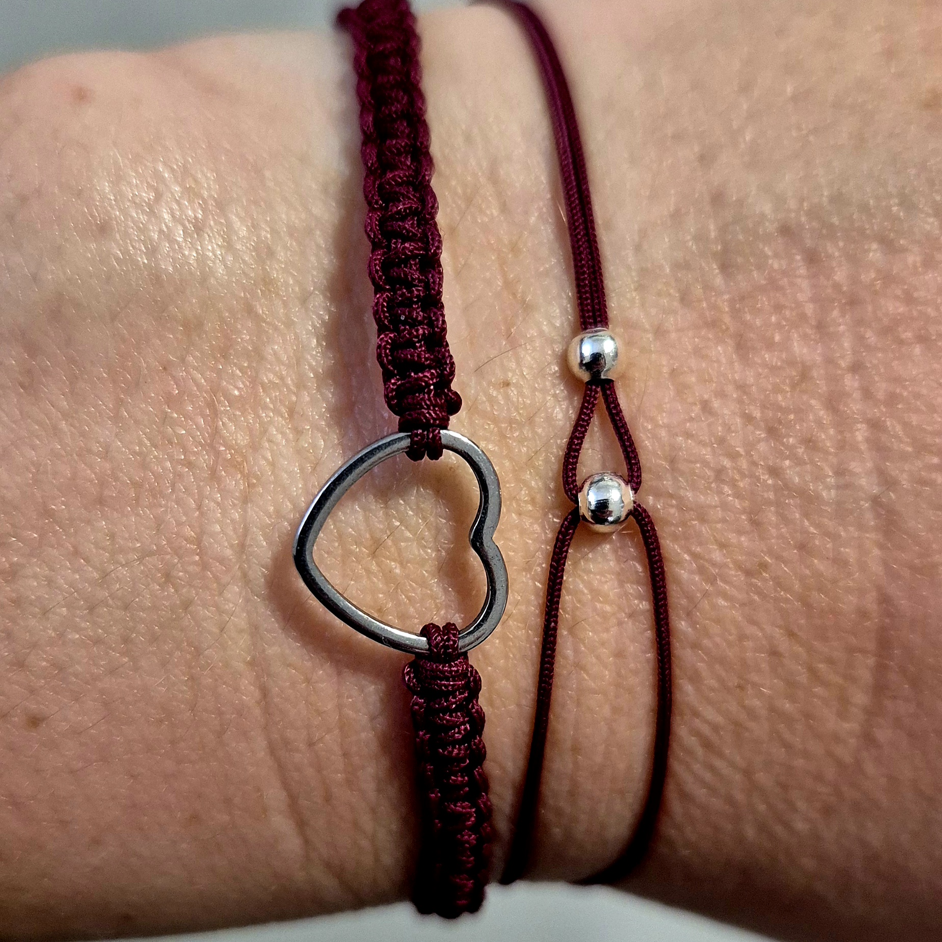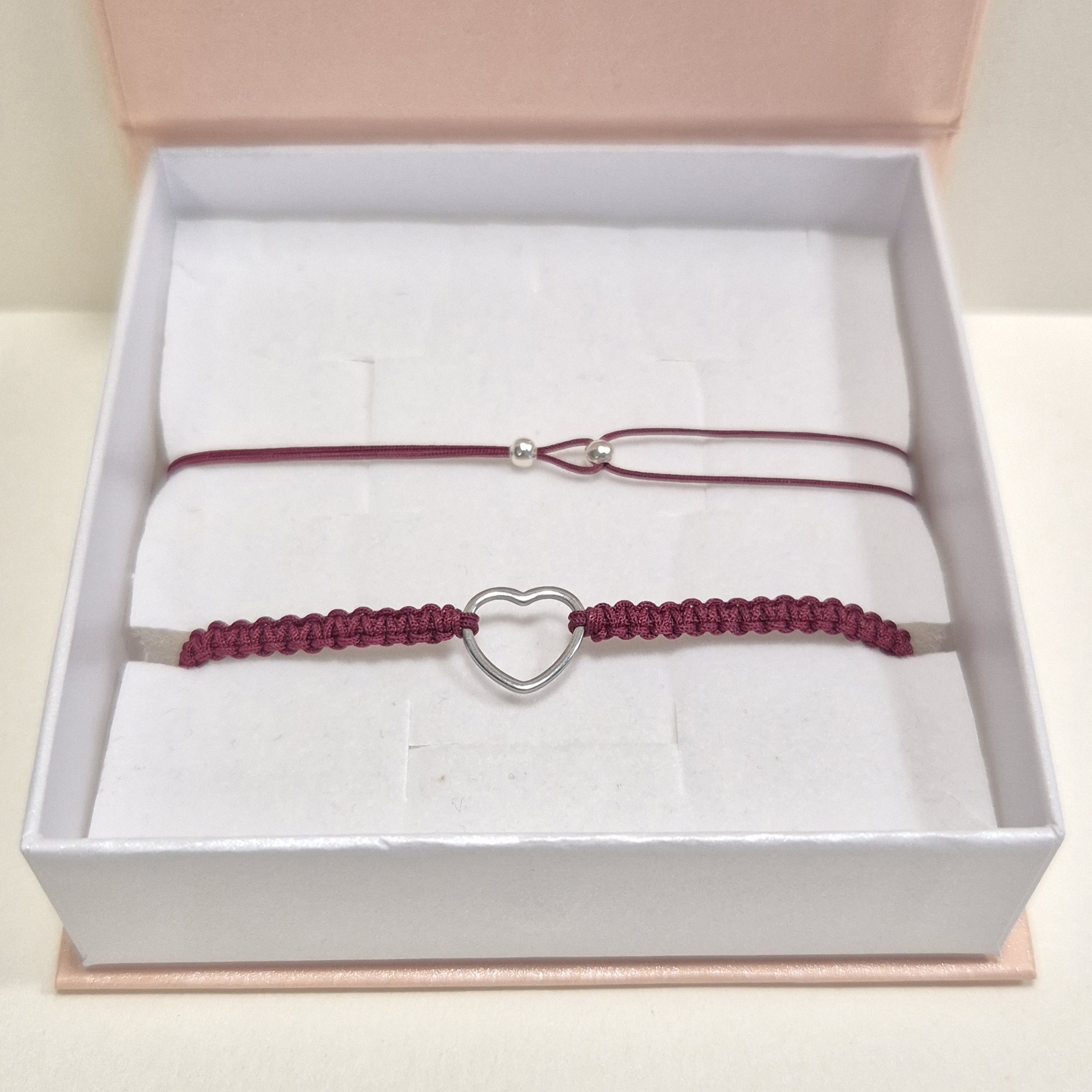 První náramek je pletený z vínové šňůrky a zdobený srdcem z nerezové oceli, které krásně vyniká v kontrastu s hlubokým odstínem vínové.