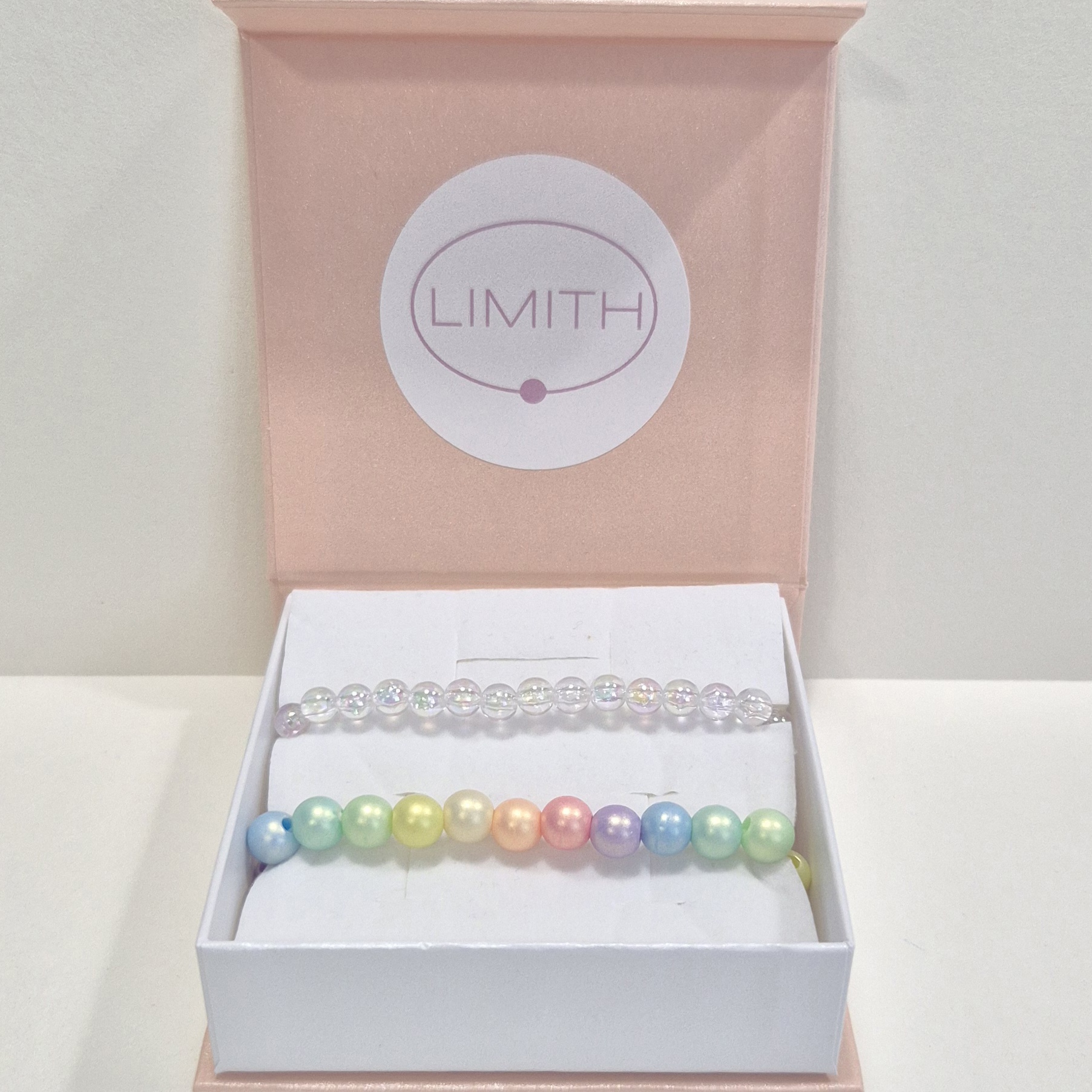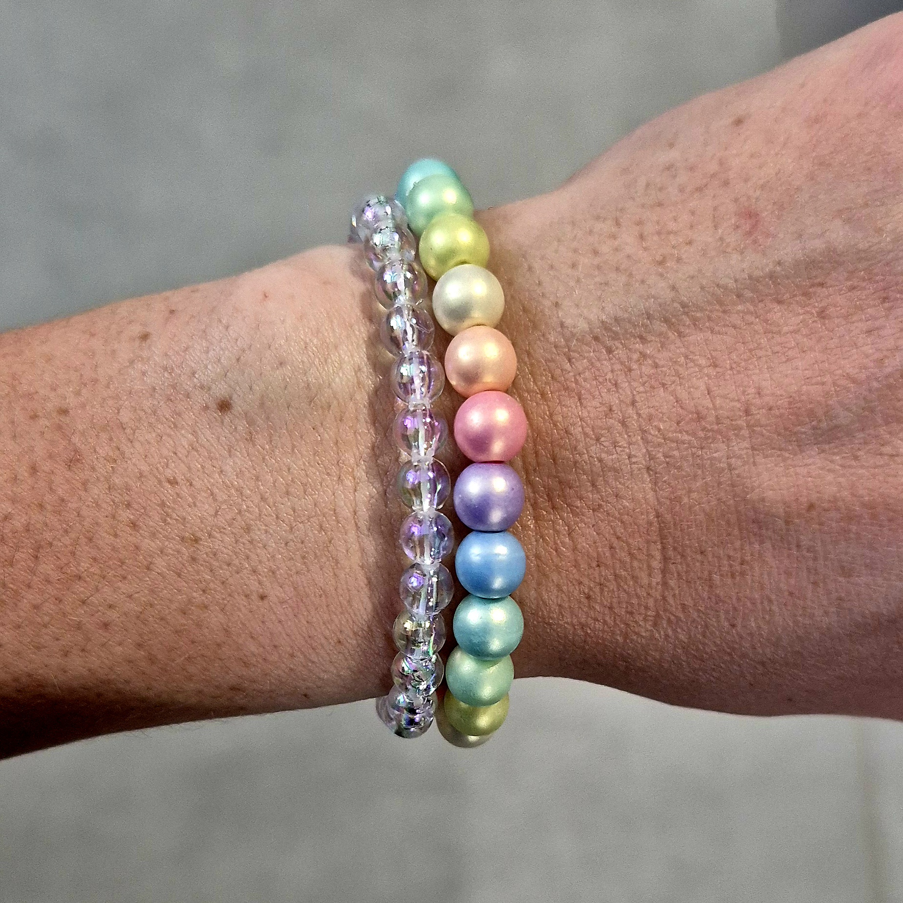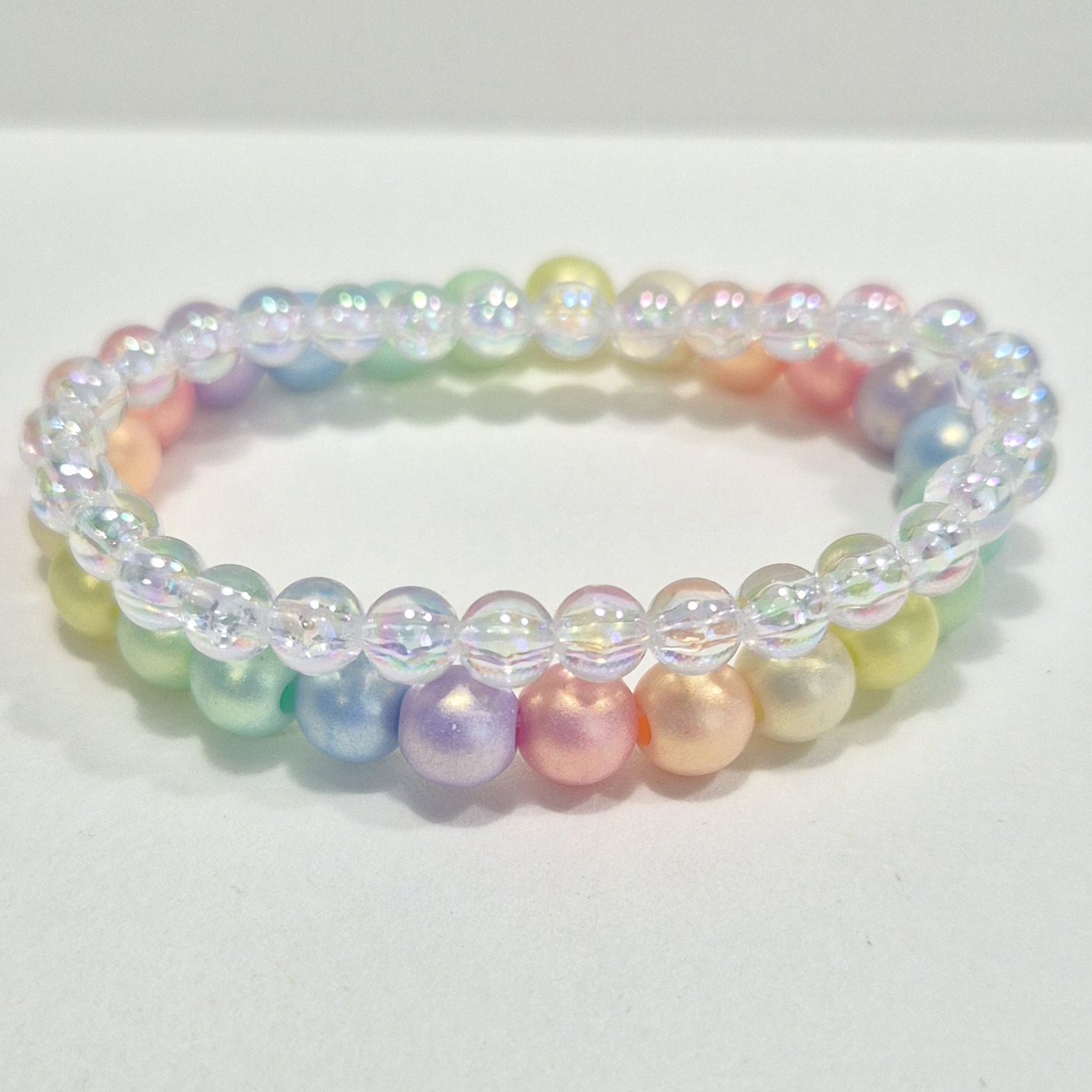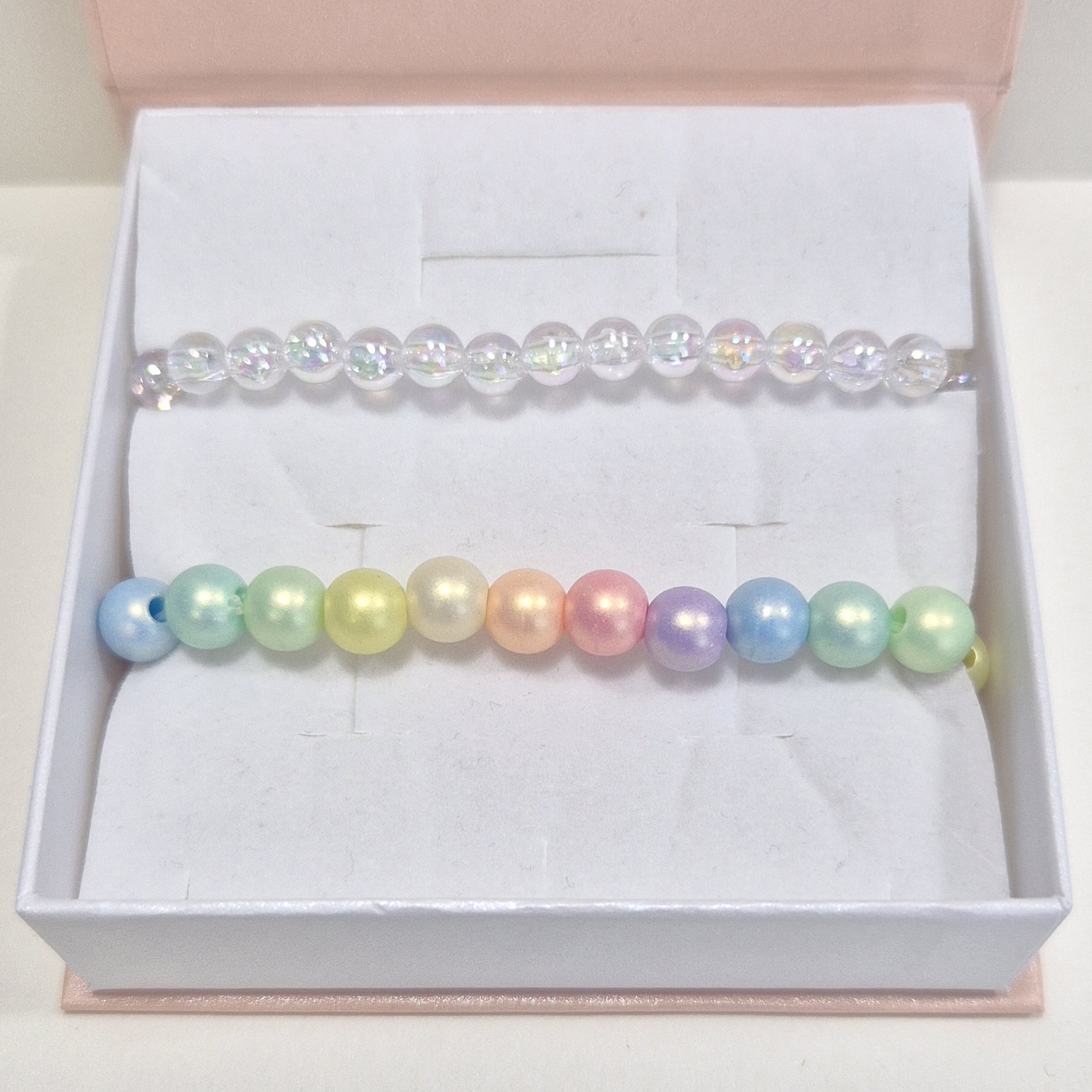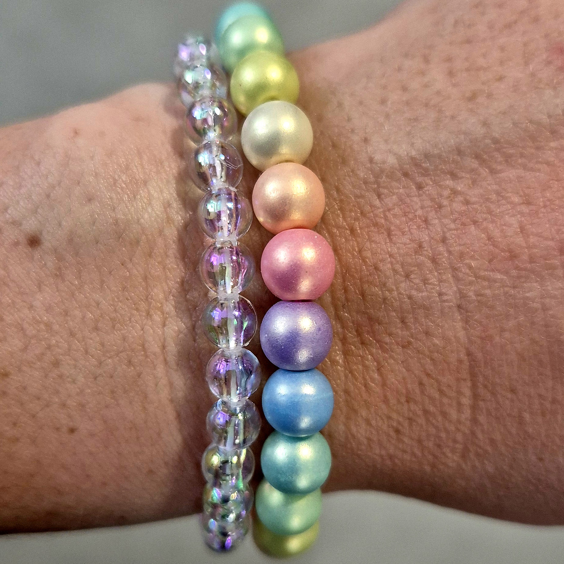 - náramek z průhledných akrylových korálků s barevnými odlesky.