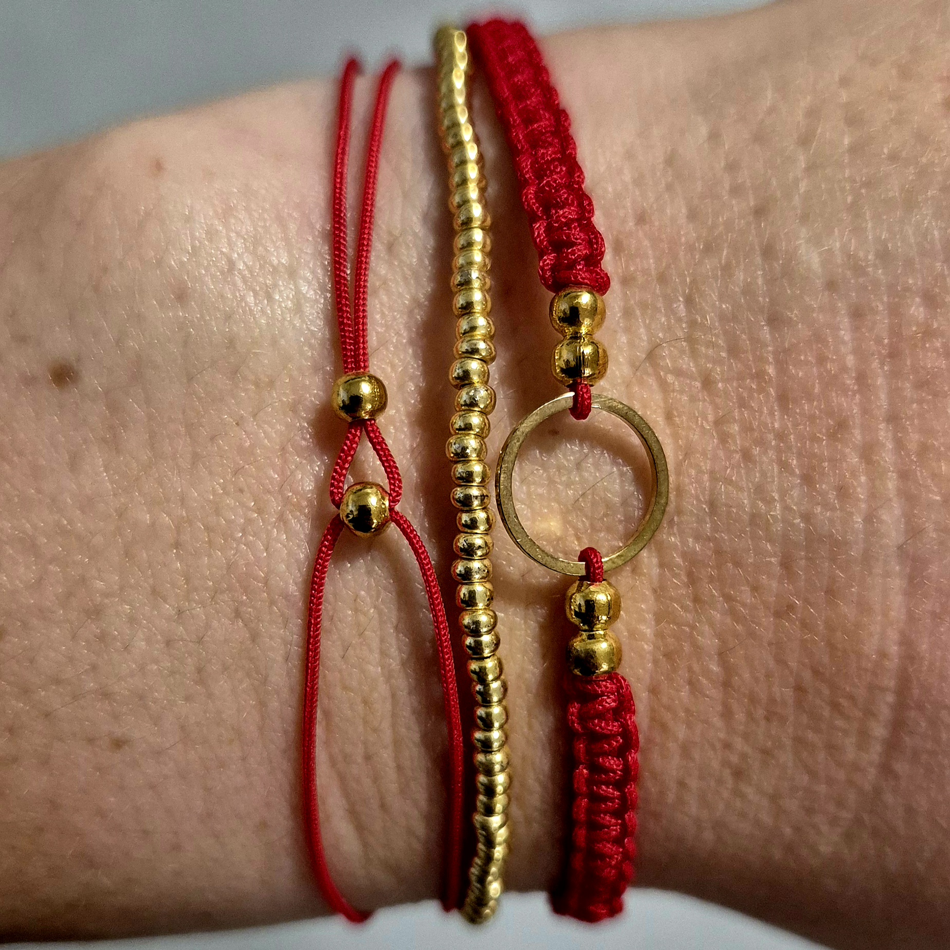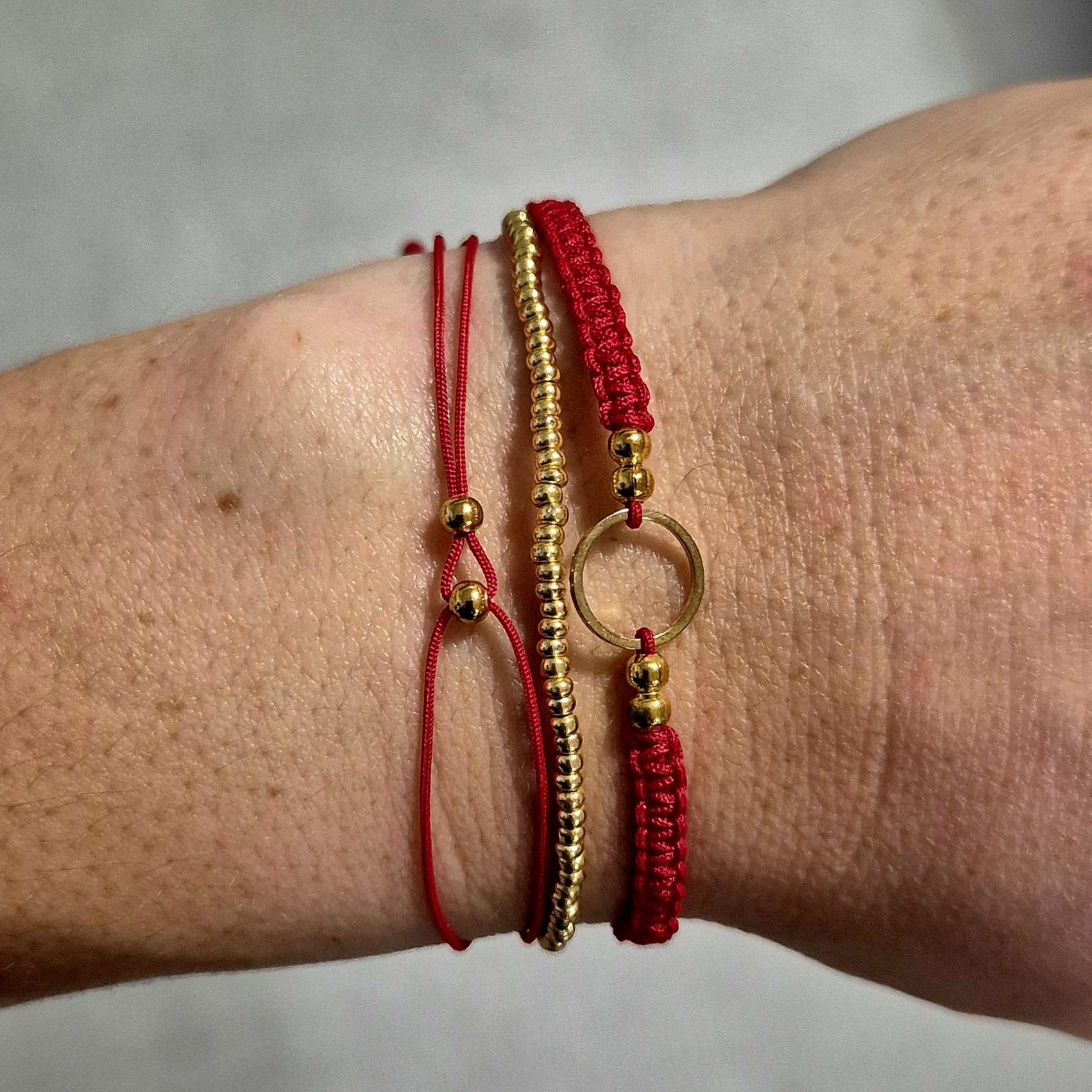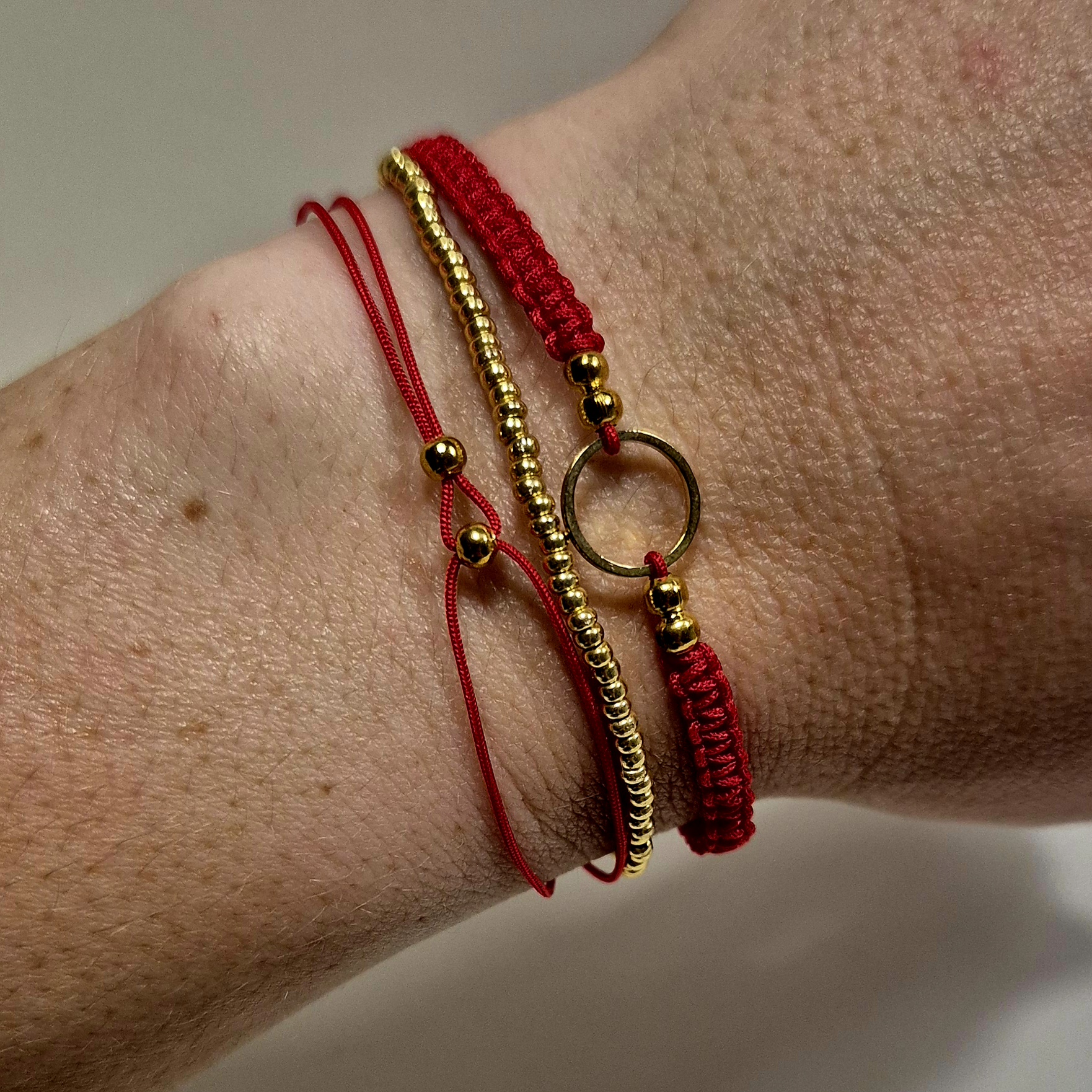Šňůrkový náramek v sytě červené barvě doplňují dva zlaté korálky pro dokonale sladěný celek.