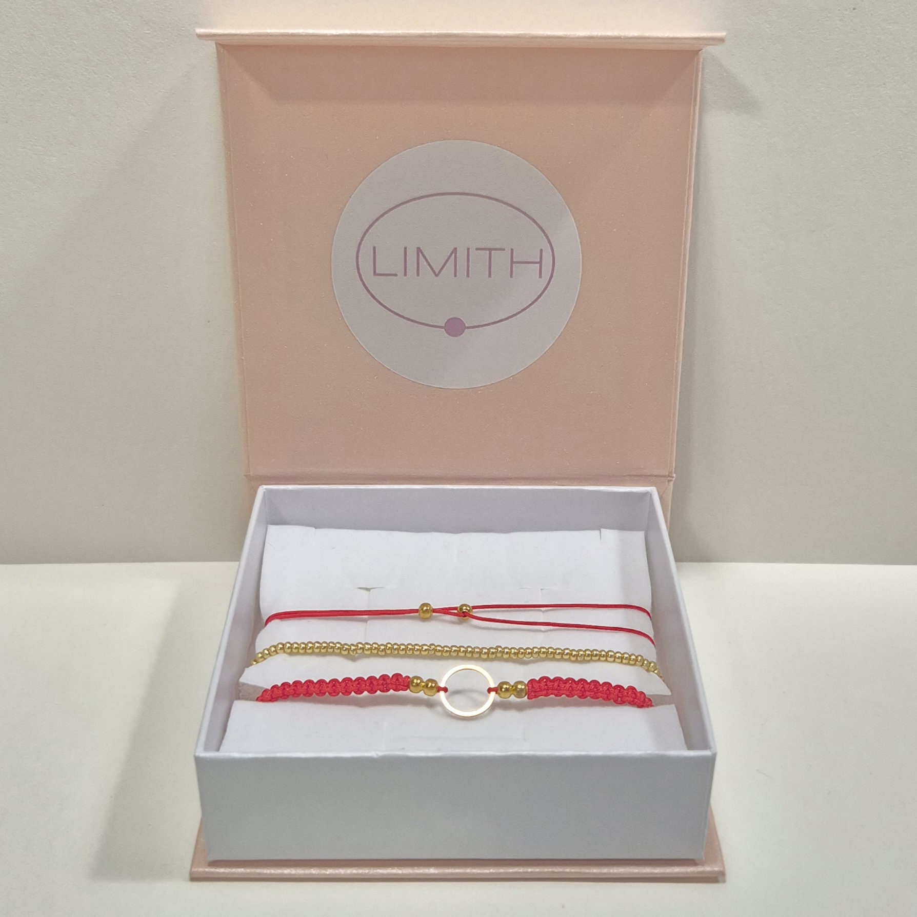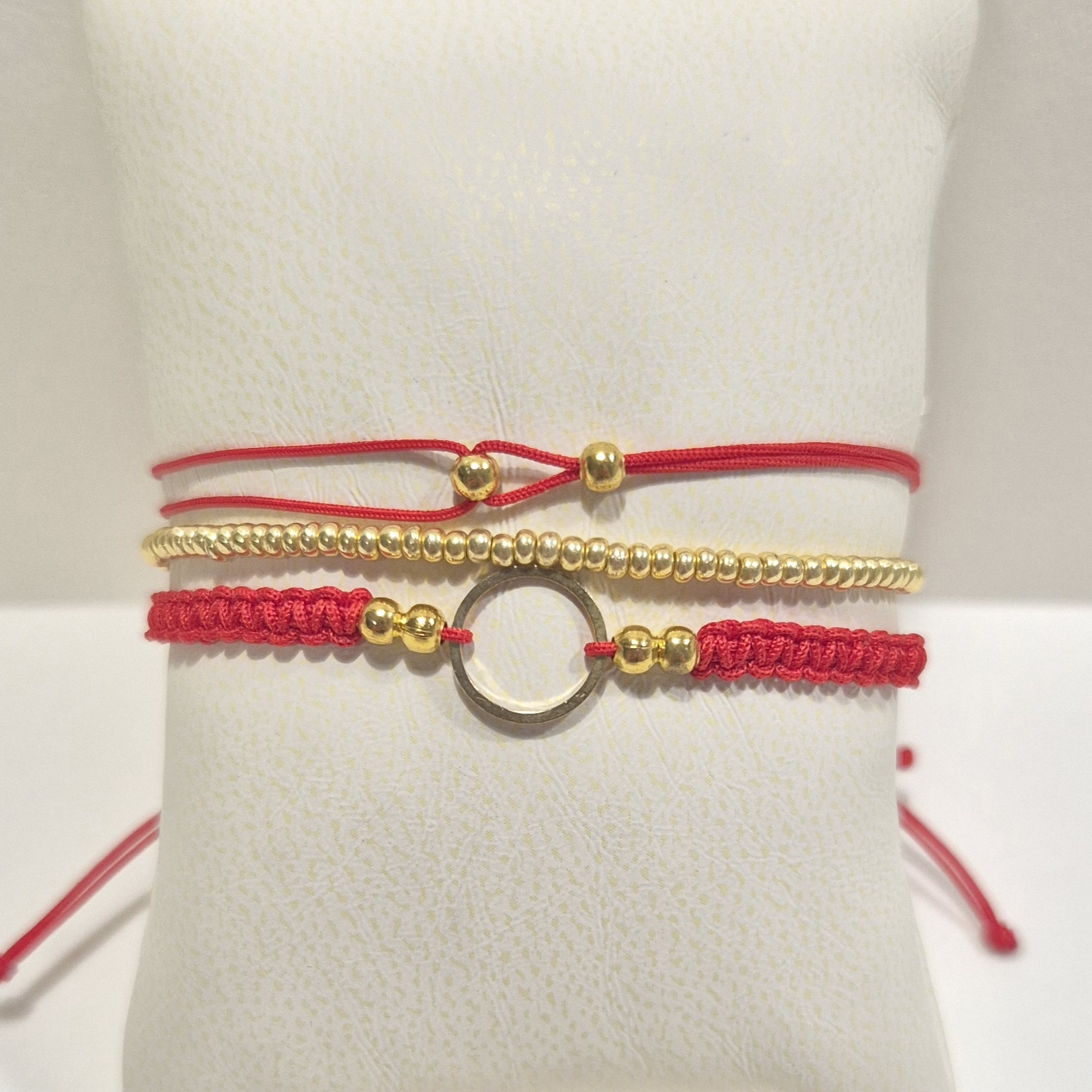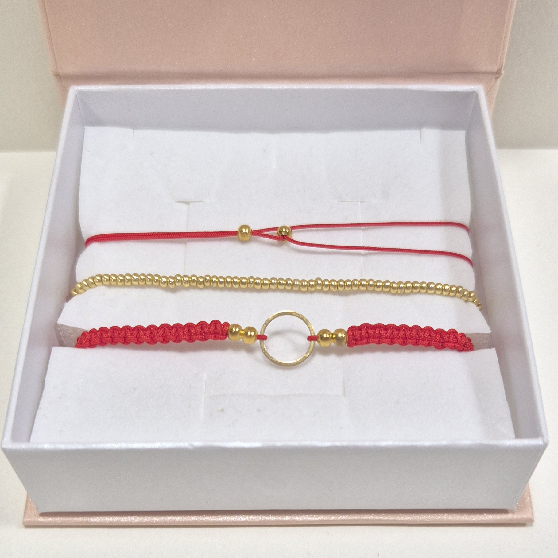 Šňůrkový náramek v sytě červené barvě doplňují dva zlaté korálky pro dokonale sladěný celek.