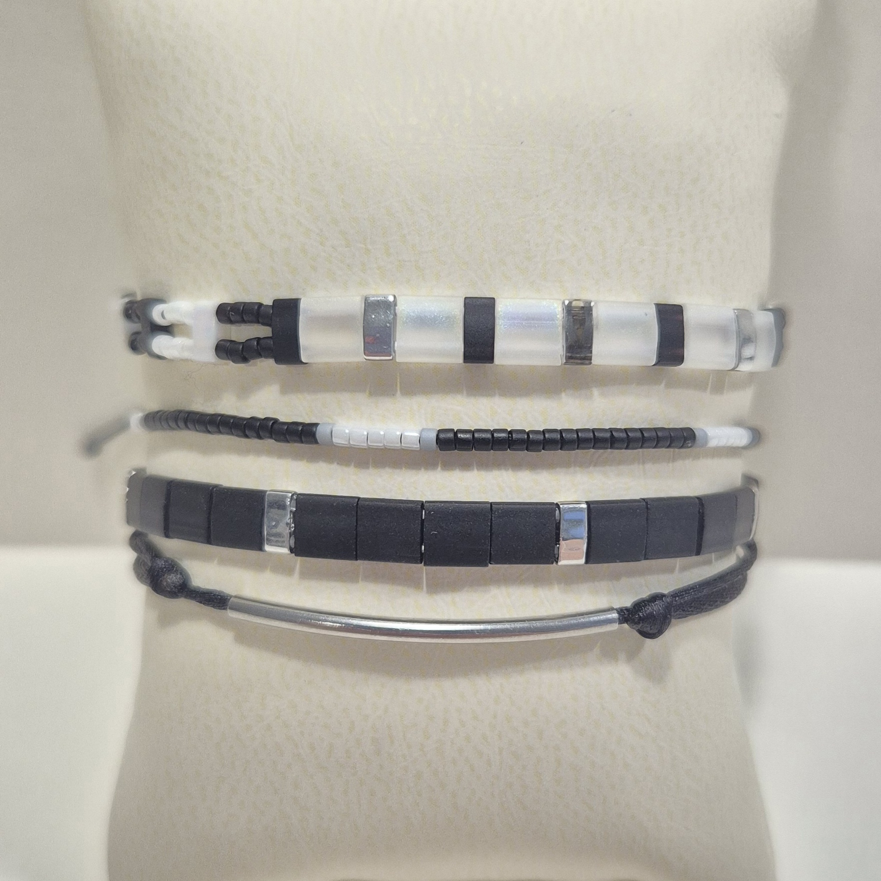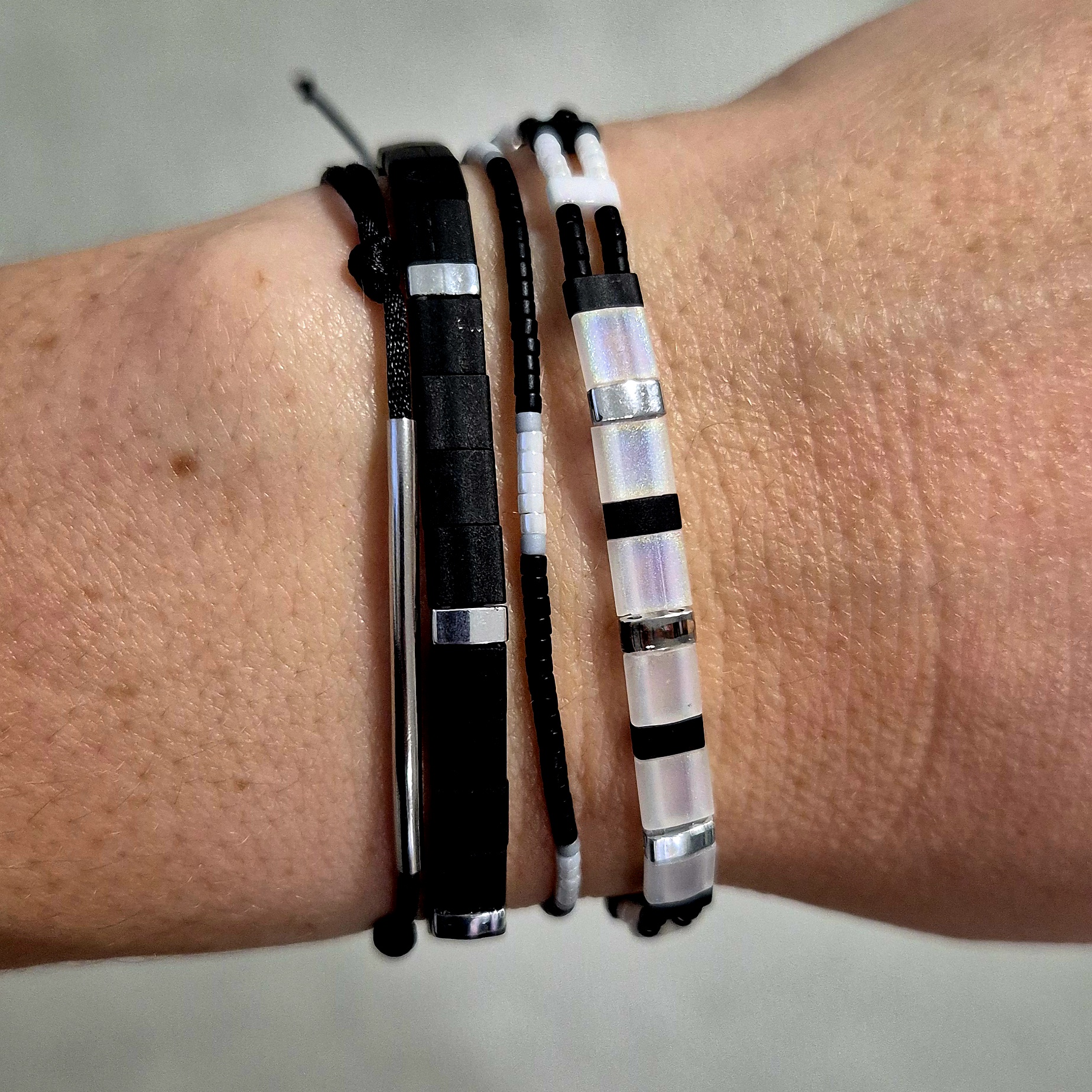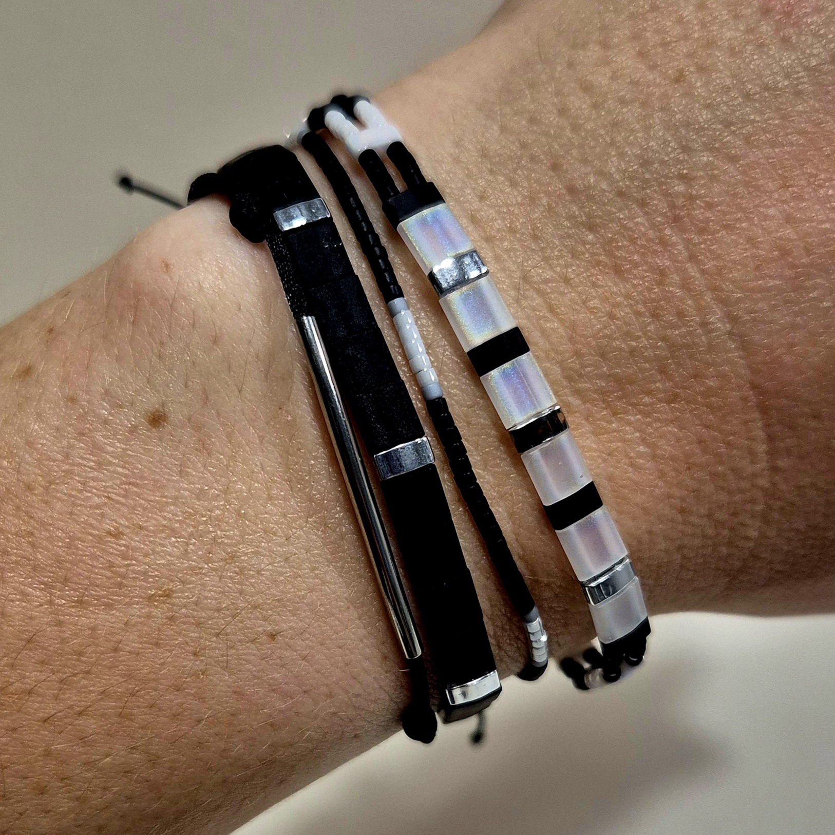 Třetí náramek je z plochých korálků Miyuki v černo-stříbrném provedení, které působí elegantně a minimalisticky.