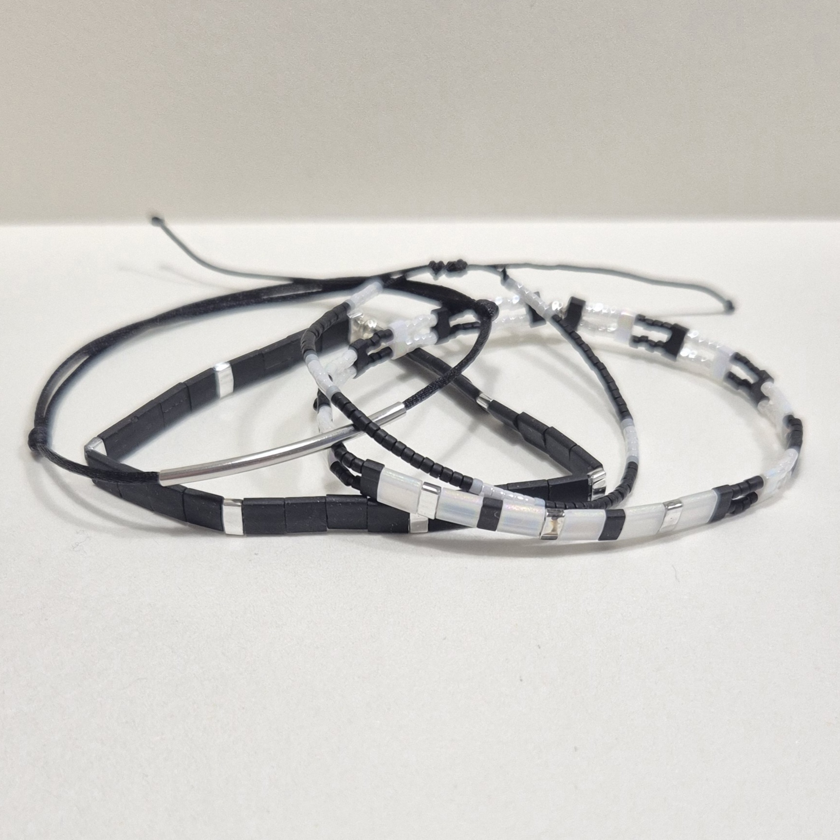 Druhý náramek tvoří drobné korálky Miyuki v černé a bílé barvě, navlečené na pevné polyesterové šňůrce.