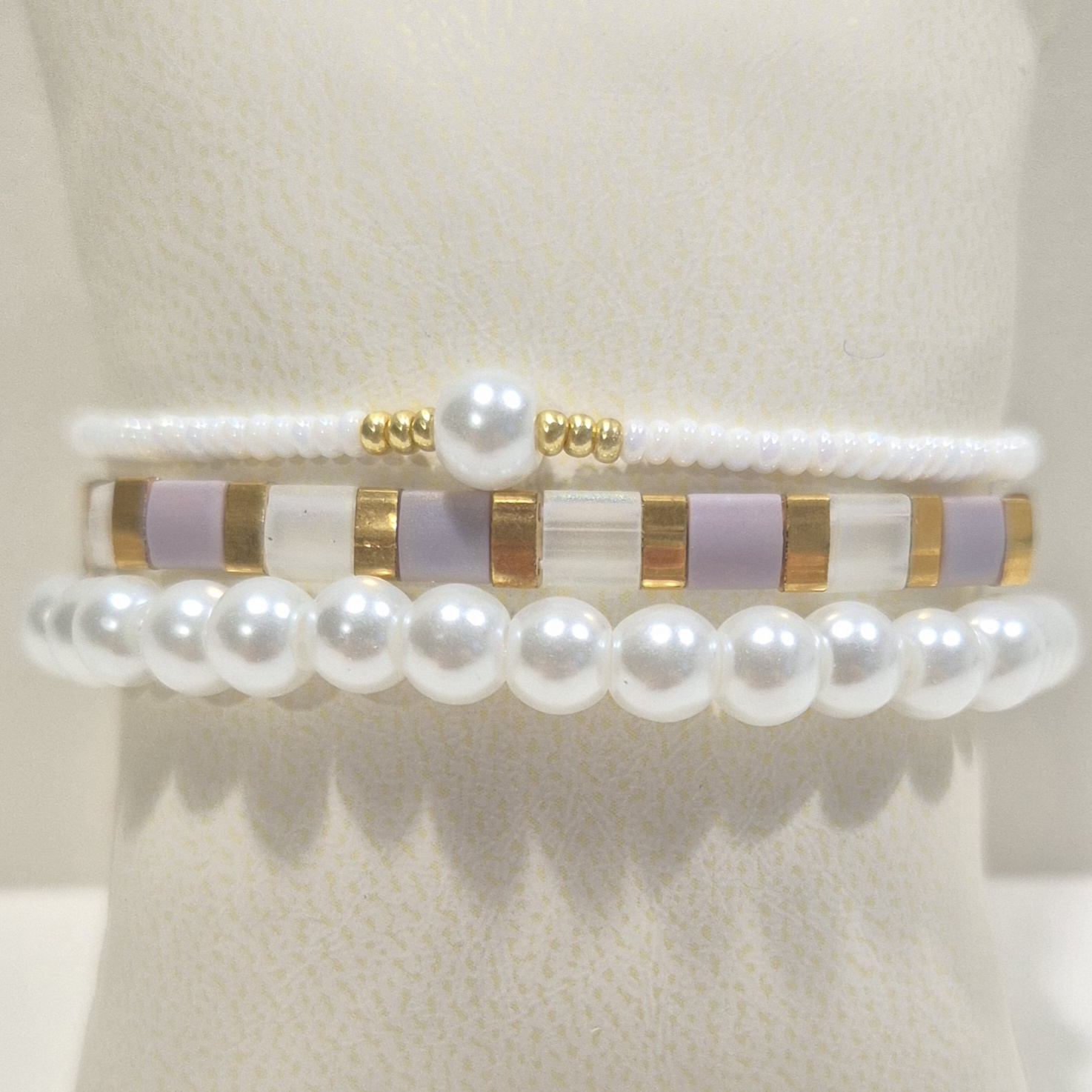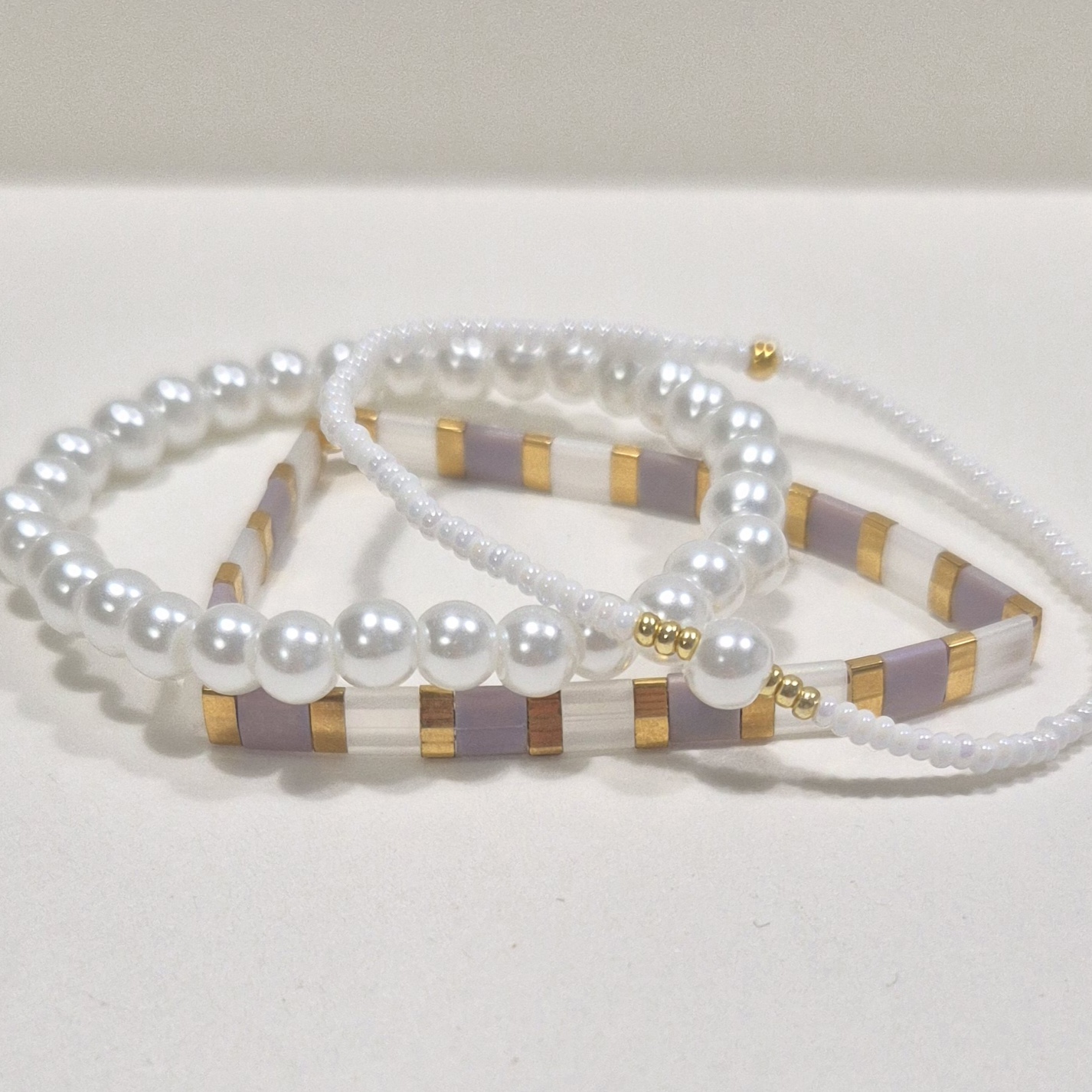 Třetí náramek je na gumičce z jemných bílých korálků, ozdobený jedním větším bílým korálkem a drobnými zlatými detaily, které celý set krásně propojují.