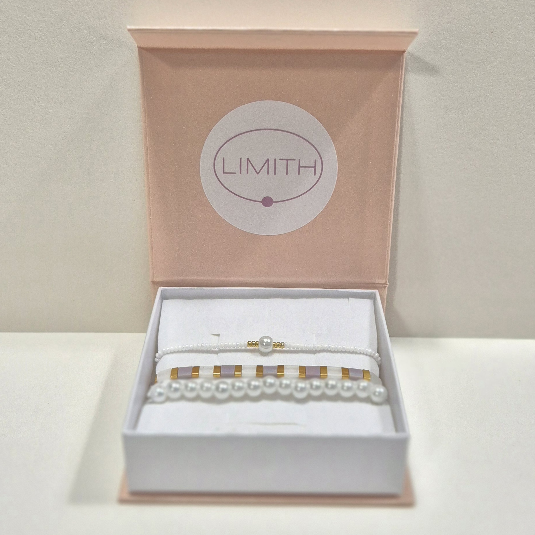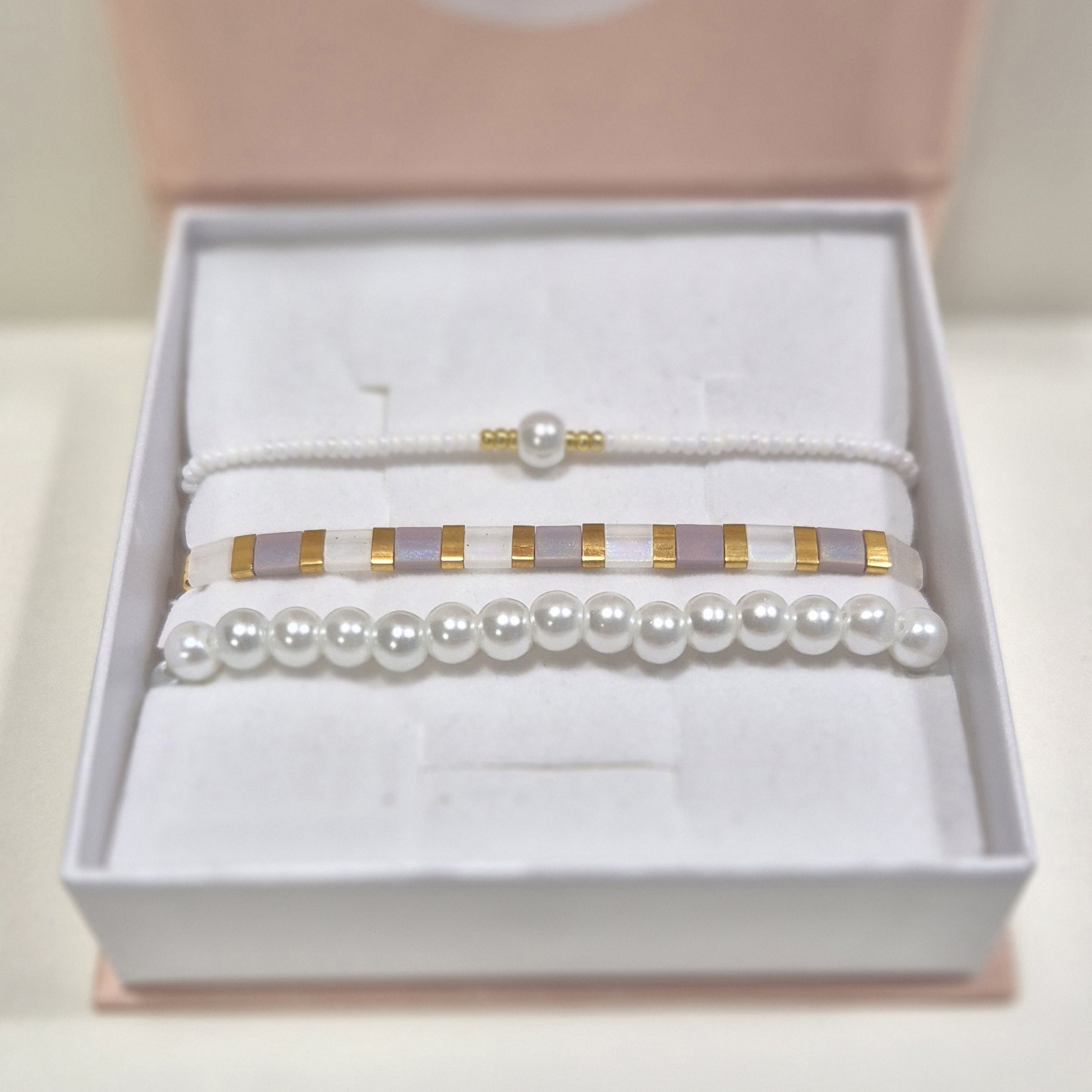 První náramek je tvořen plochými korálky Miyuki, které září v bílé, růžové a zlaté barvě – moderní a přitom něžný doplněk pro každý den.