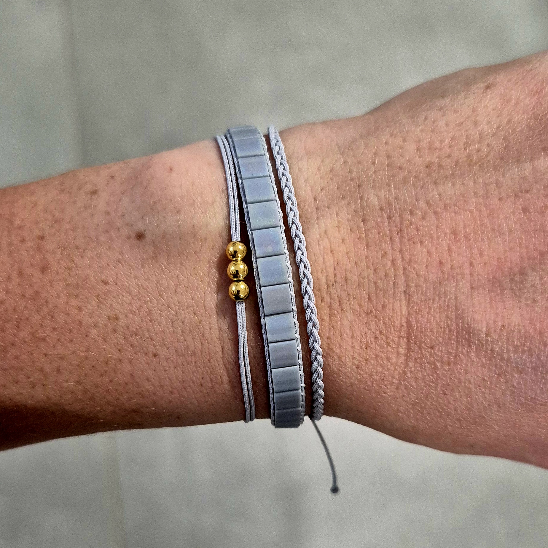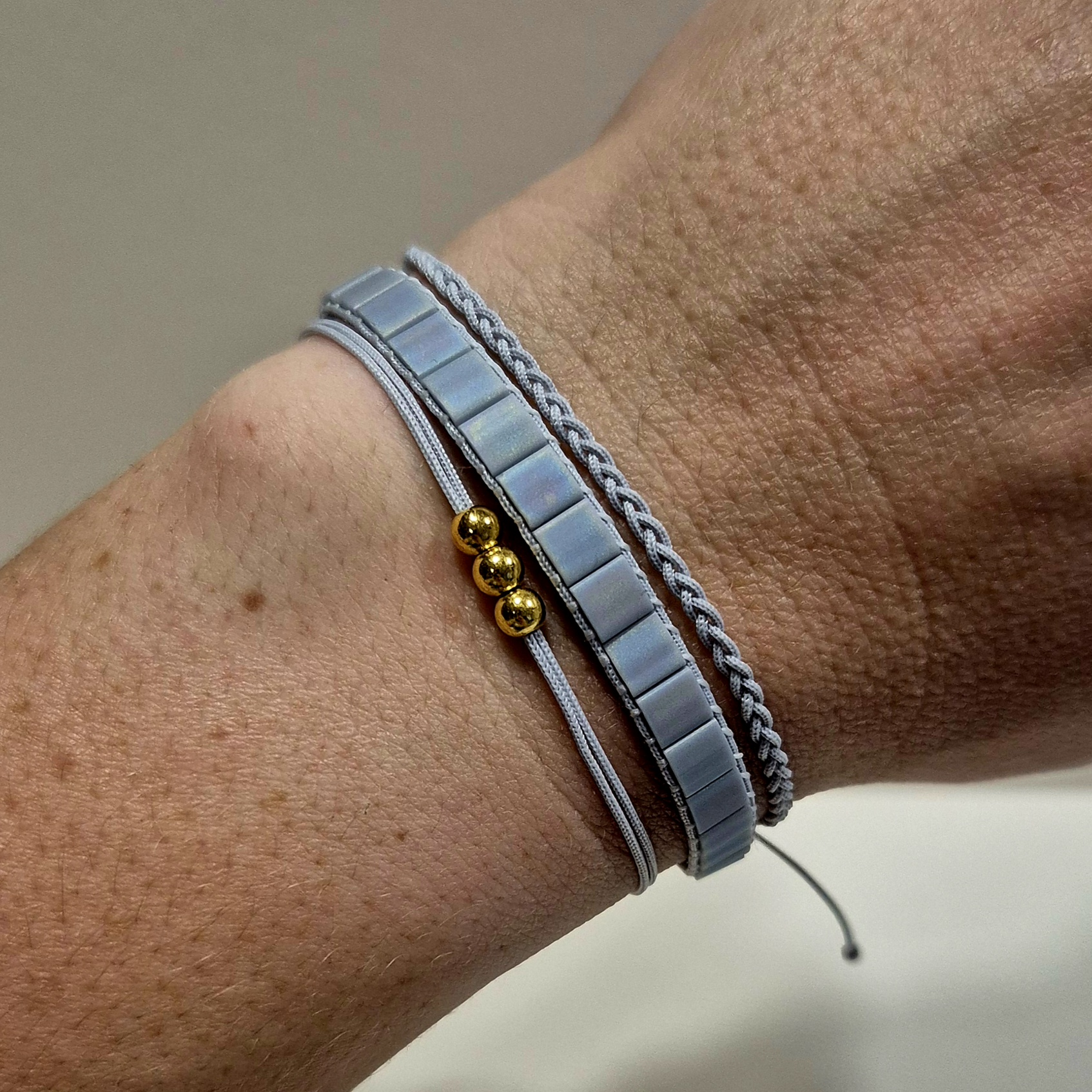 Tkáný náramek z plochých korálků Miyuki v šedých odstínech dodá setu strukturu a originalitu.