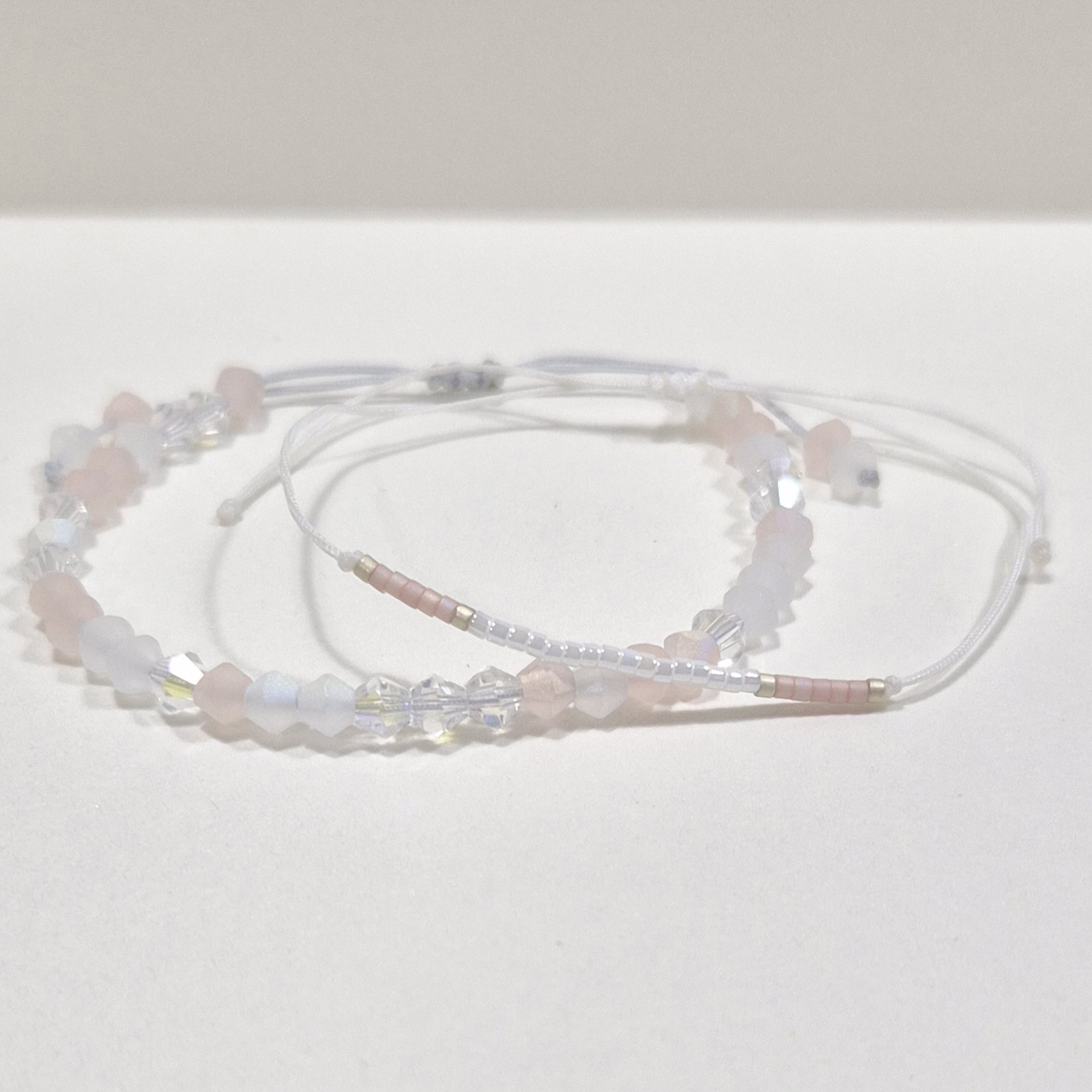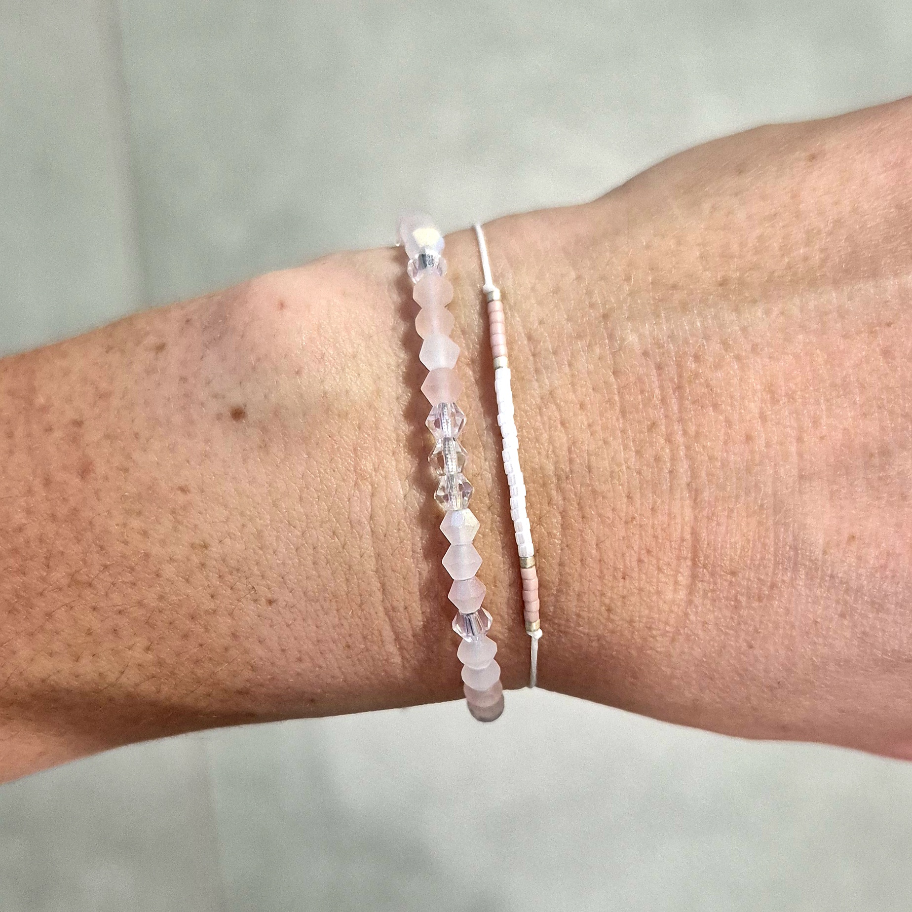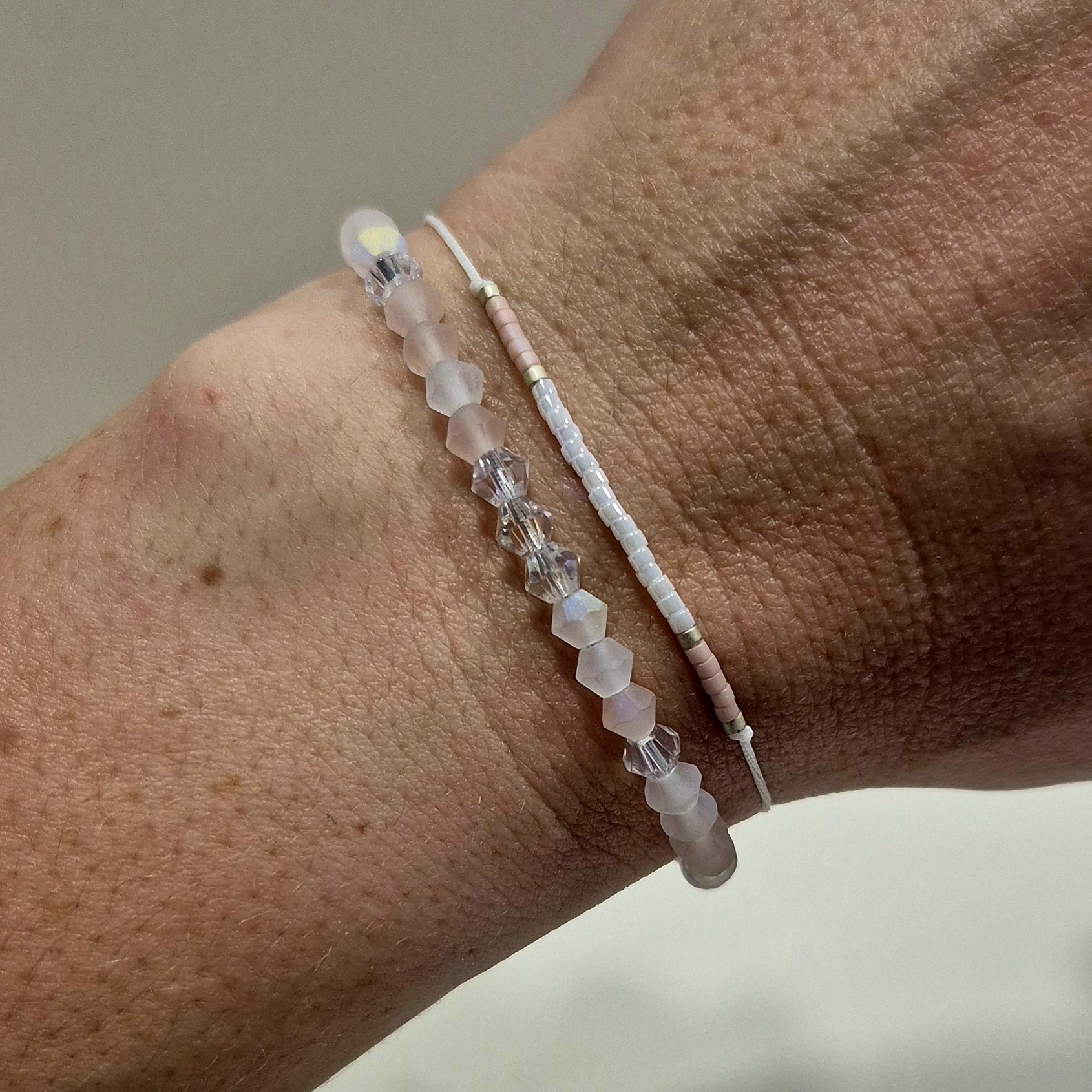 První náramek je zdobený broušenými korálky v bíléa růžové barvě.